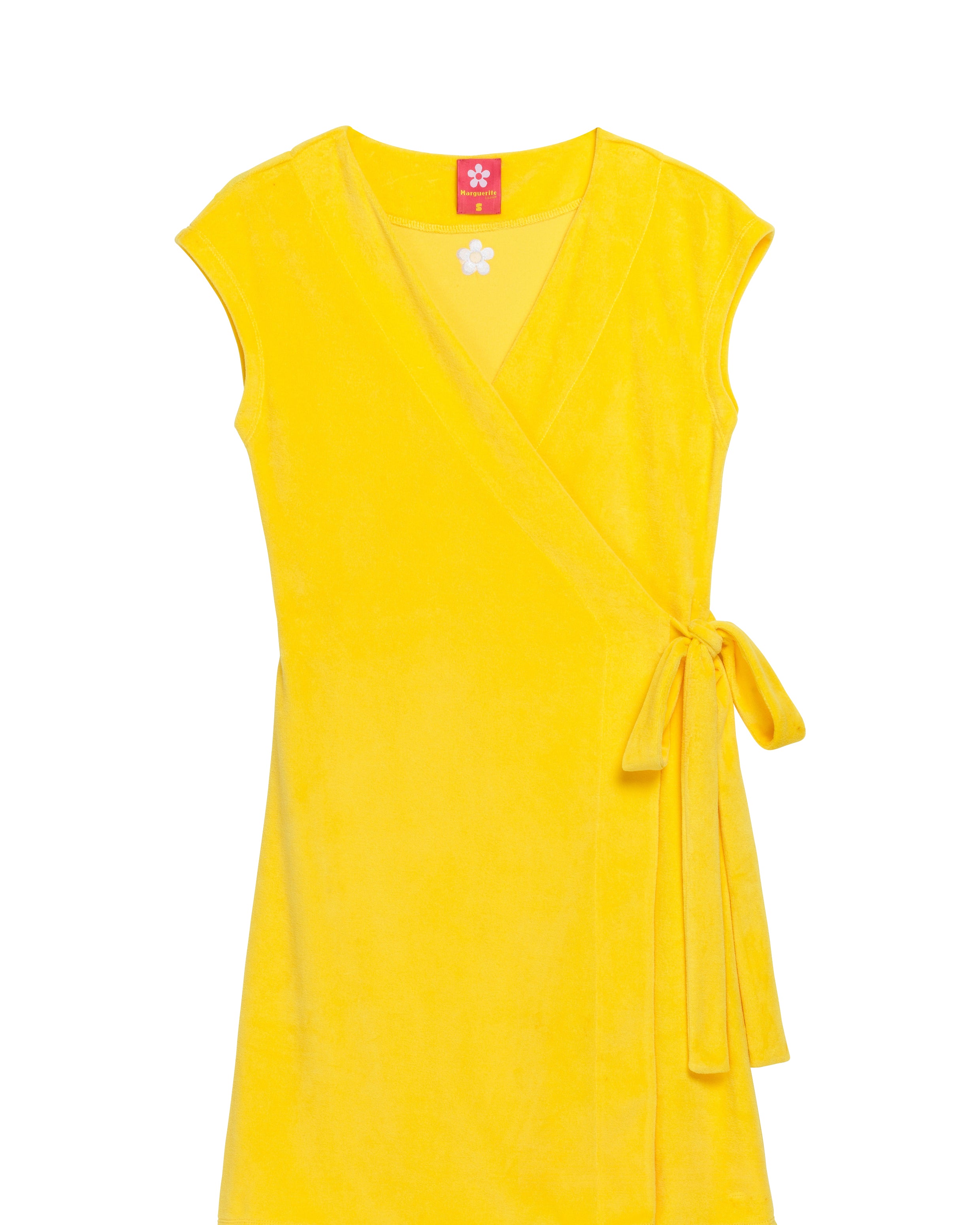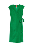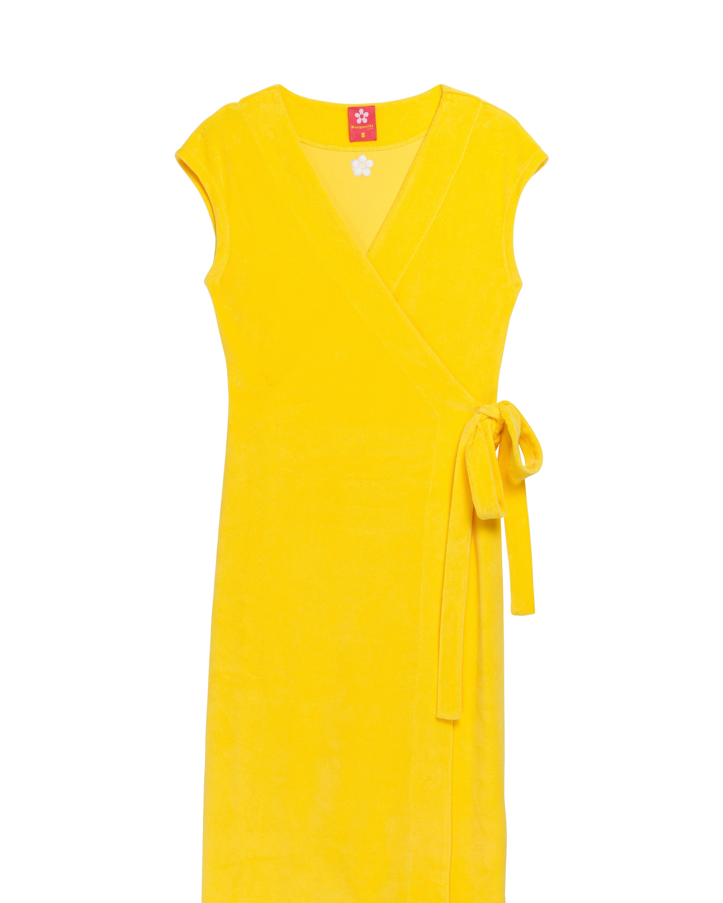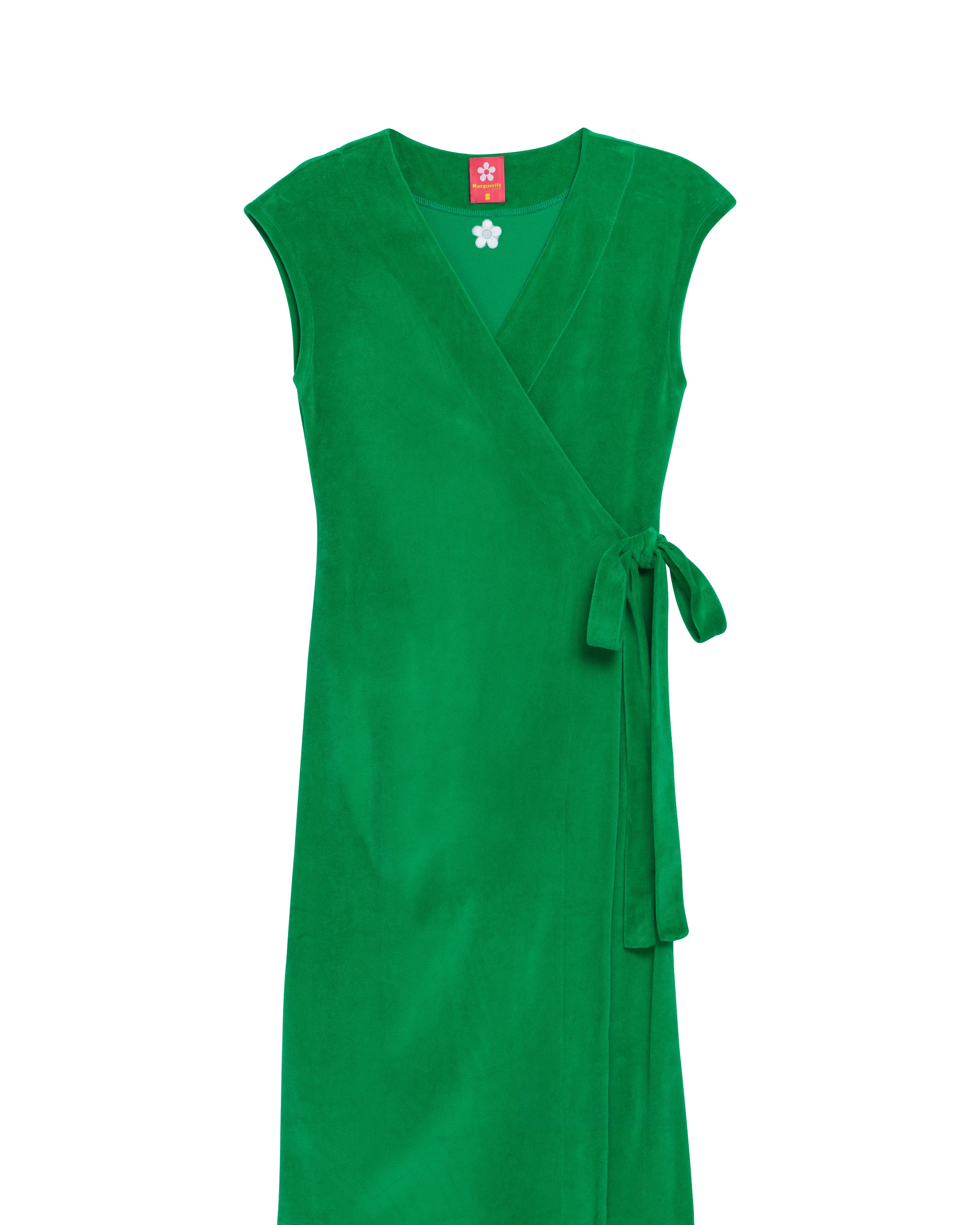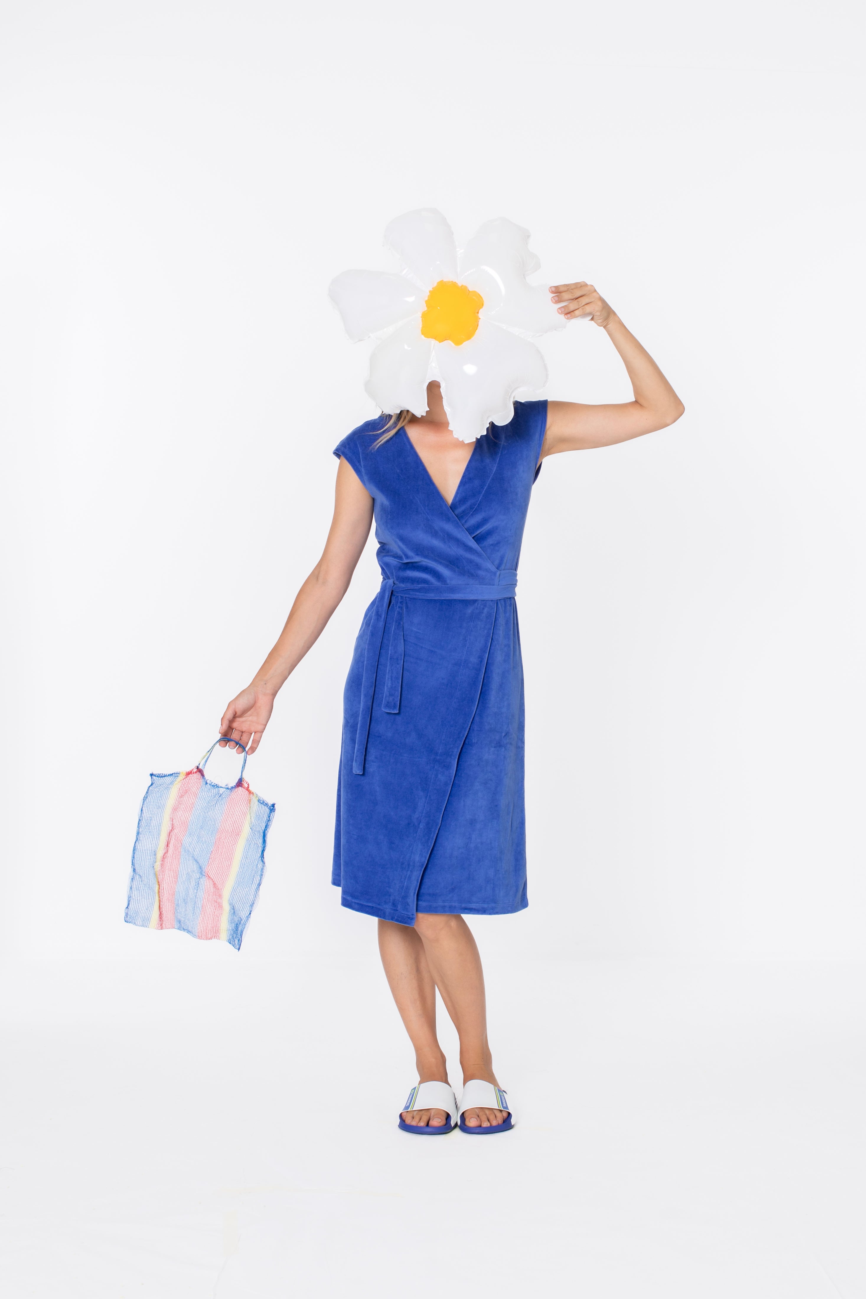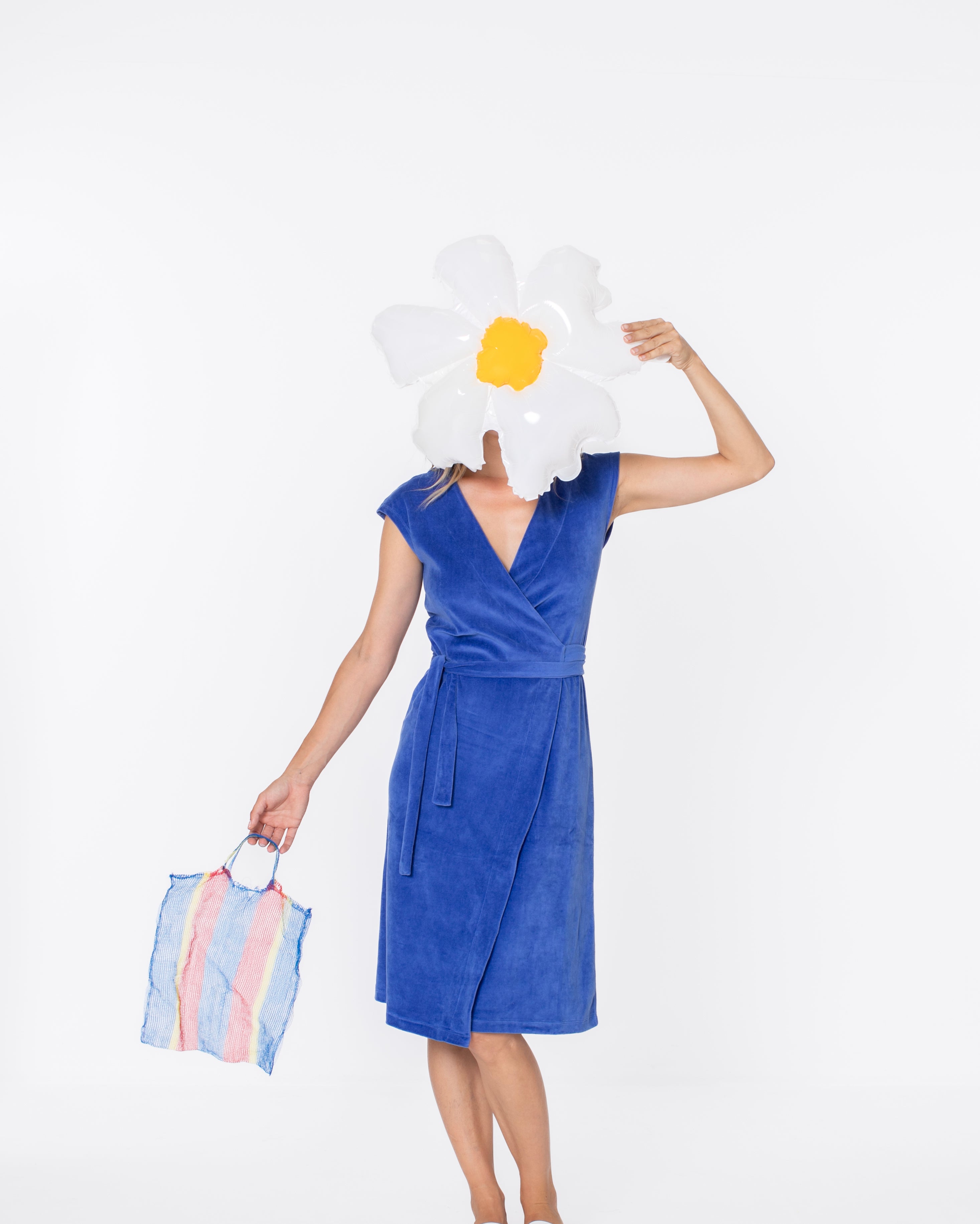 Robe Alassio, sizing regular, longue, portefeuille, décolleté en V, se noue à la taille, couleur unie, fleur marguerite brodée dans le dos.