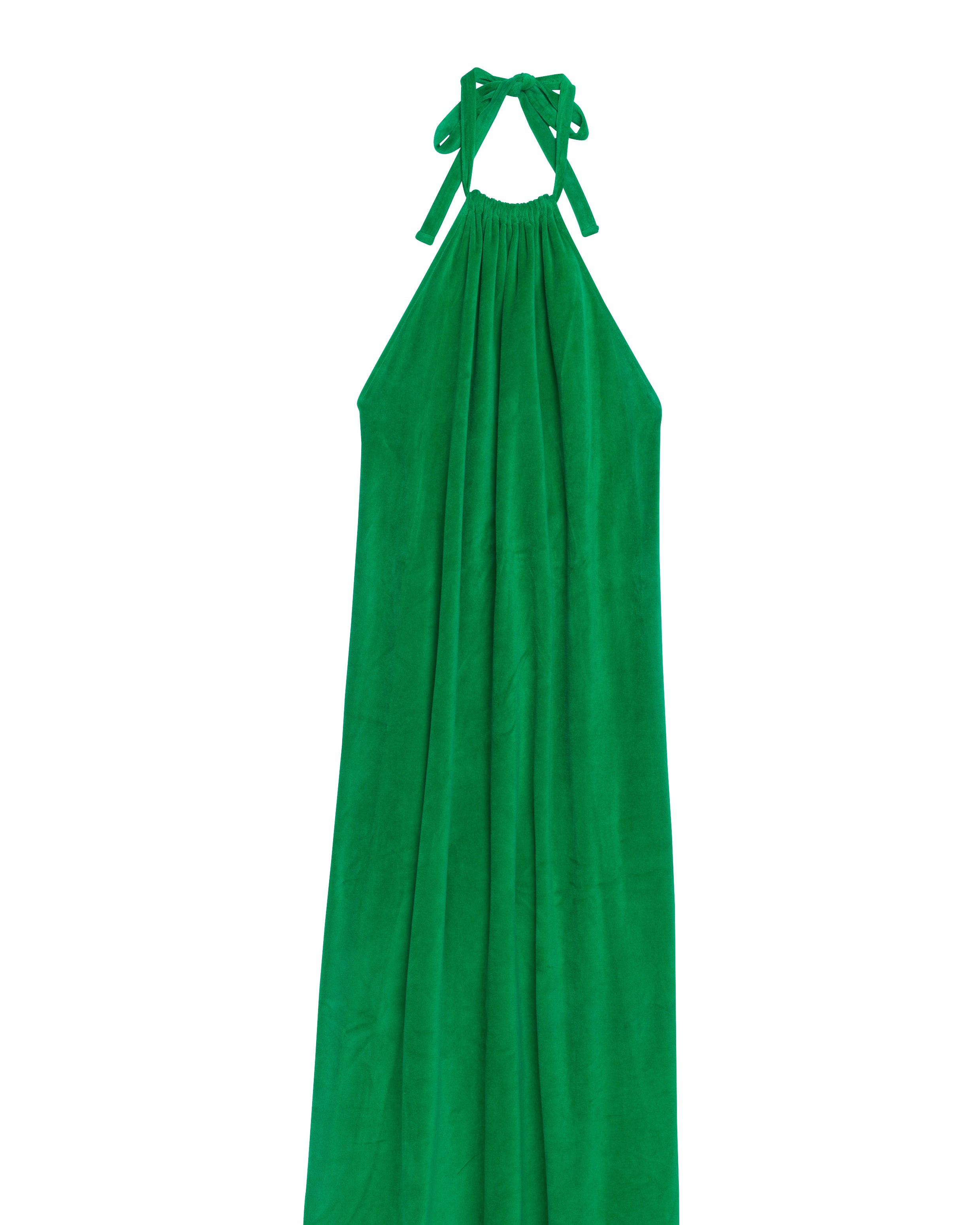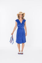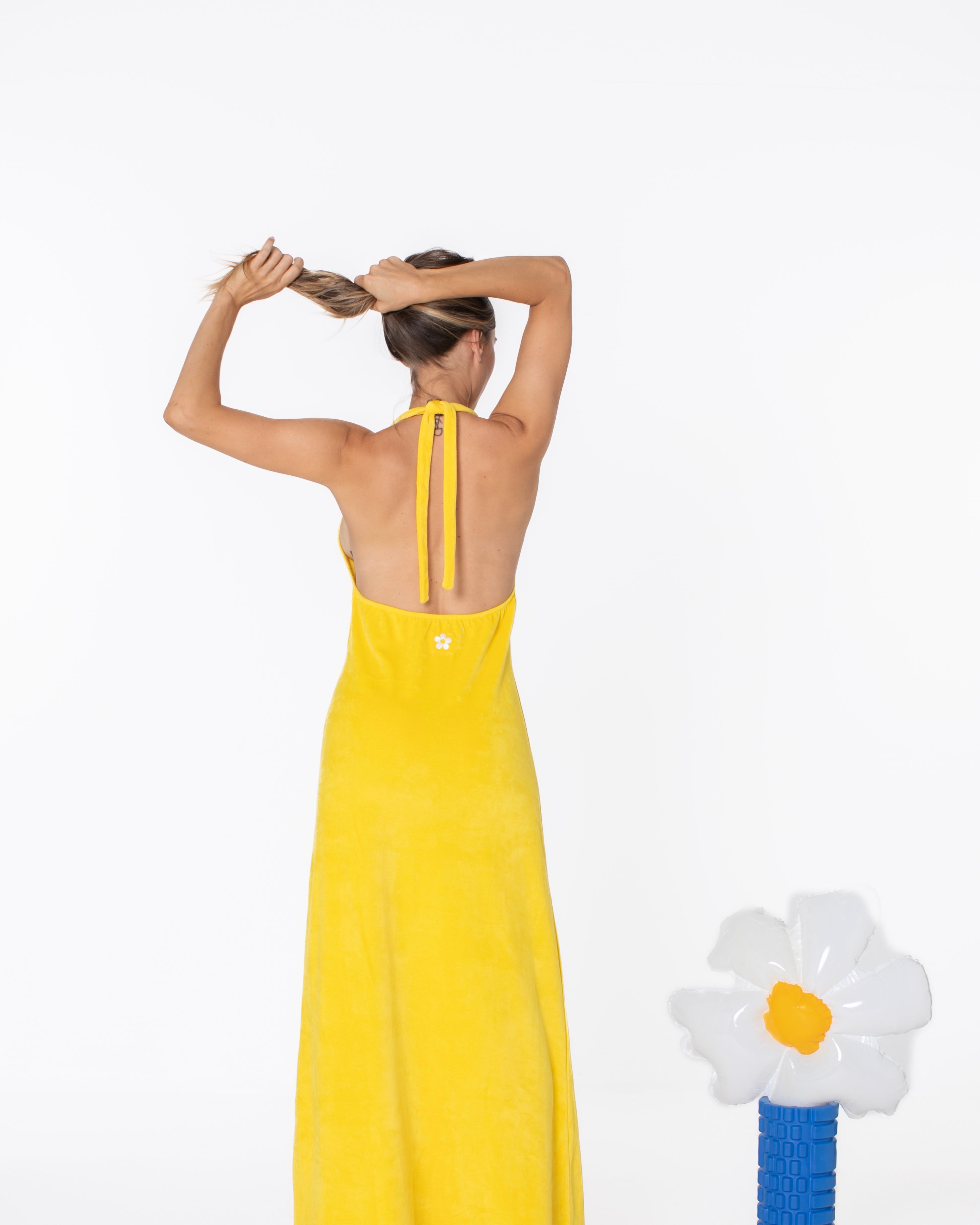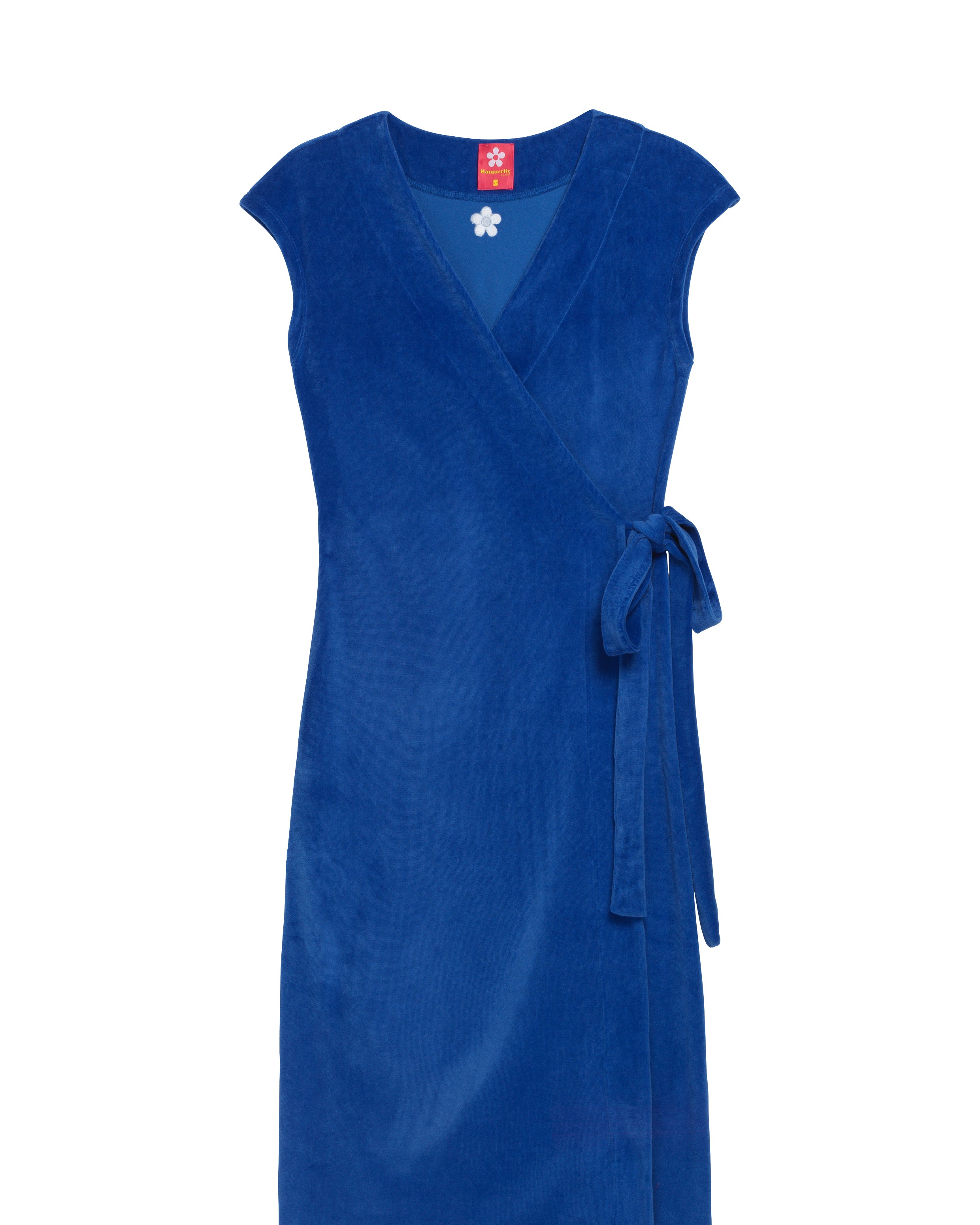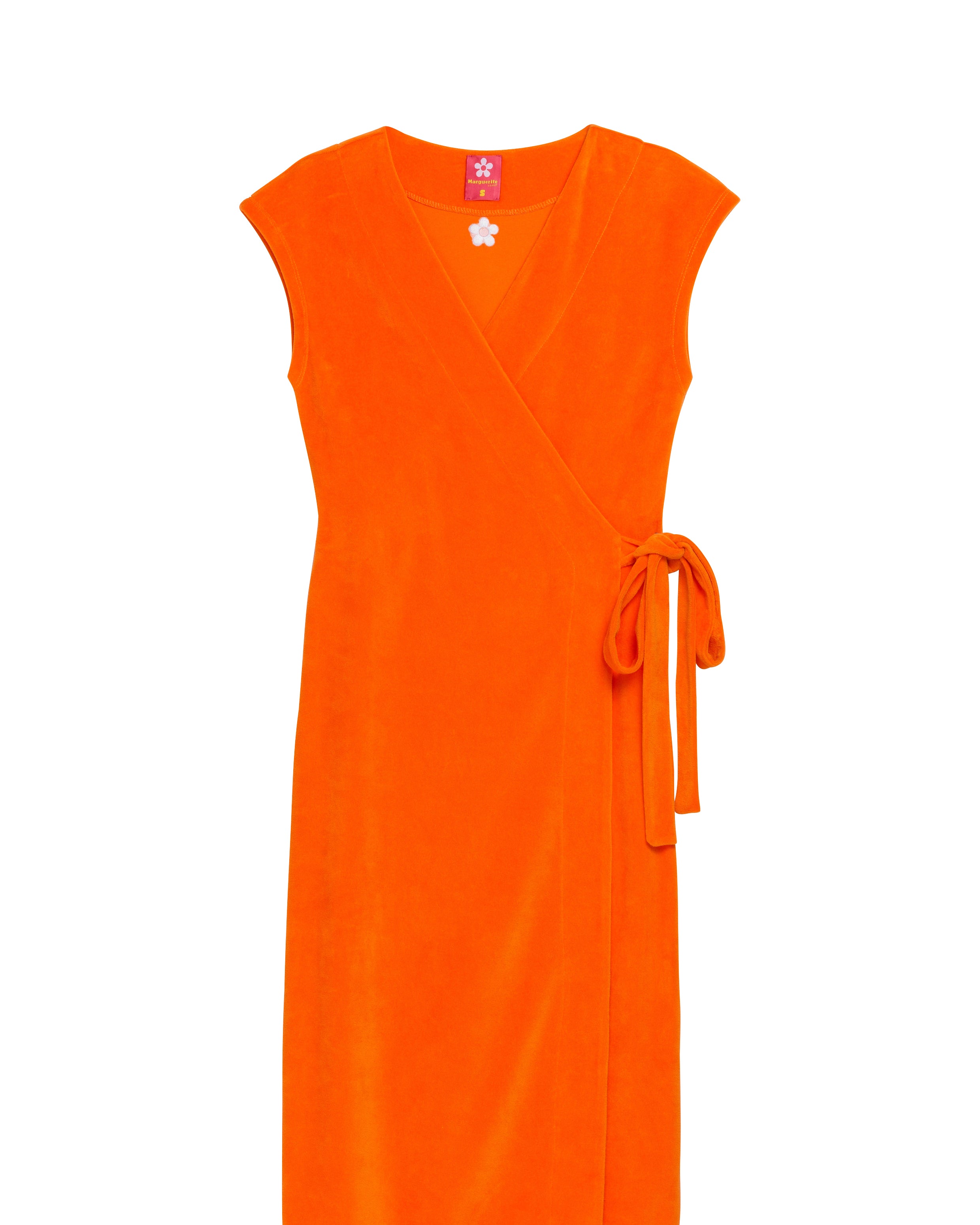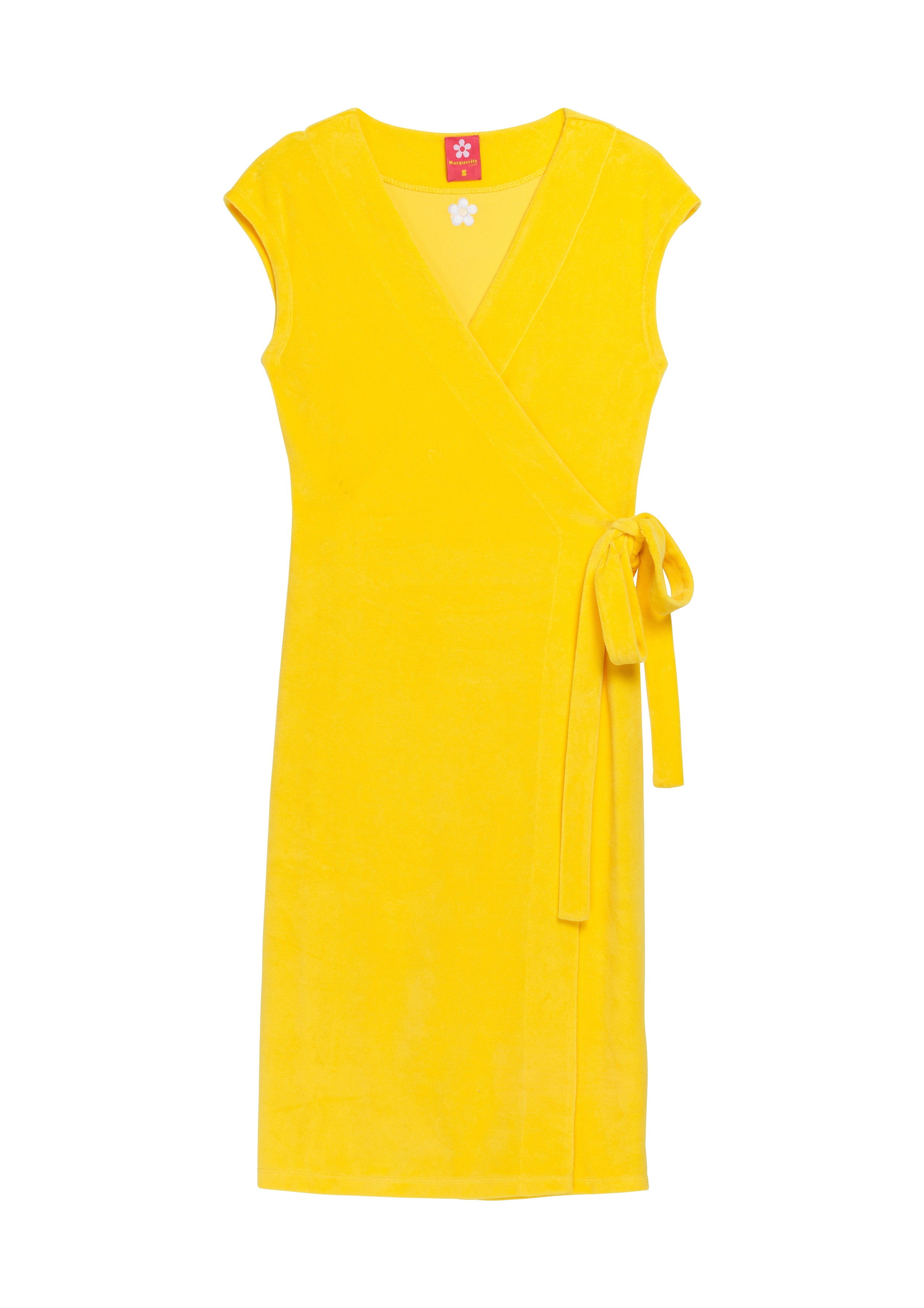 Robe Alassio, sizing regular, longue, portefeuille, décolleté en V, se noue à la taille, couleur unie, fleur marguerite brodée dans le dos.