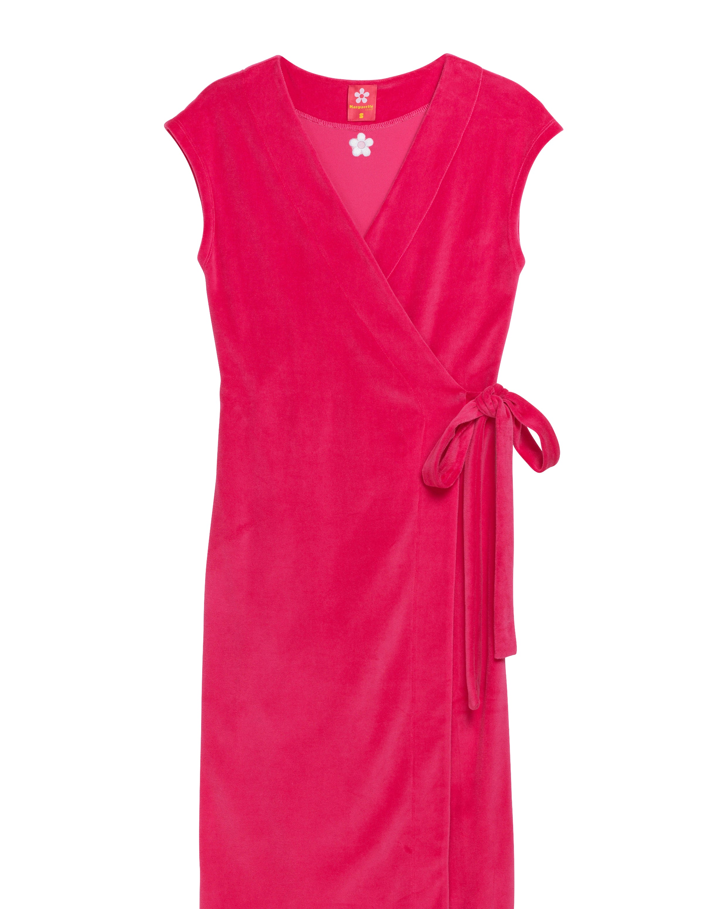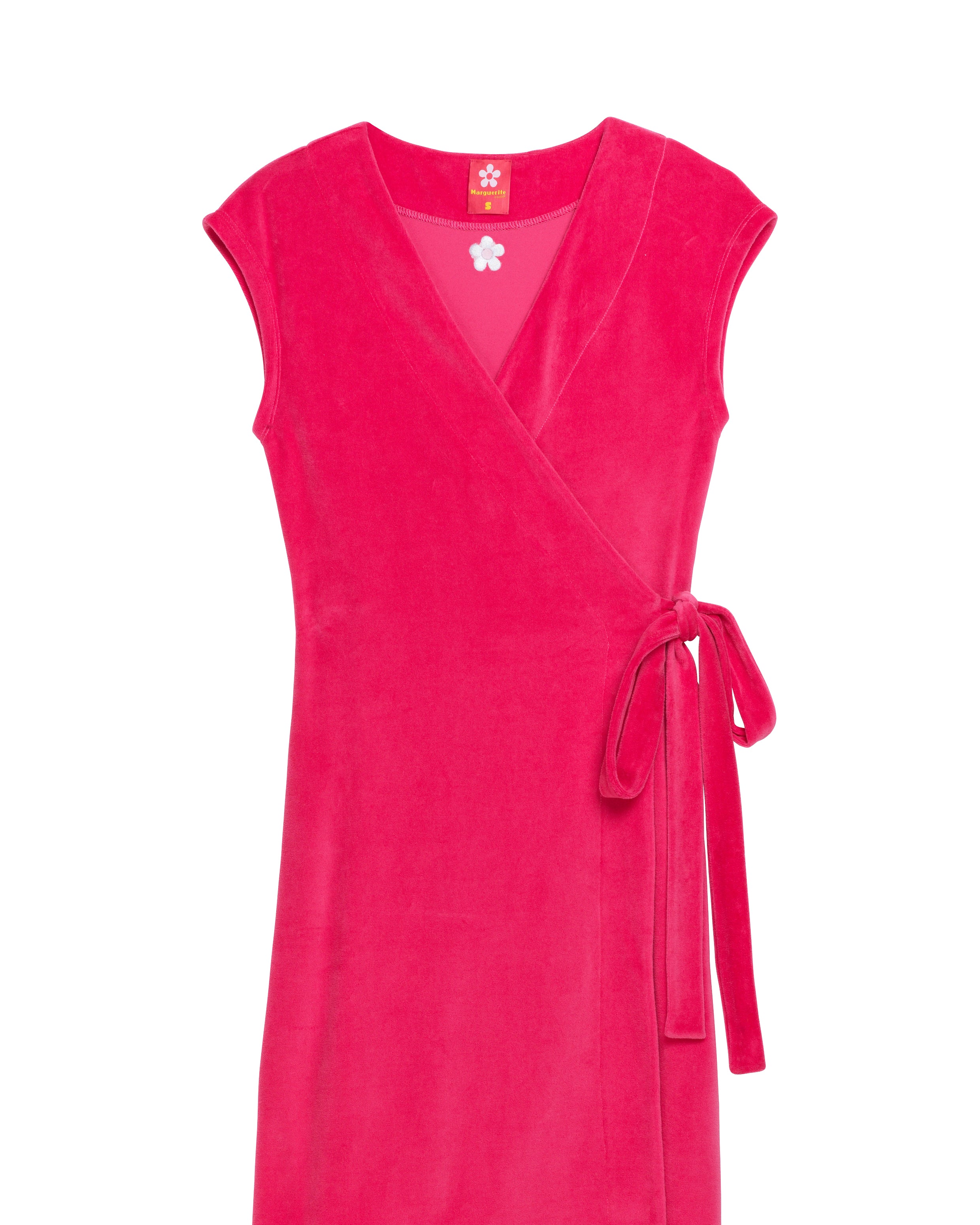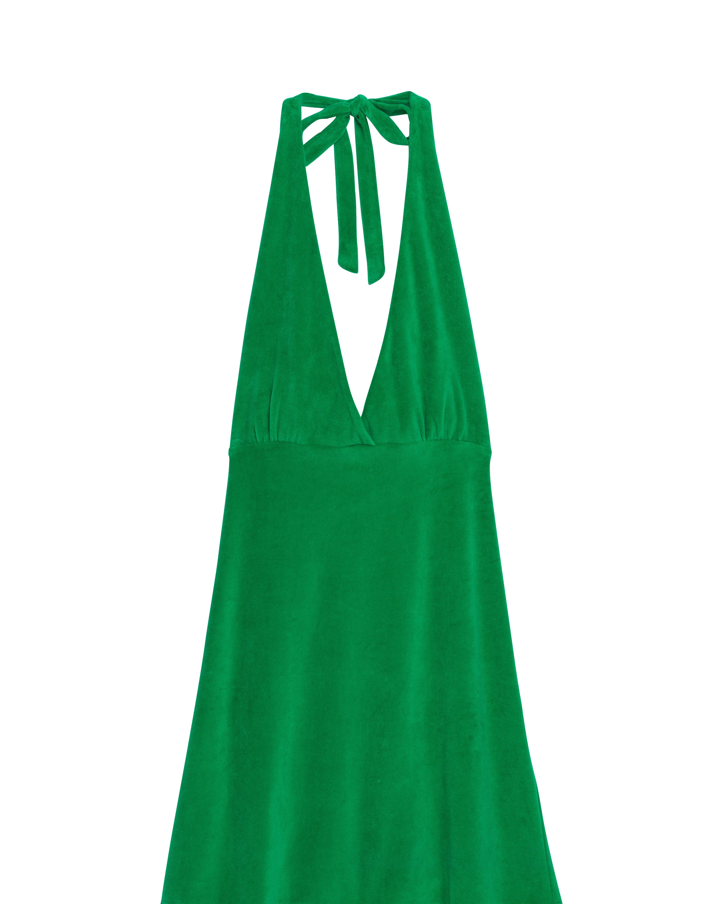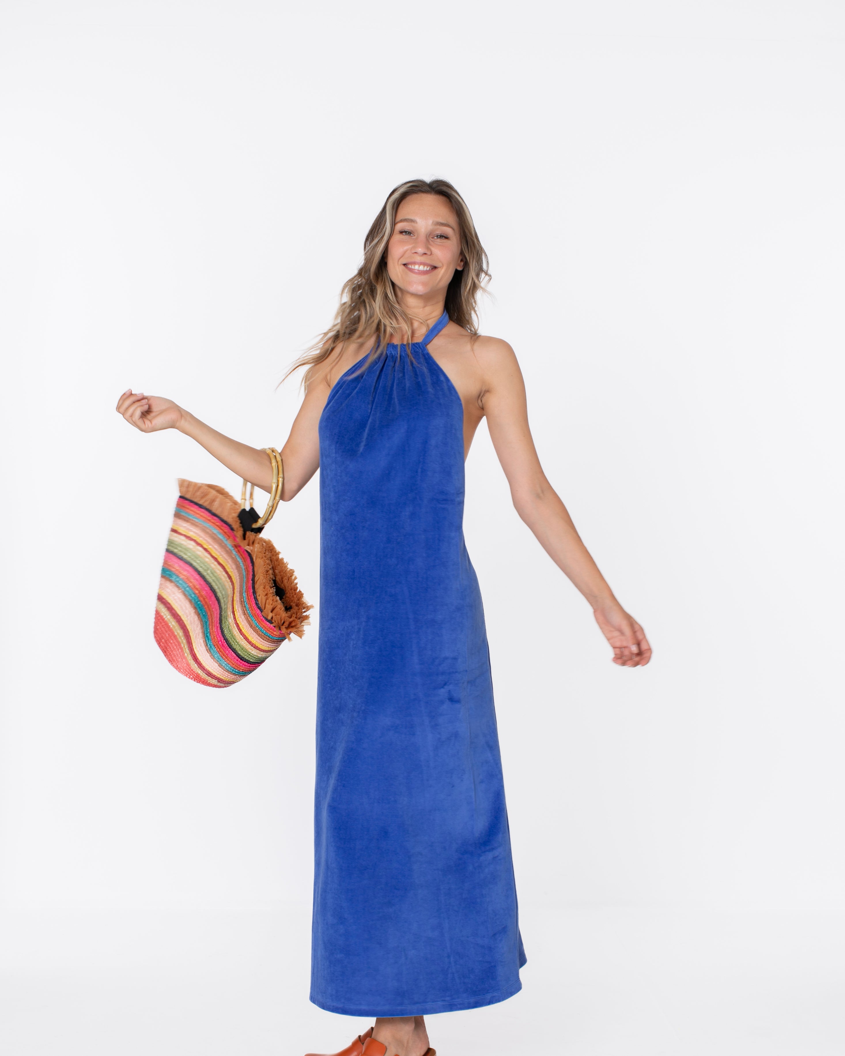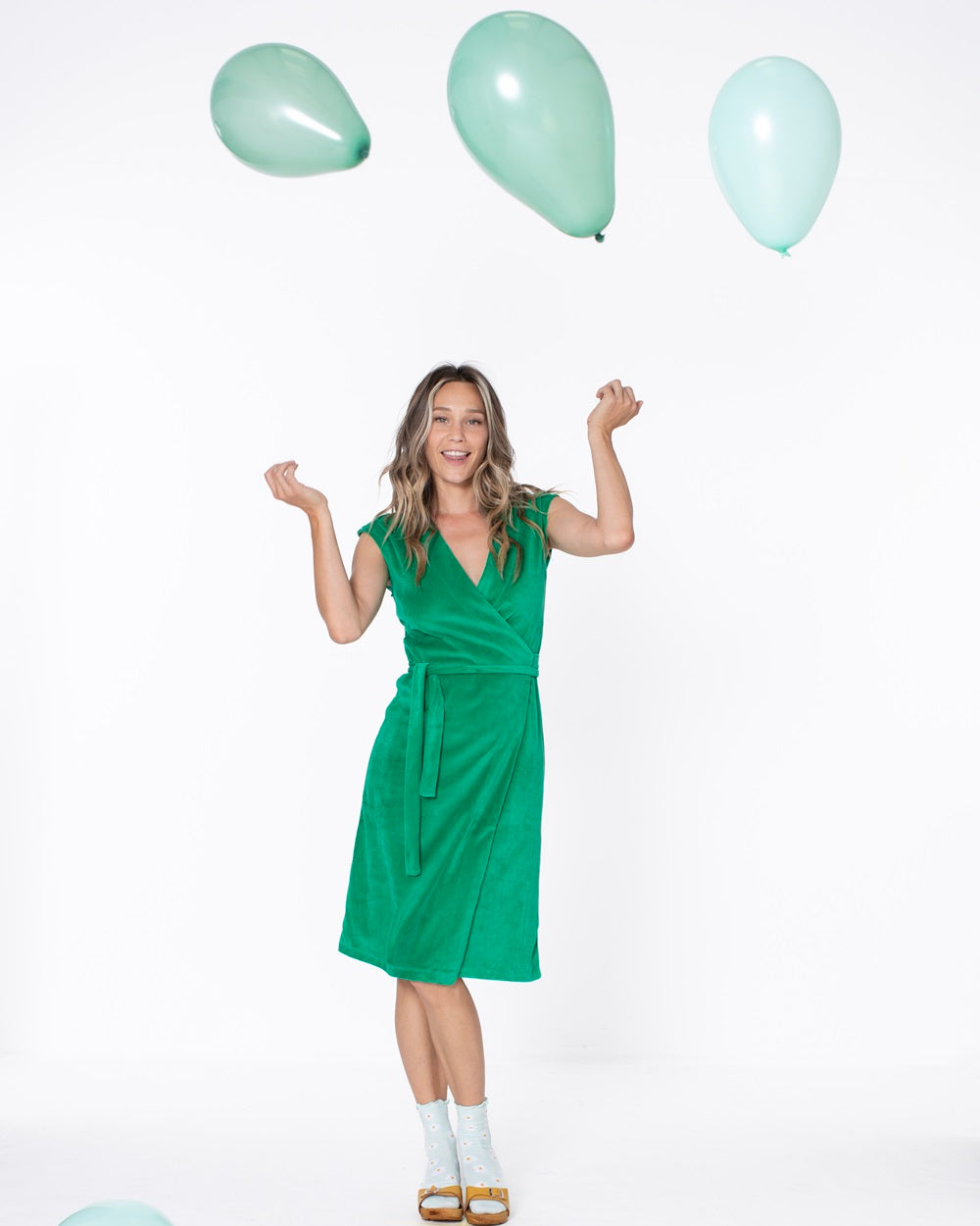 Robe Alassio, sizing regular, longue, portefeuille, décolleté en V, se noue à la taille, couleur unie, fleur marguerite brodée dans le dos.