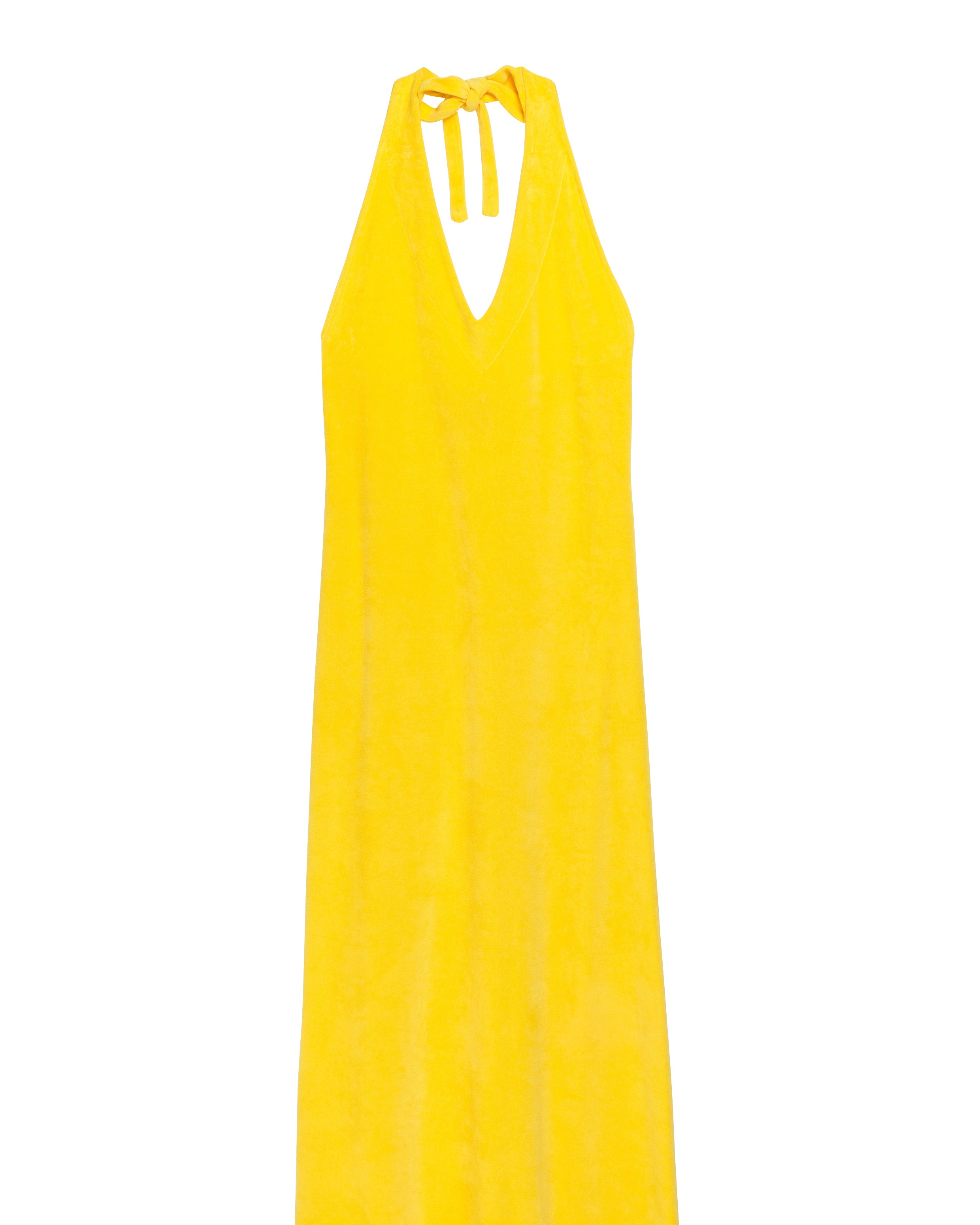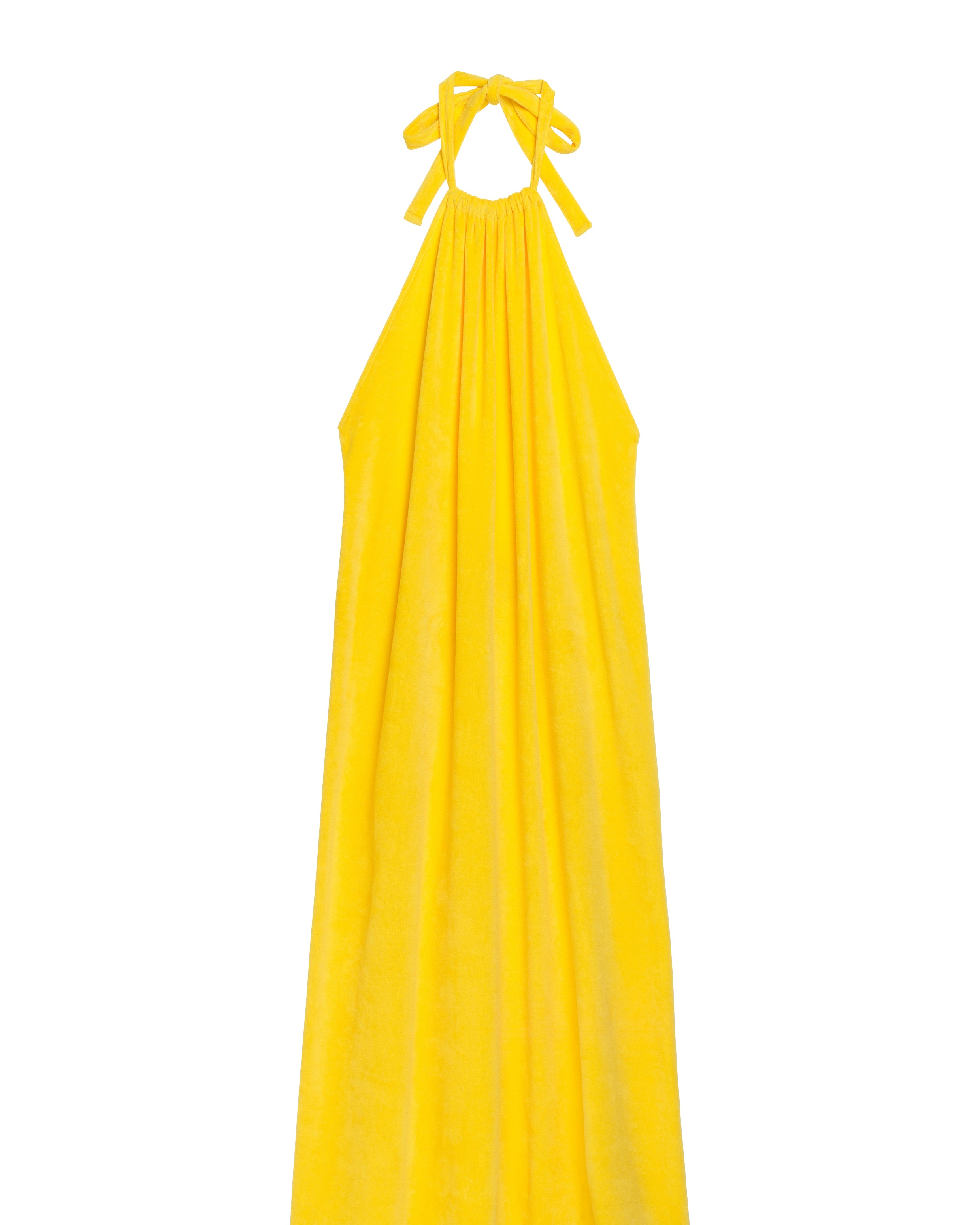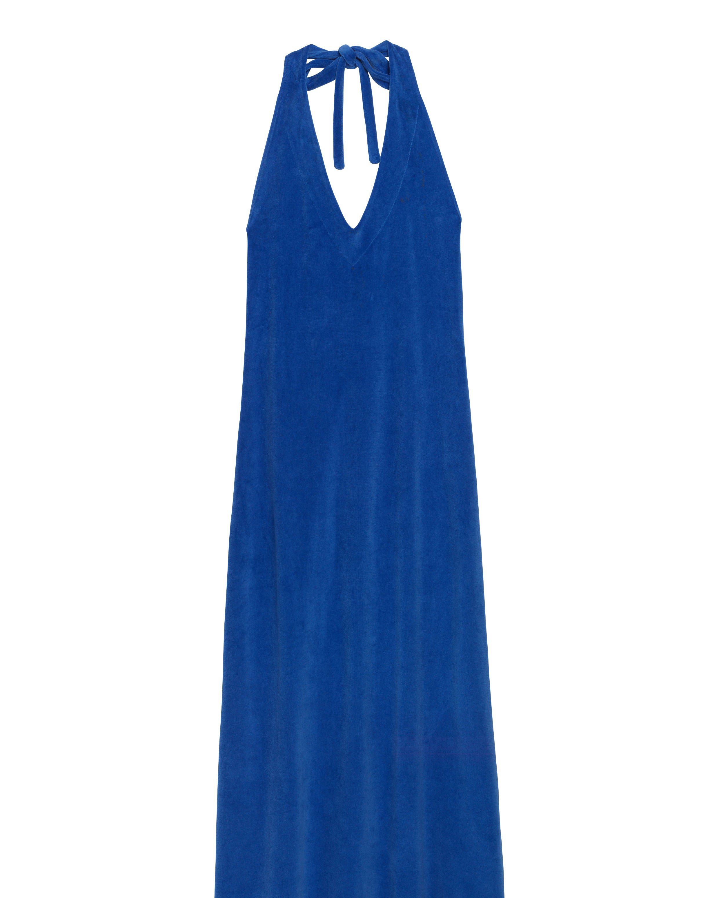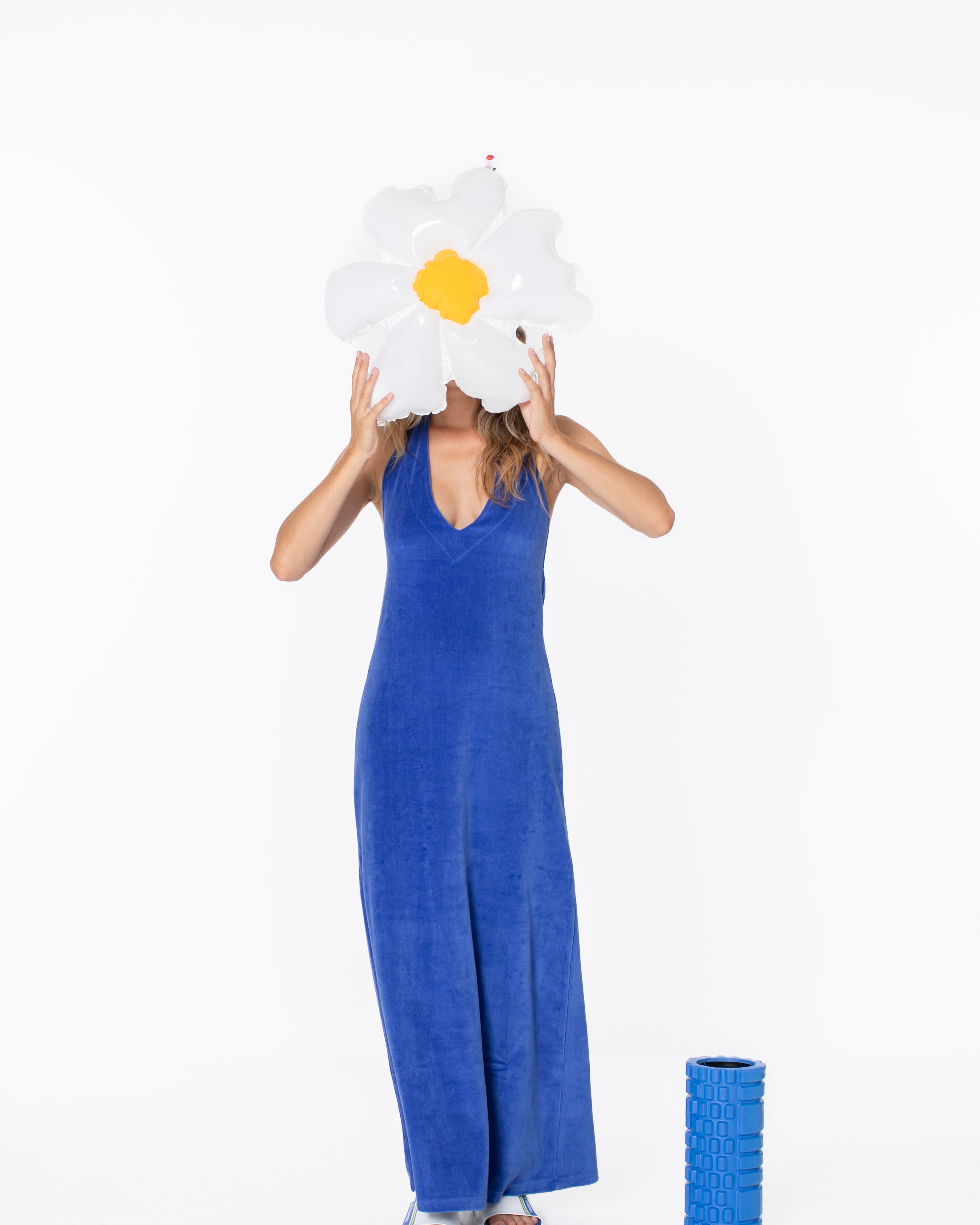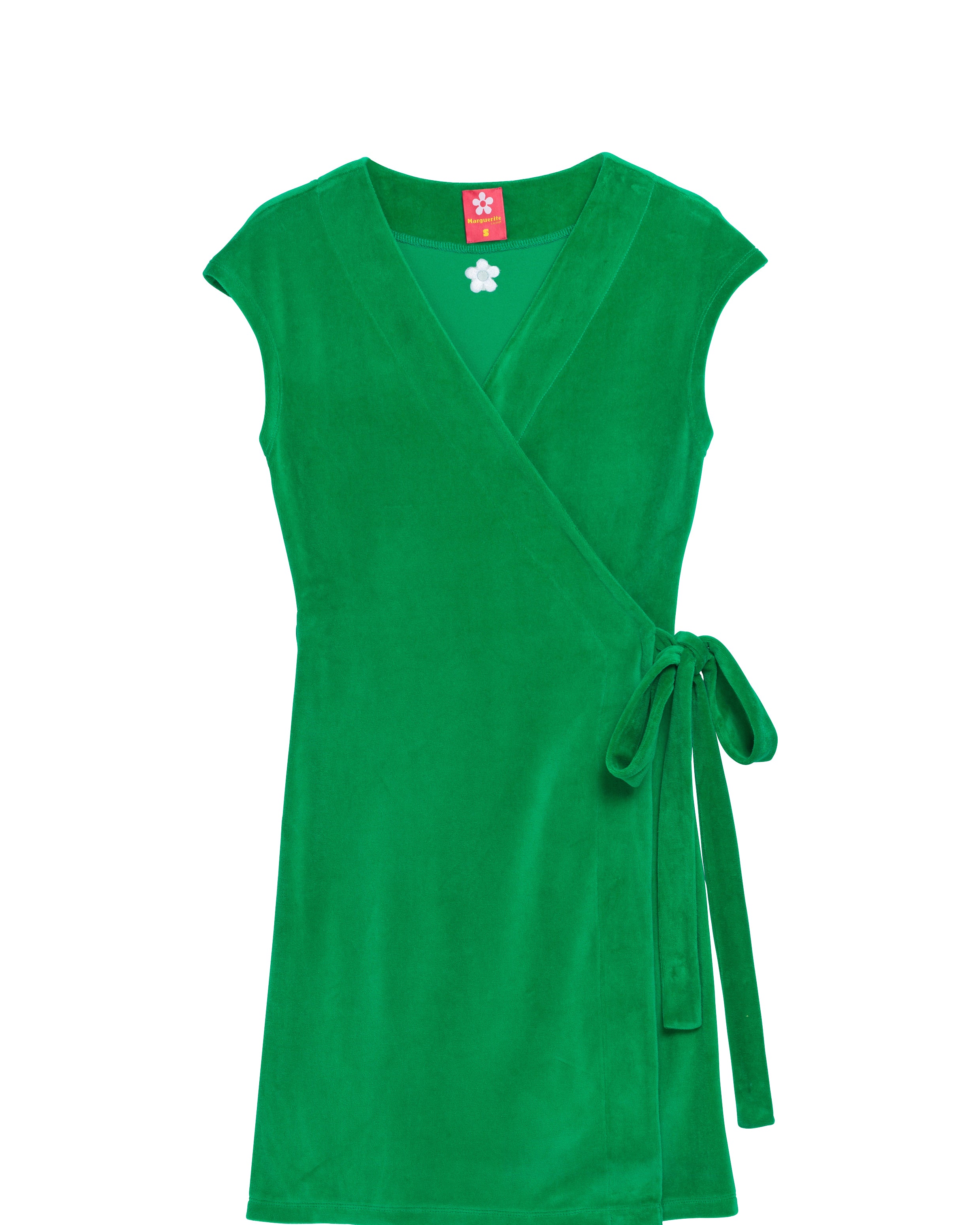 Robe Alassio, sizing regular, longue, portefeuille, décolleté en V, se noue à la taille, couleur unie, fleur marguerite brodée dans le dos.