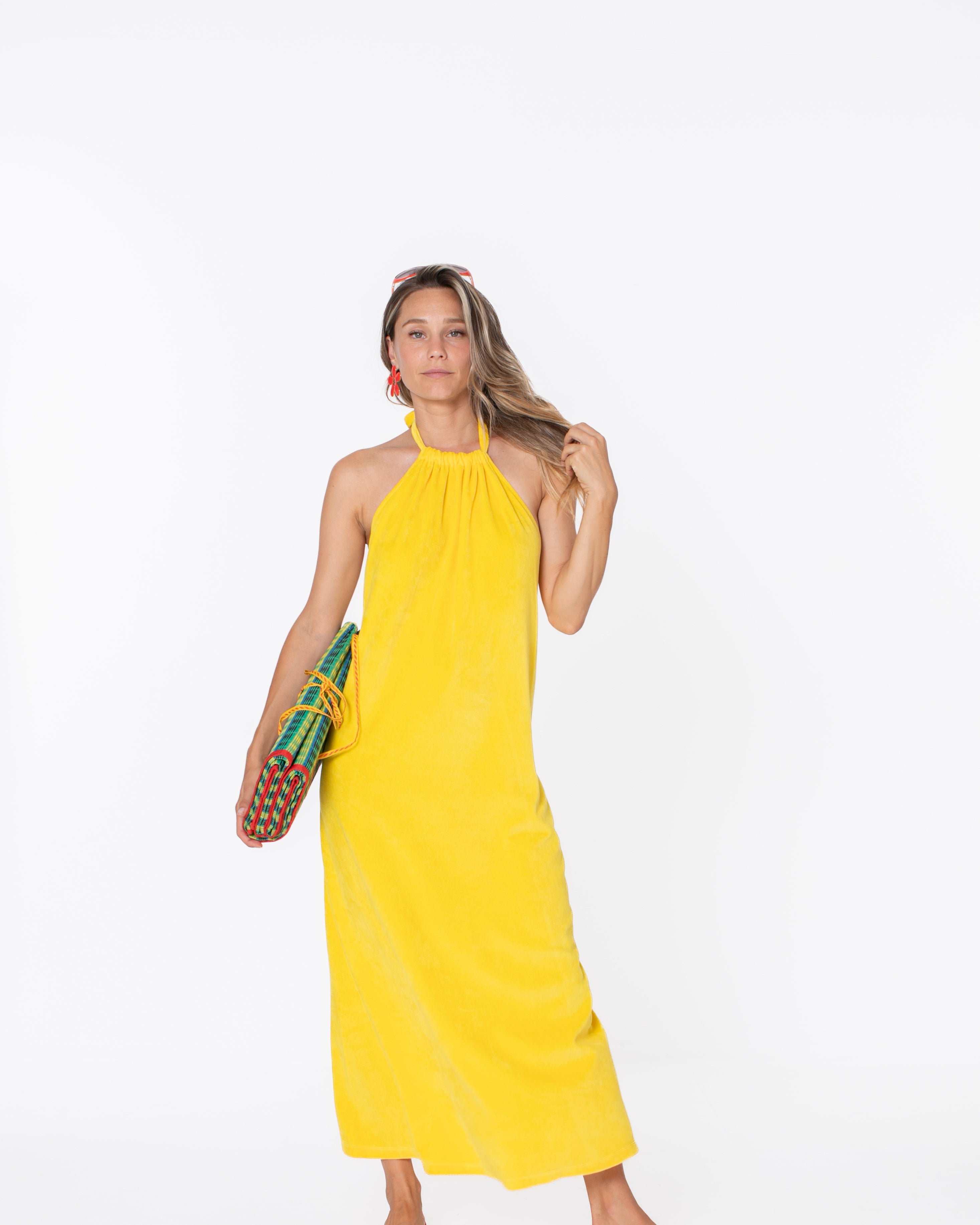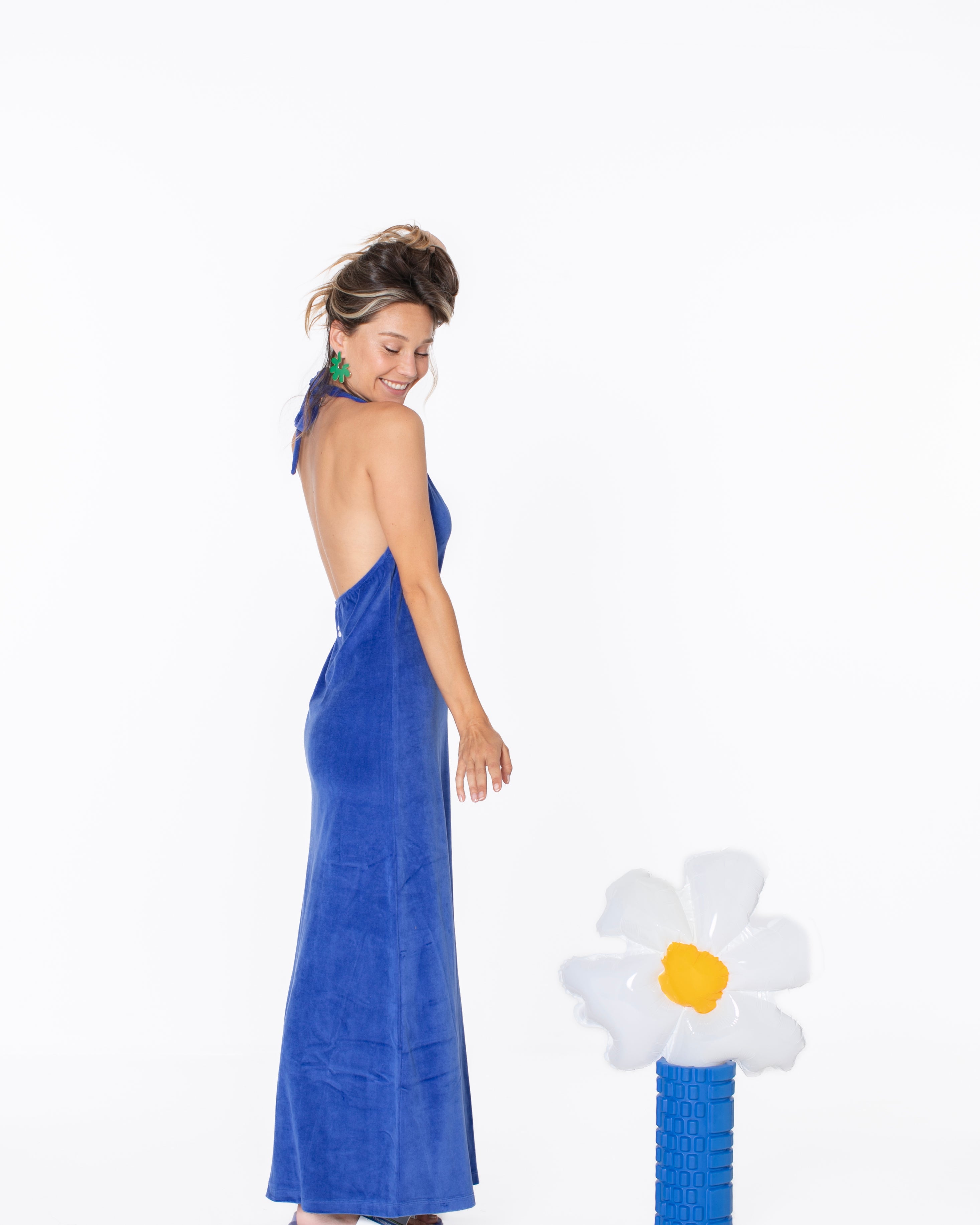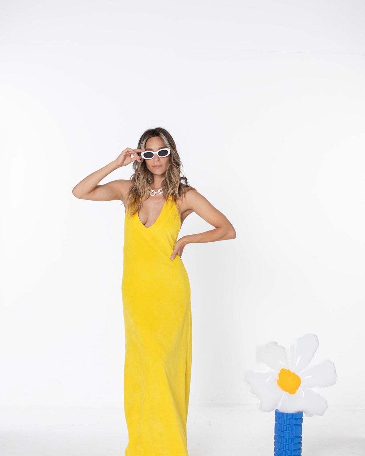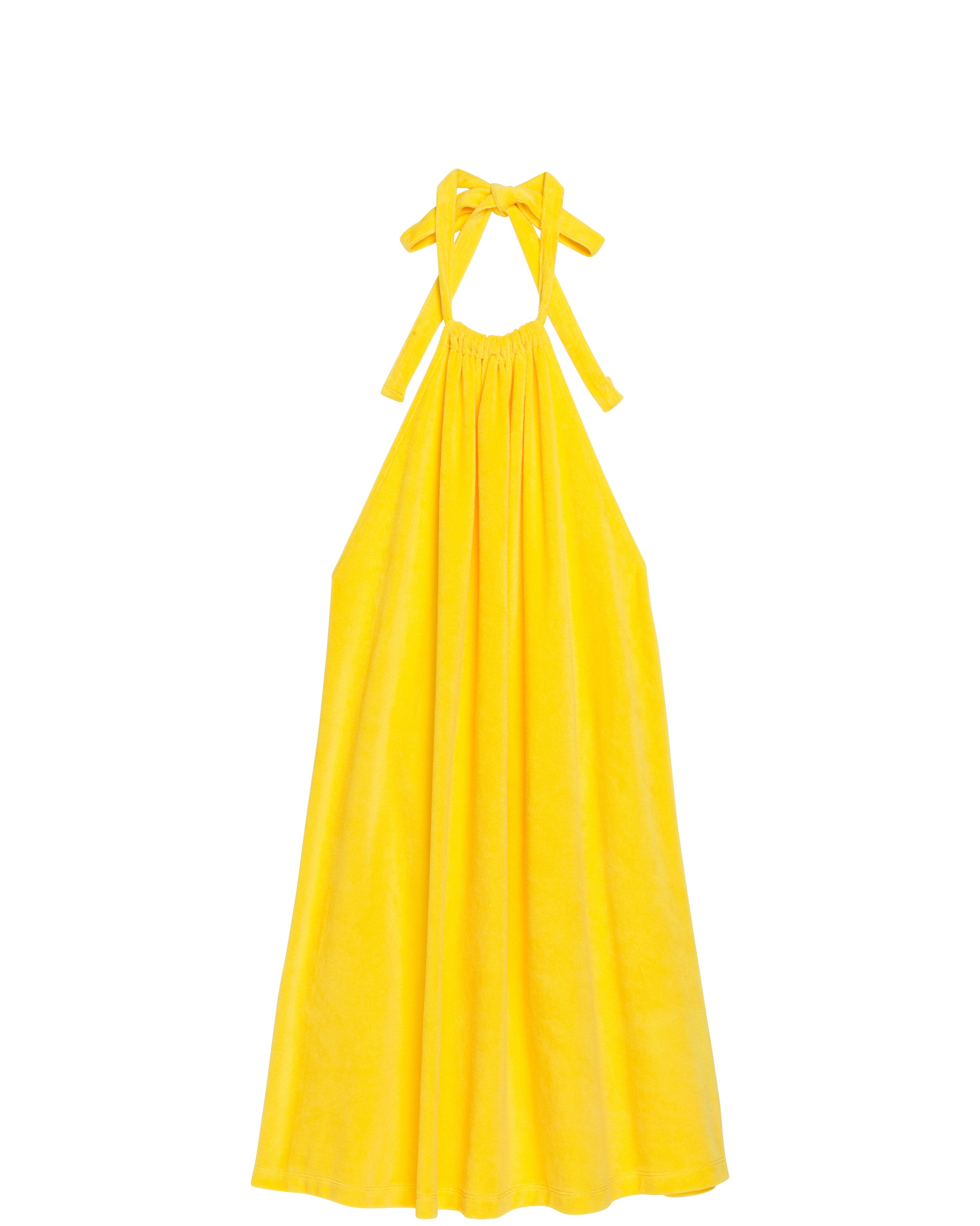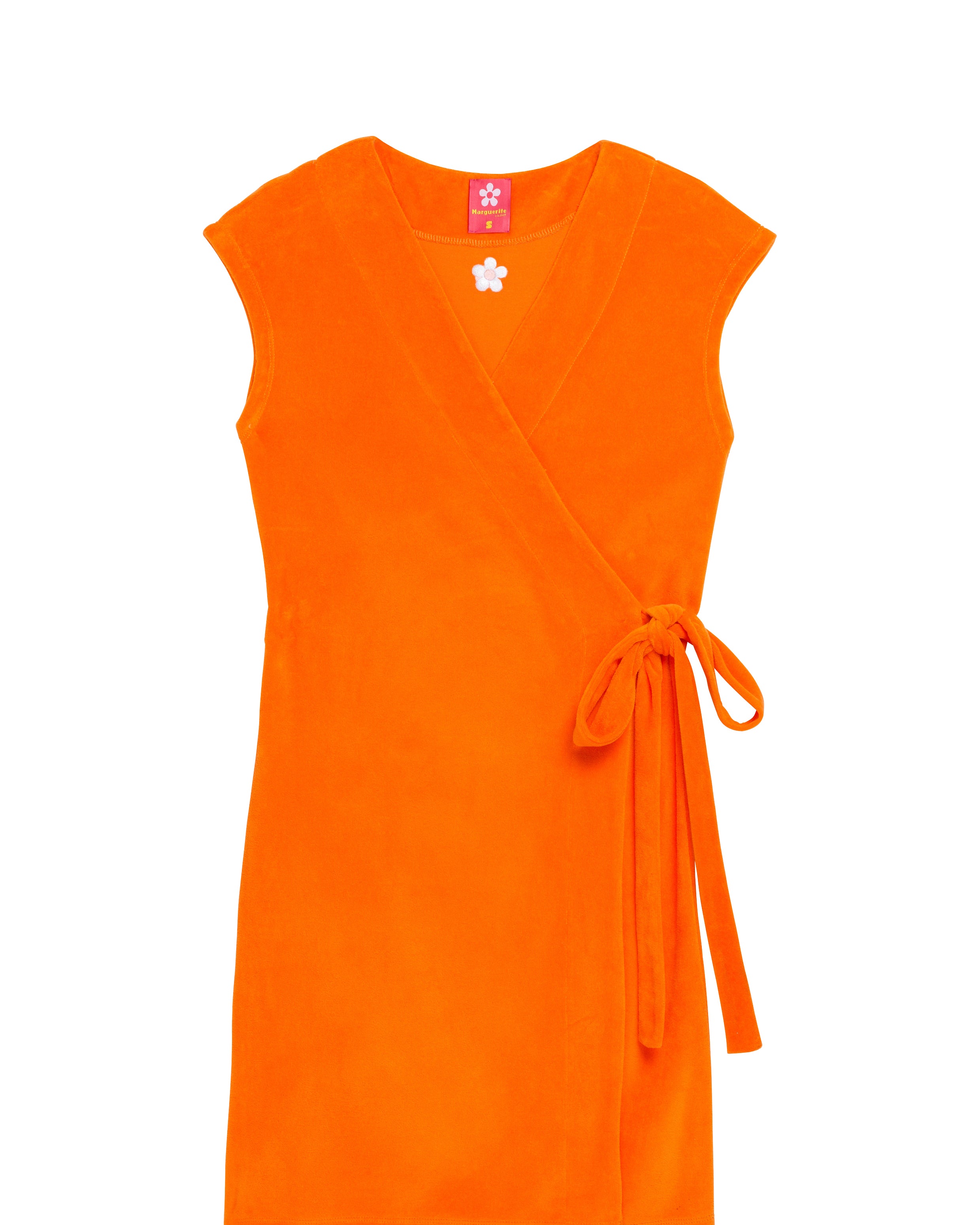 Robe Alassio, sizing regular, longue, portefeuille, décolleté en V, se noue à la taille, couleur unie, fleur marguerite brodée dans le dos.