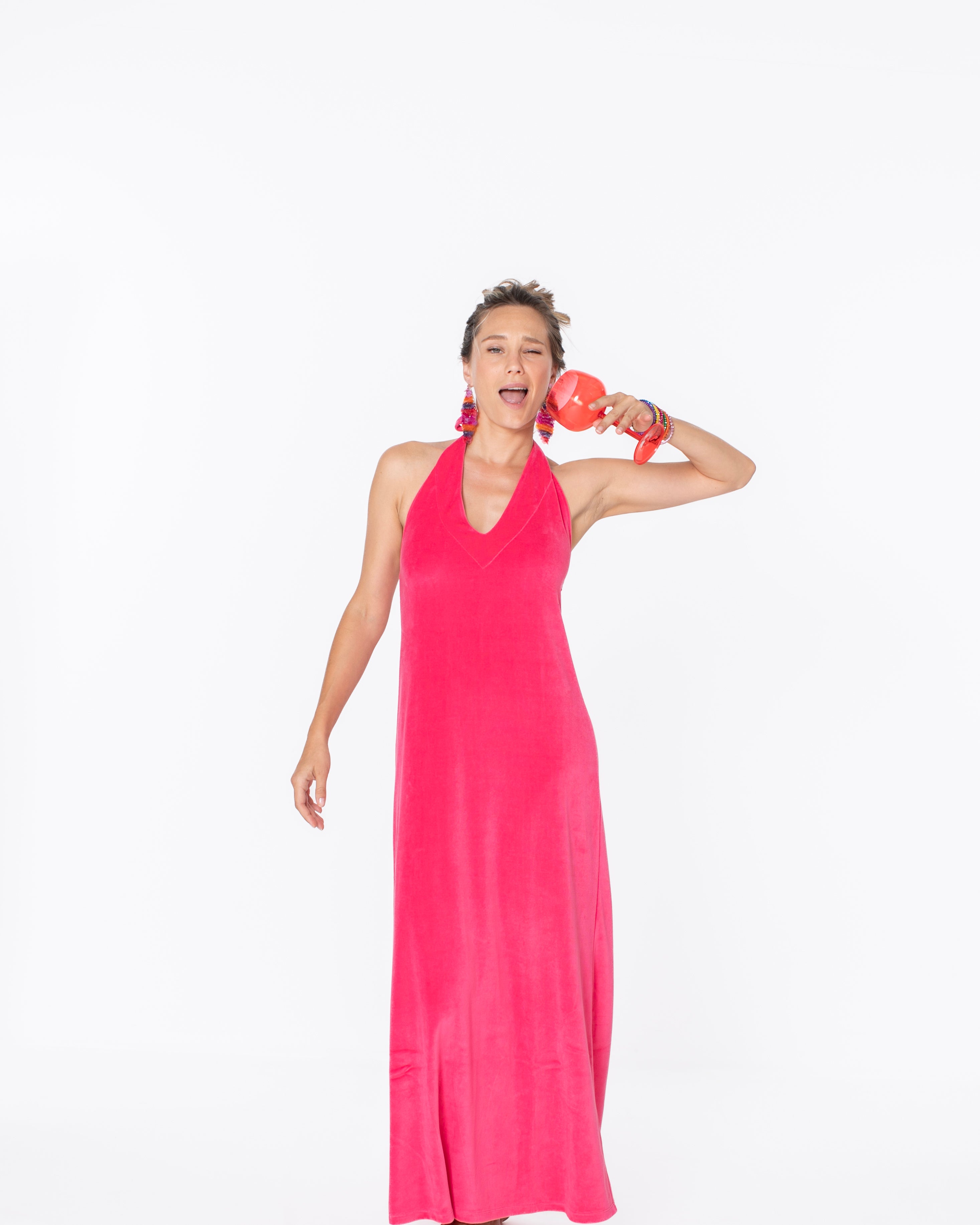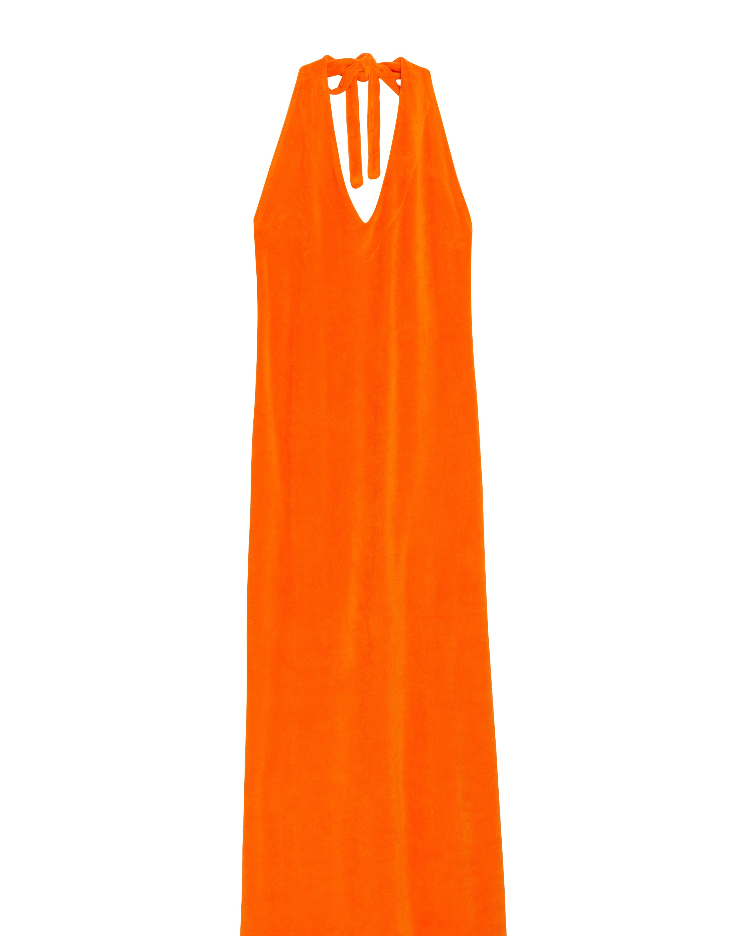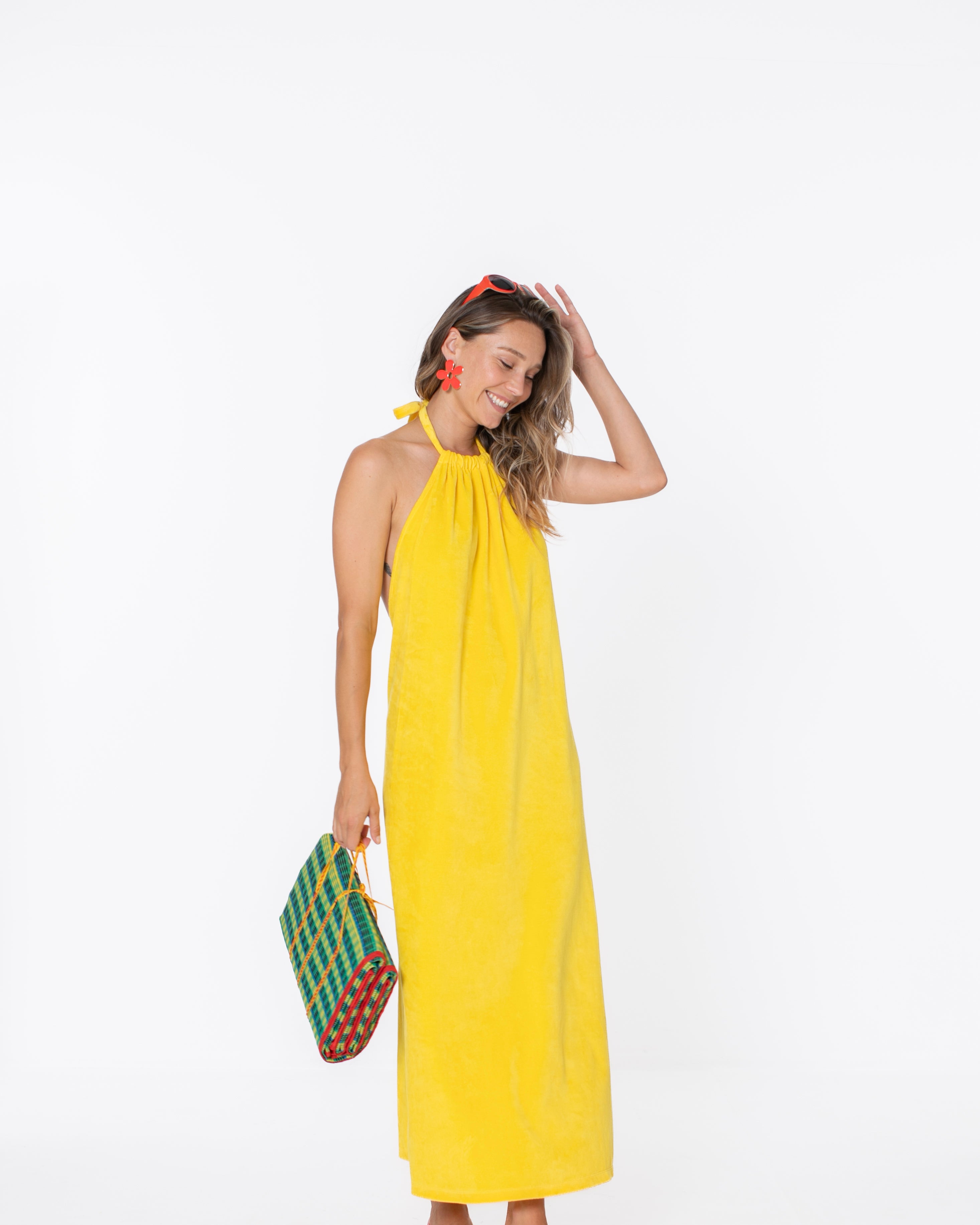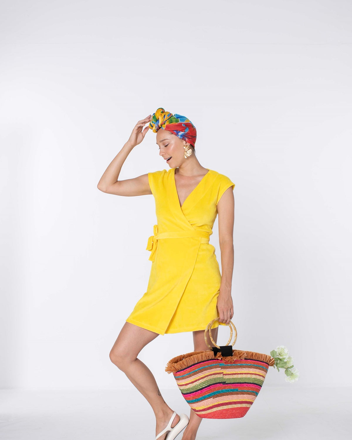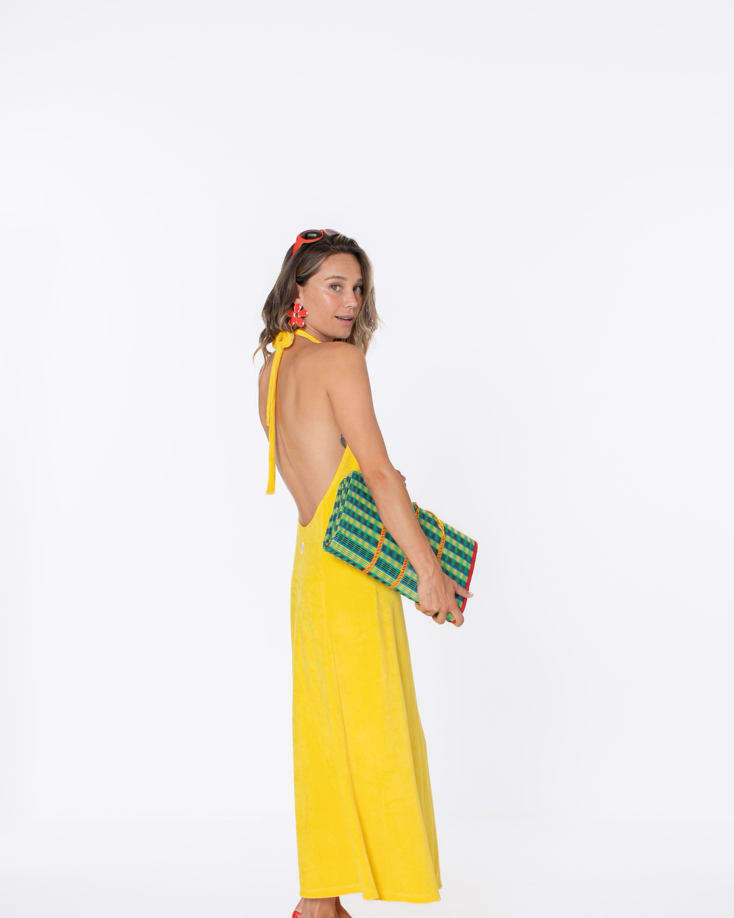 Robe Alassio, sizing regular, longue, portefeuille, décolleté en V, se noue à la taille, couleur unie, fleur marguerite brodée dans le dos.