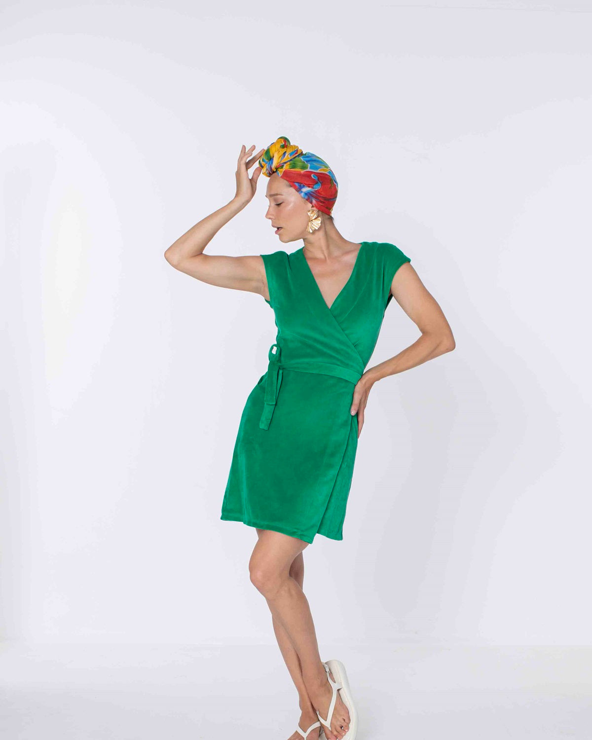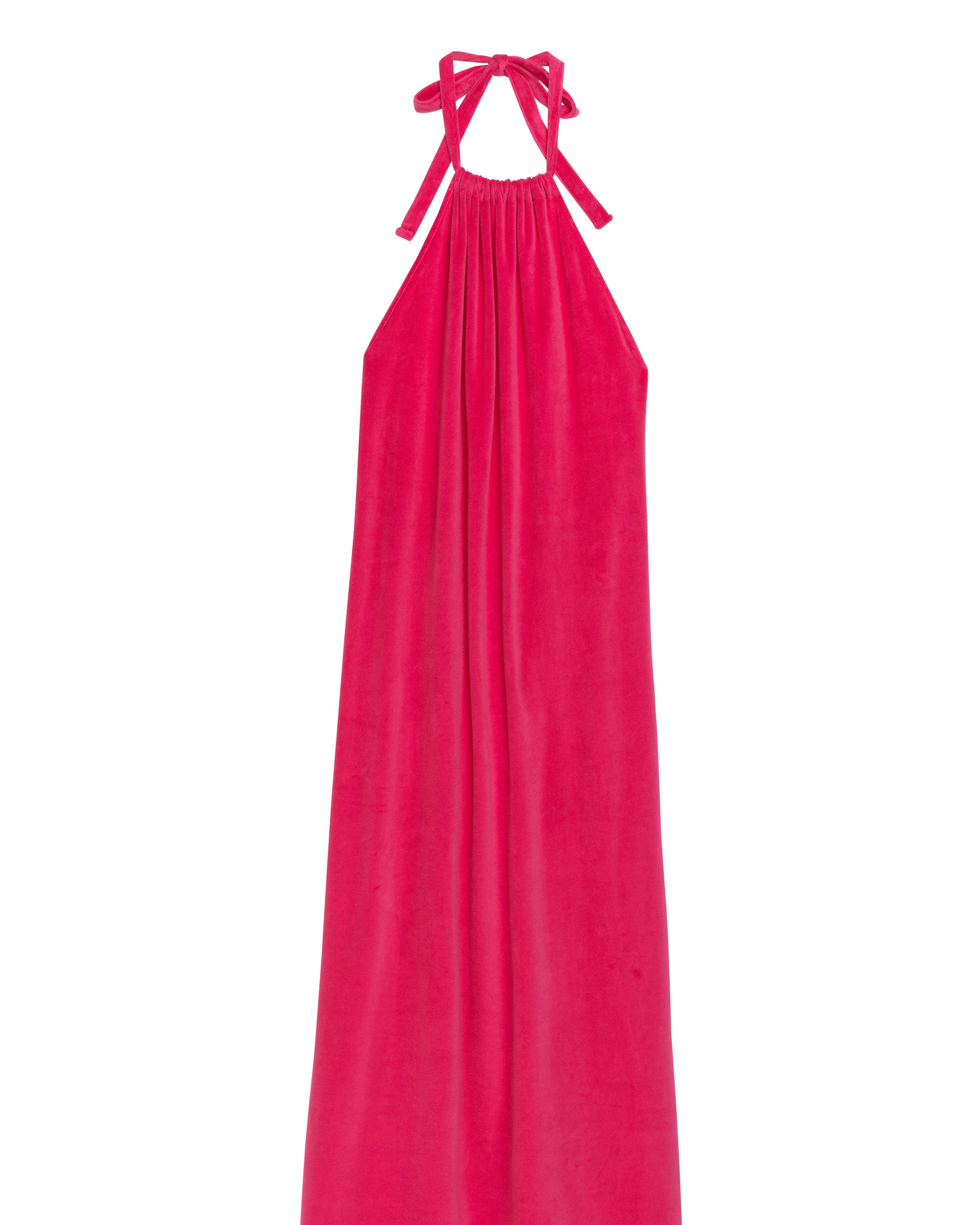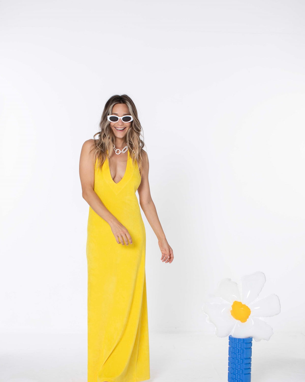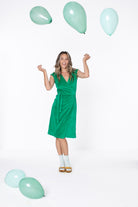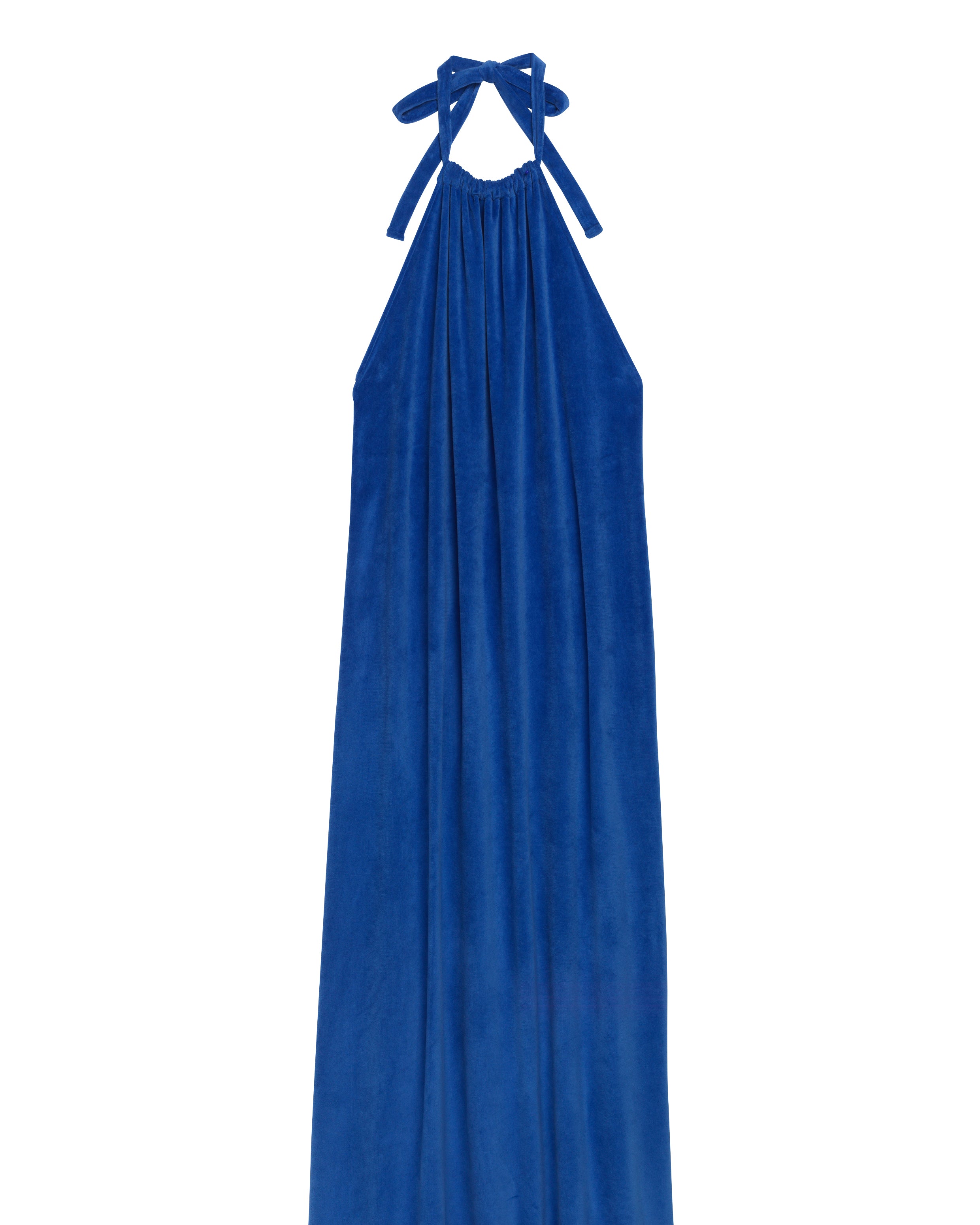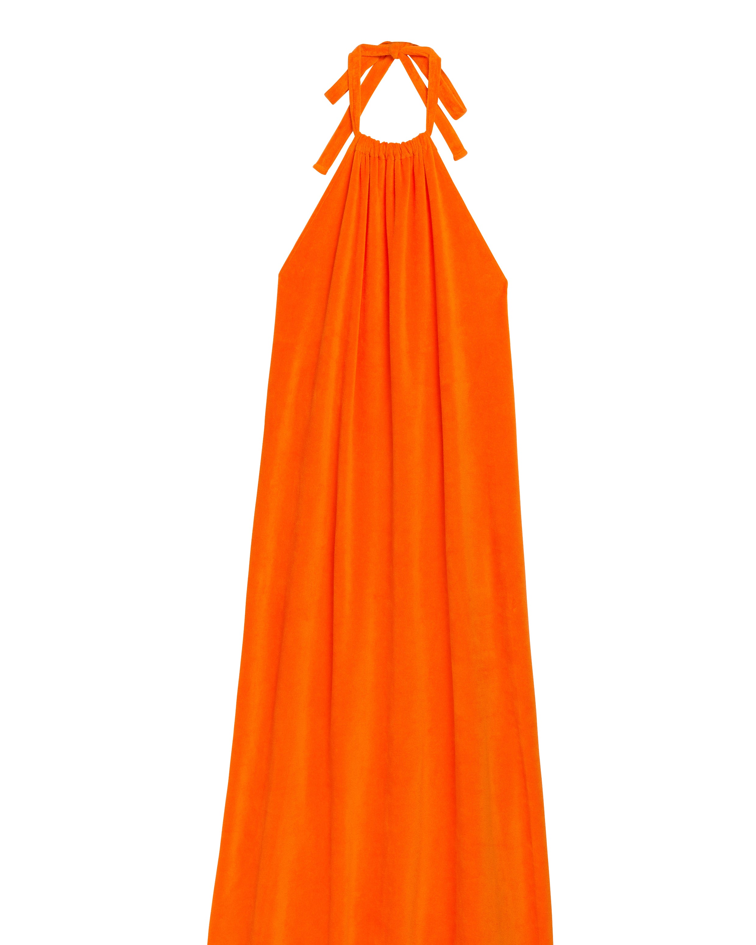 Robe Alassio, sizing regular, longue, portefeuille, décolleté en V, se noue à la taille, couleur unie, fleur marguerite brodée dans le dos.