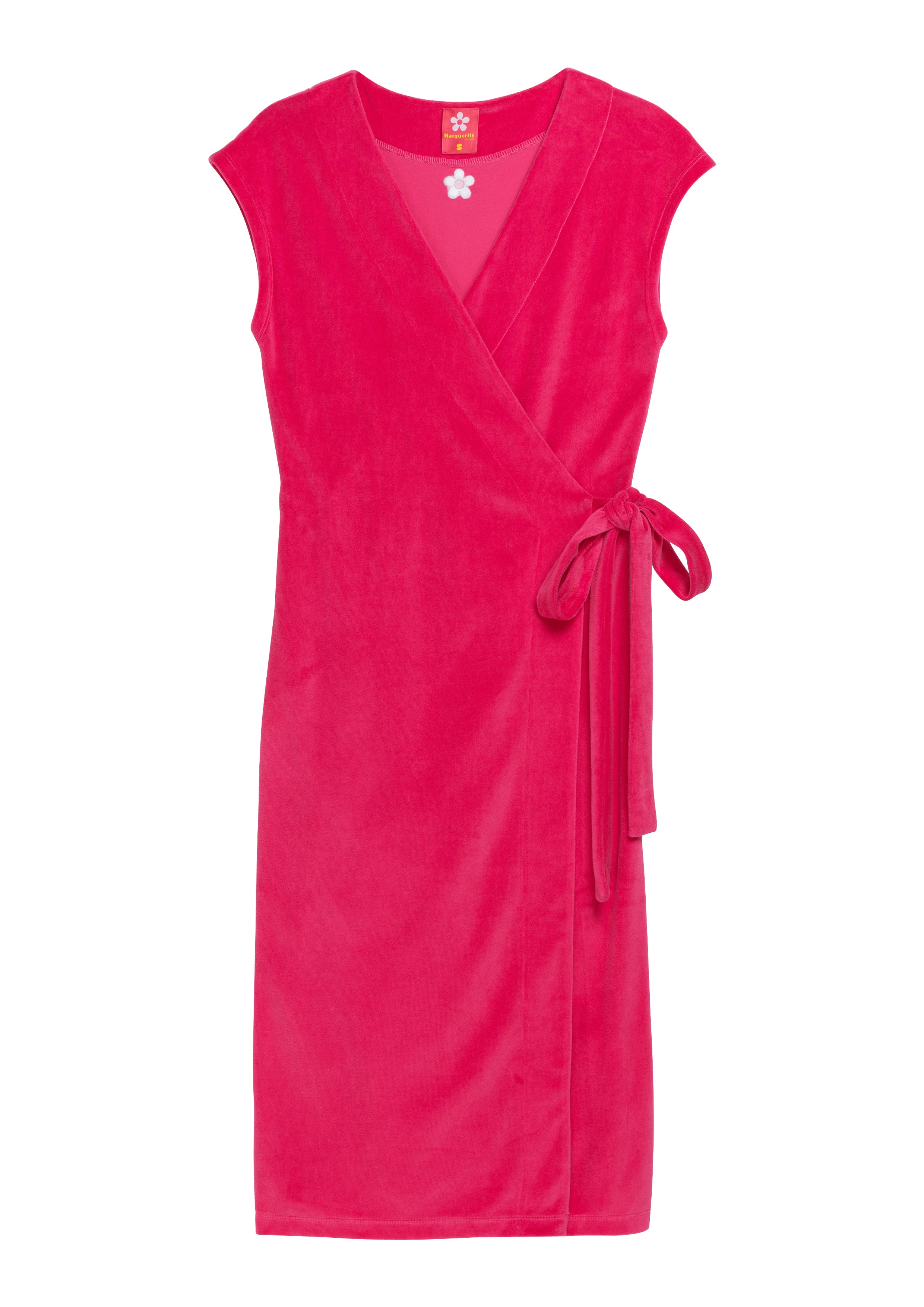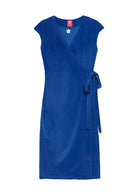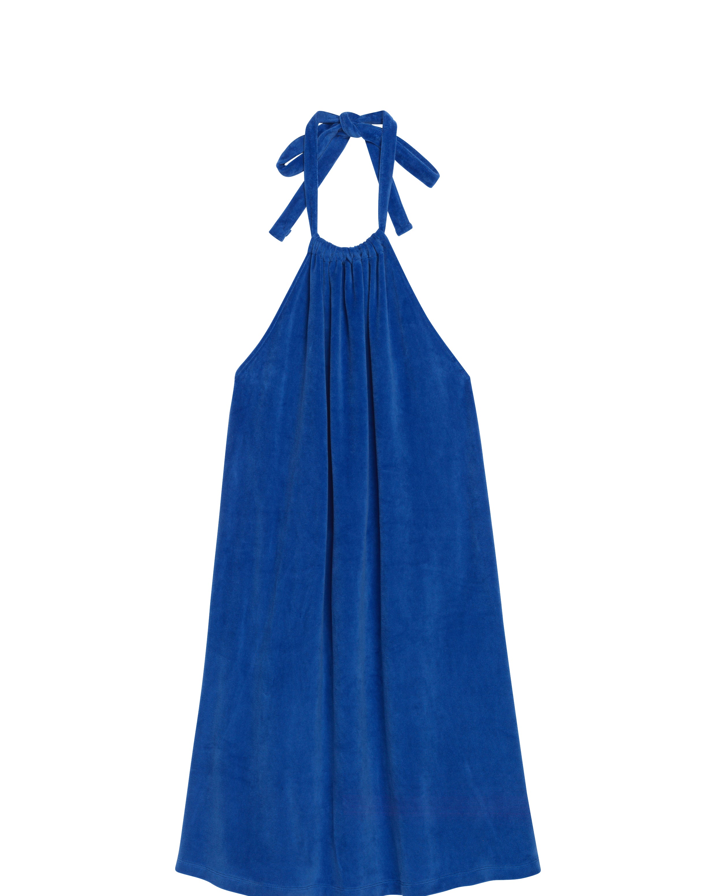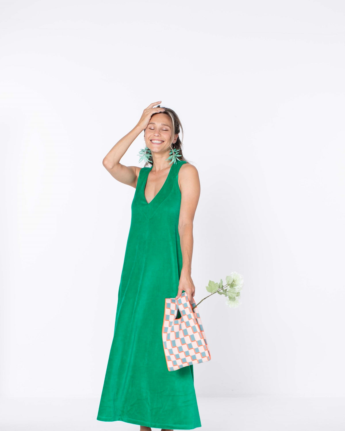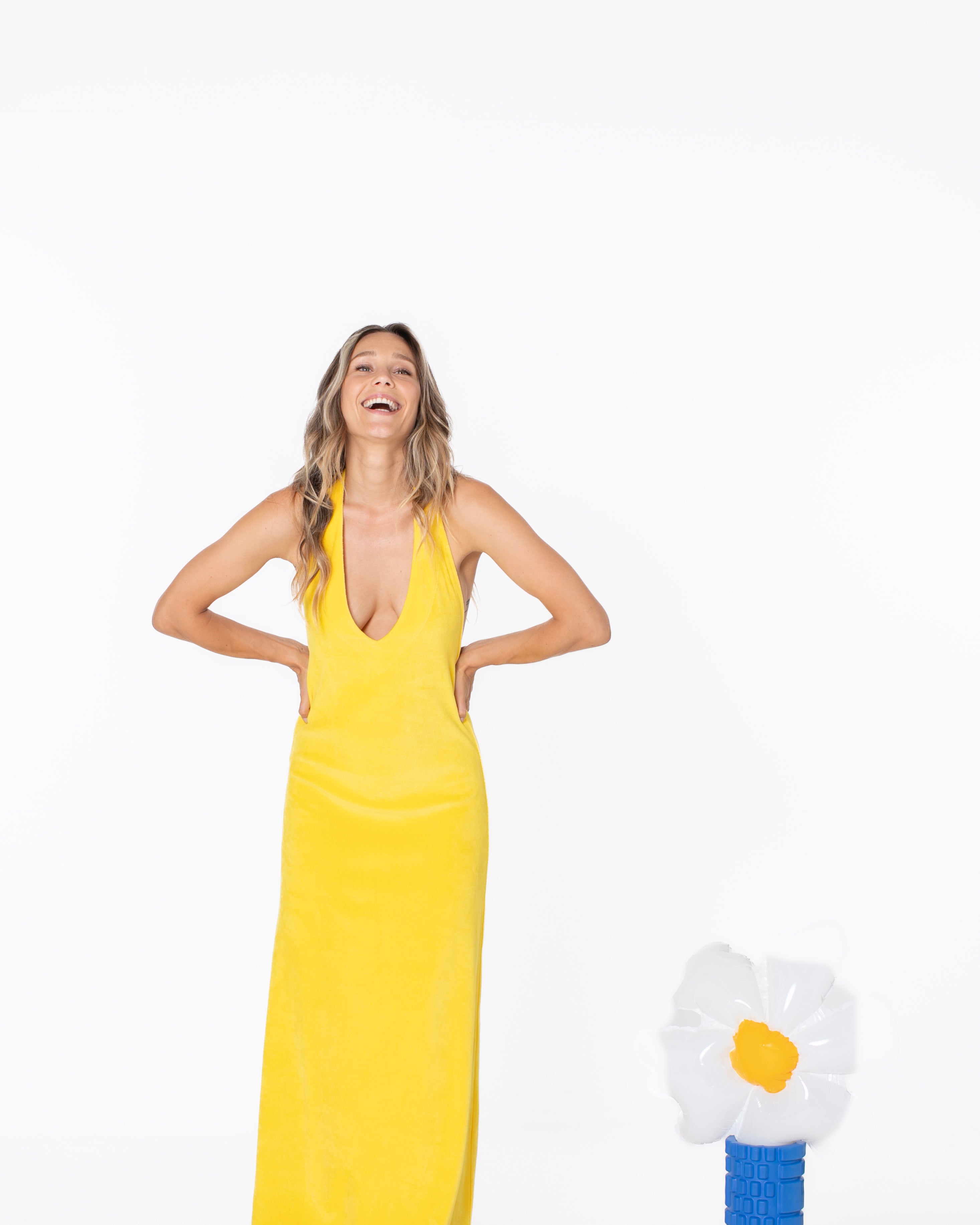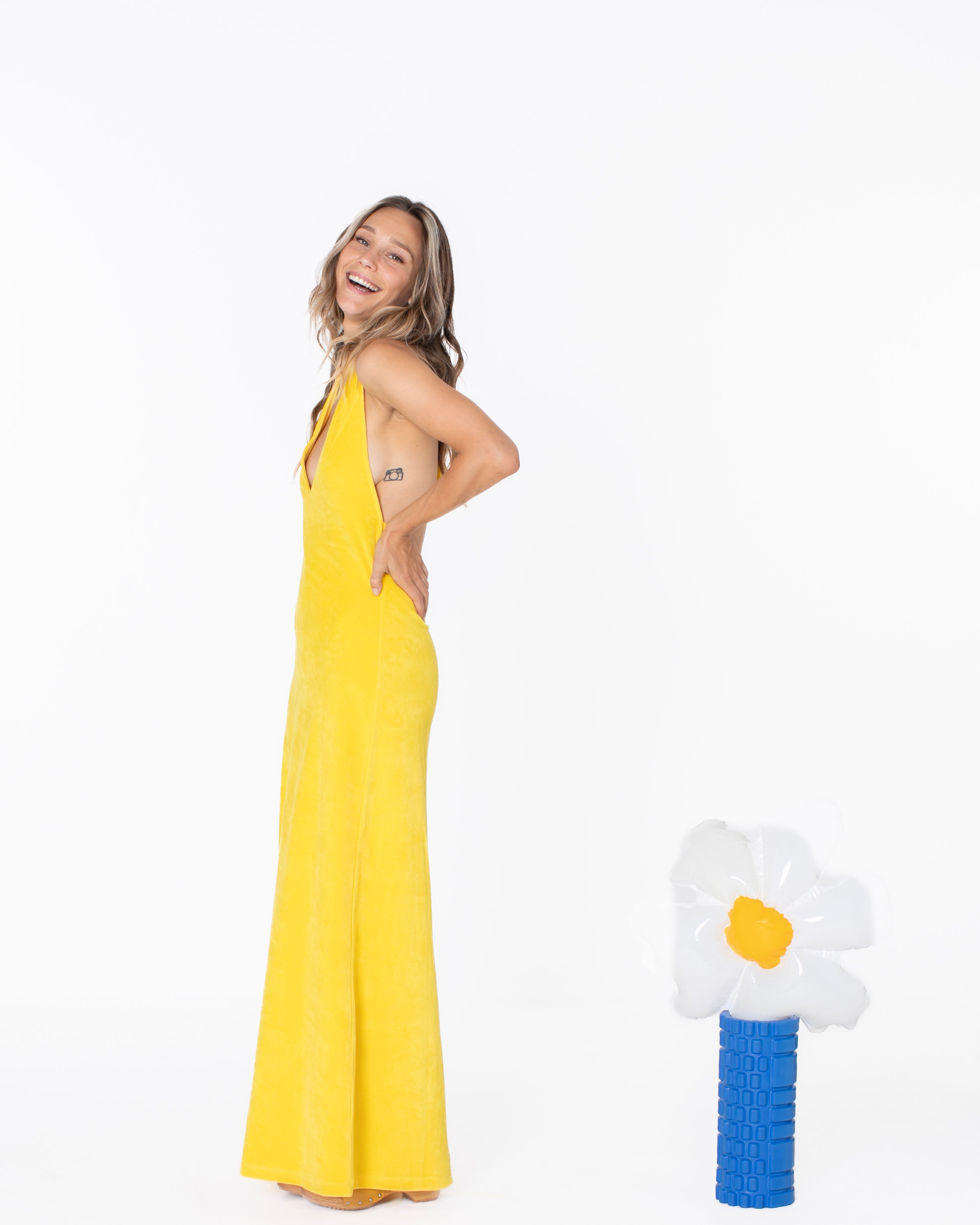 Robe Alassio, sizing regular, longue, portefeuille, décolleté en V, se noue à la taille, couleur unie, fleur marguerite brodée dans le dos.
