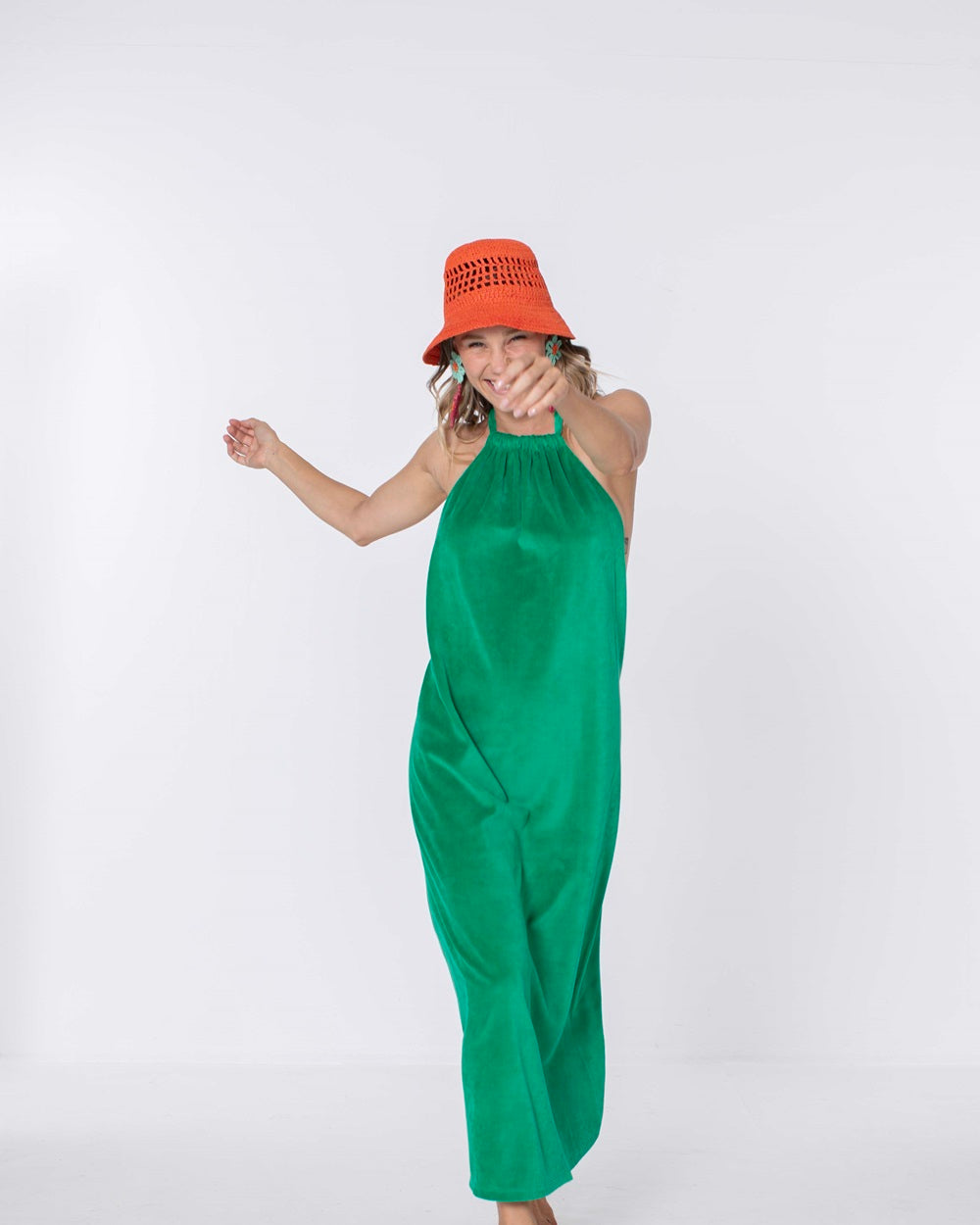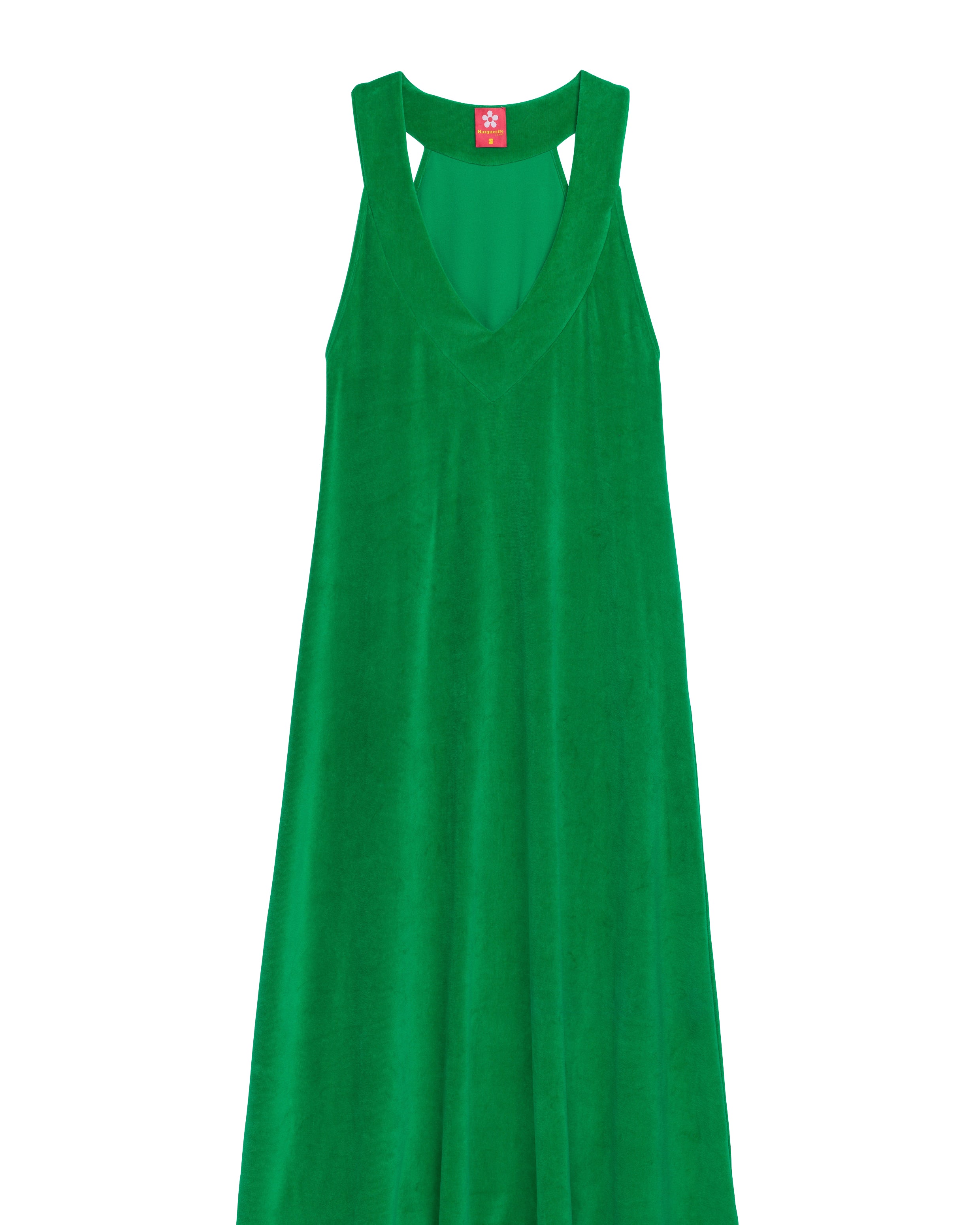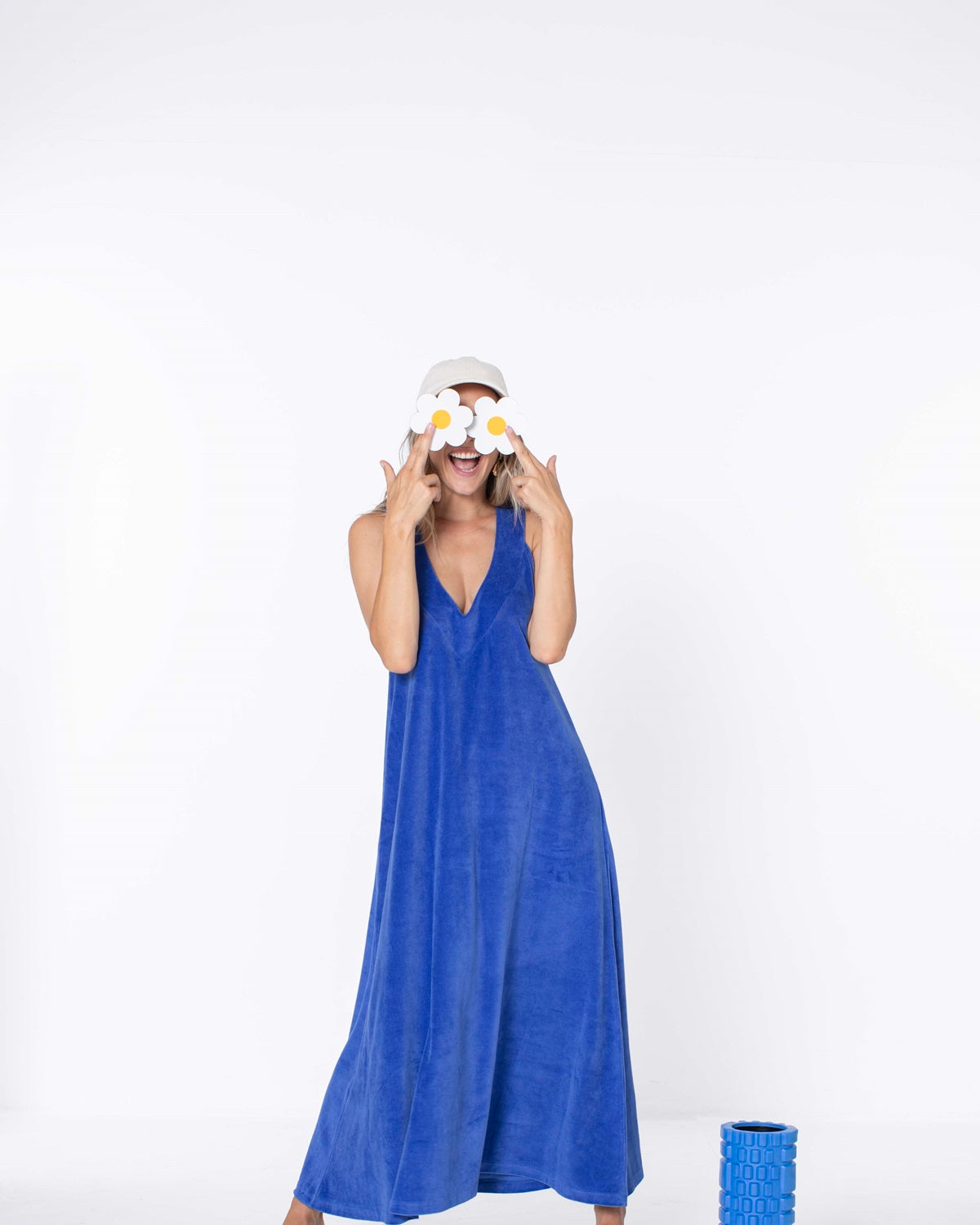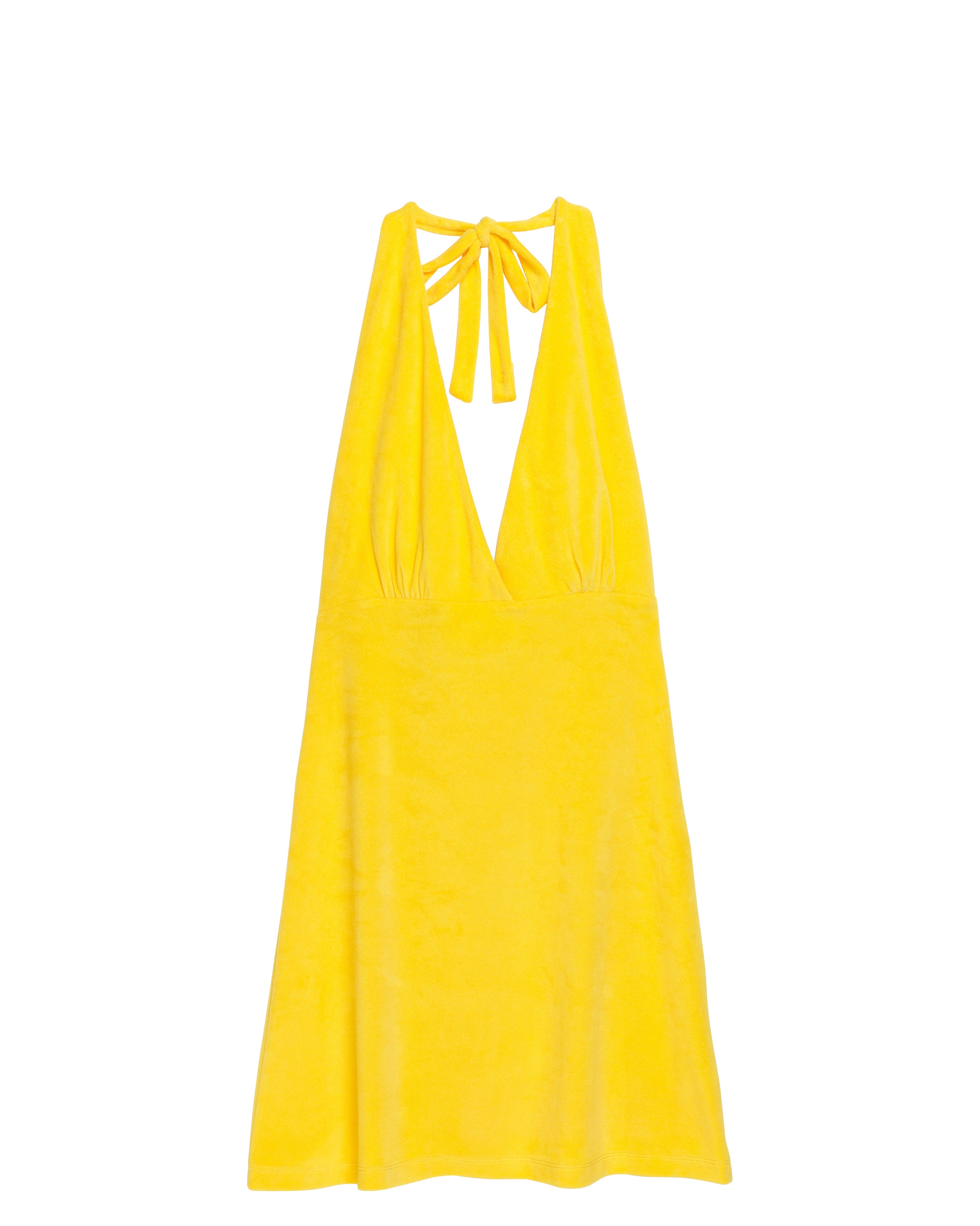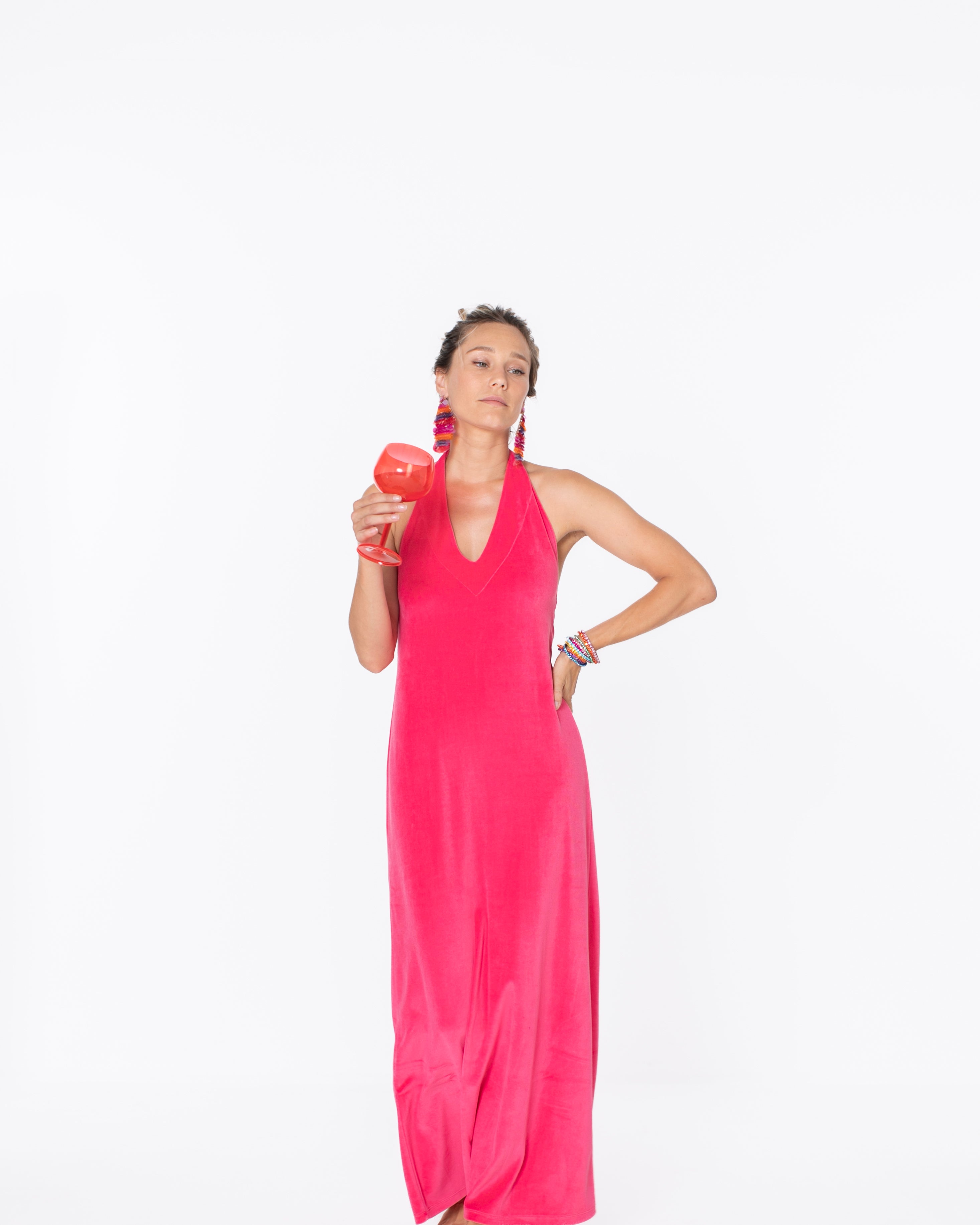 Robe Alassio, sizing regular, longue, portefeuille, décolleté en V, se noue à la taille, couleur unie, fleur marguerite brodée dans le dos.