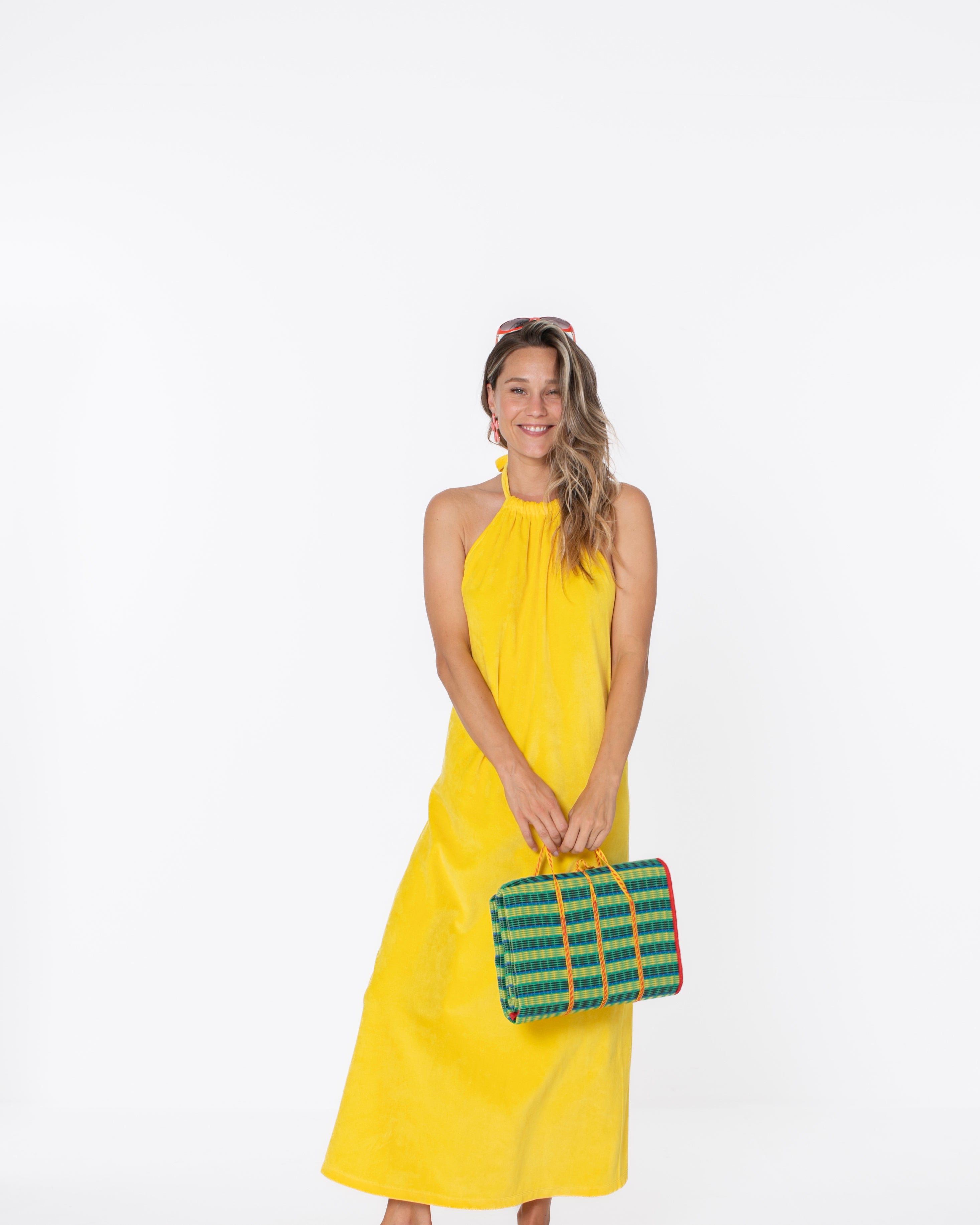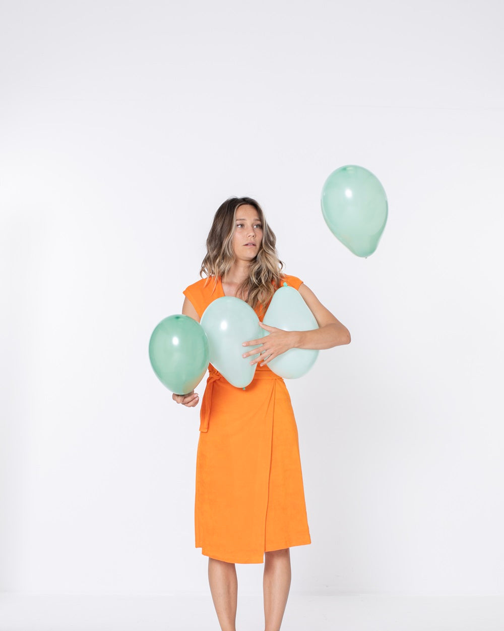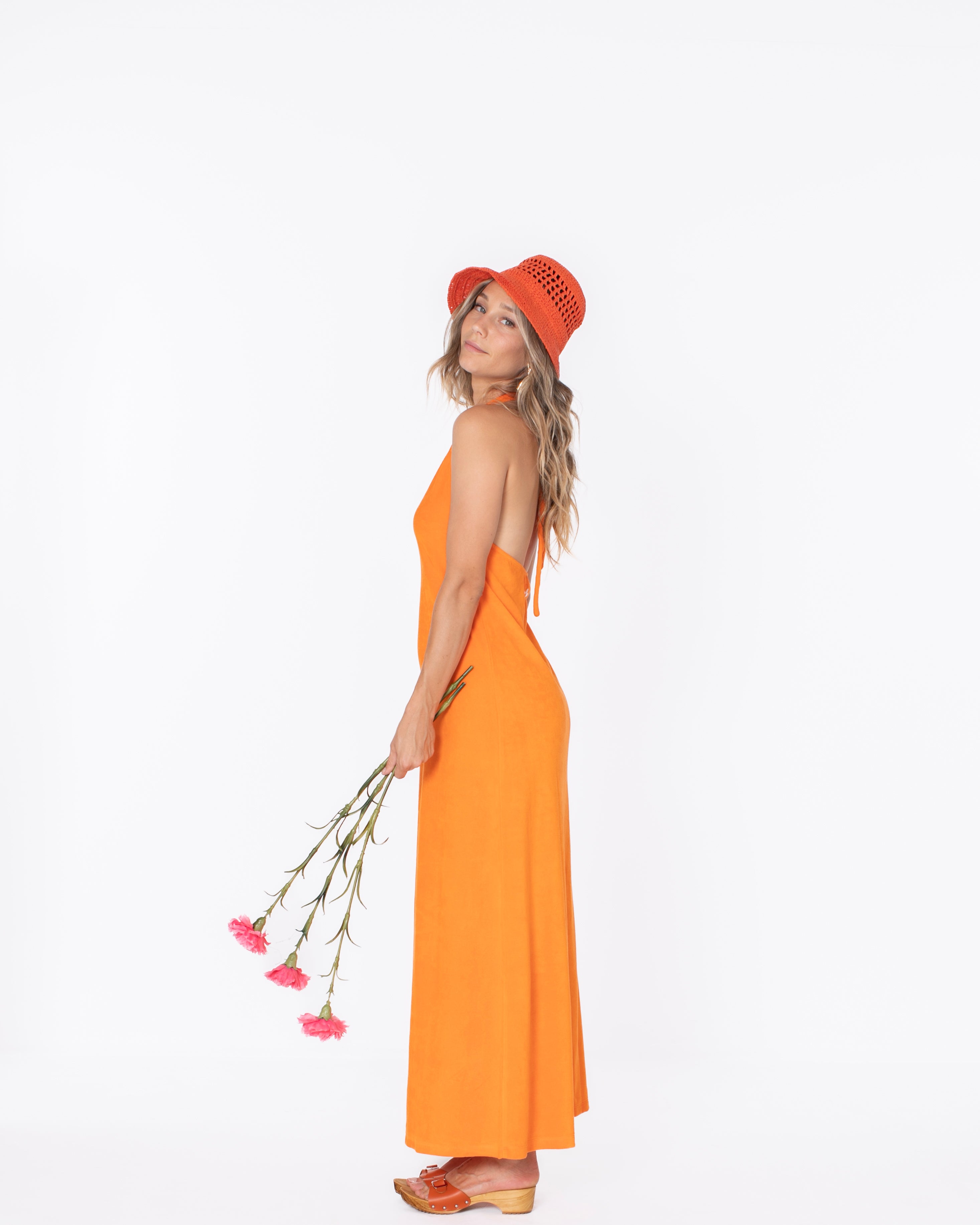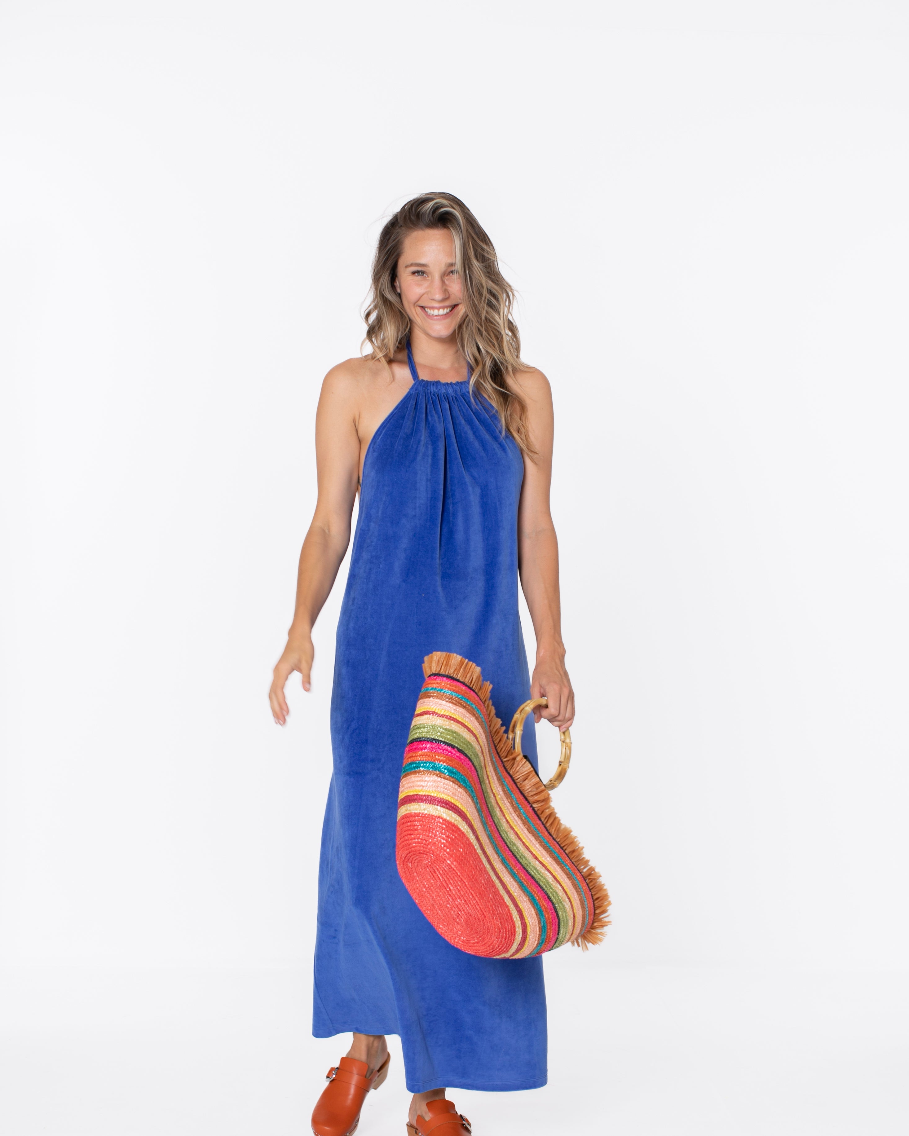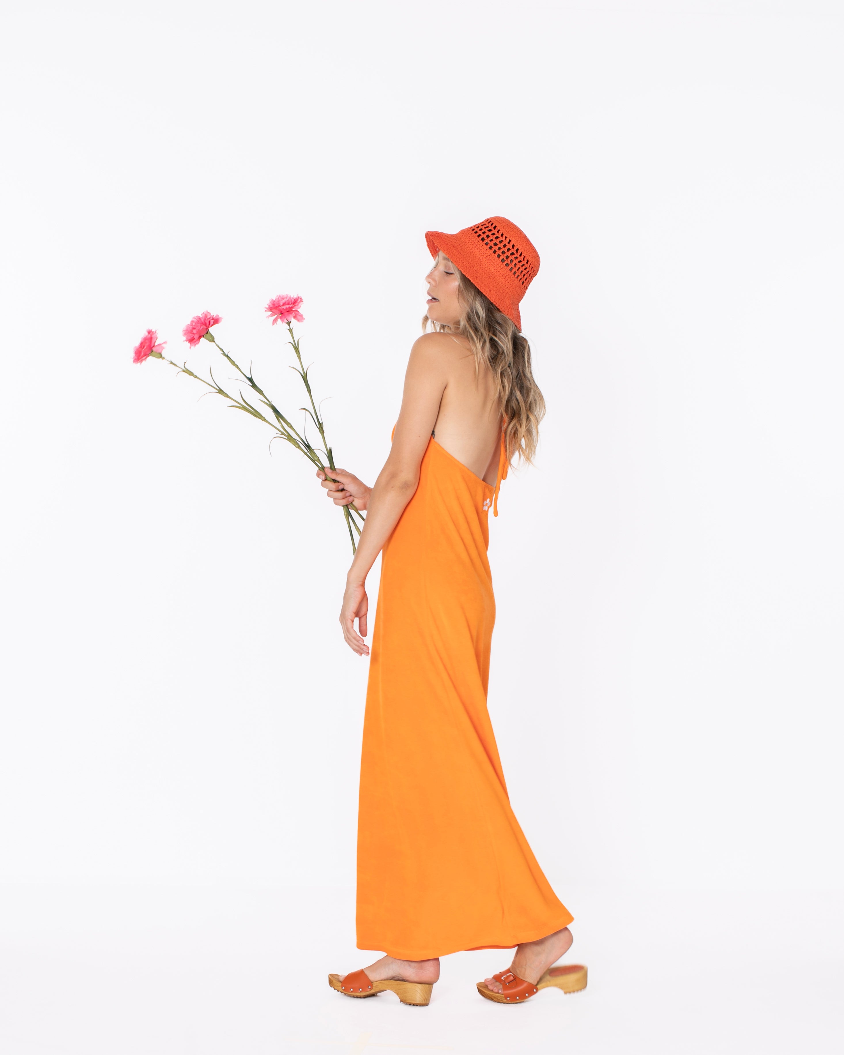 Robe Alassio, sizing regular, longue, portefeuille, décolleté en V, se noue à la taille, couleur unie, fleur marguerite brodée dans le dos.