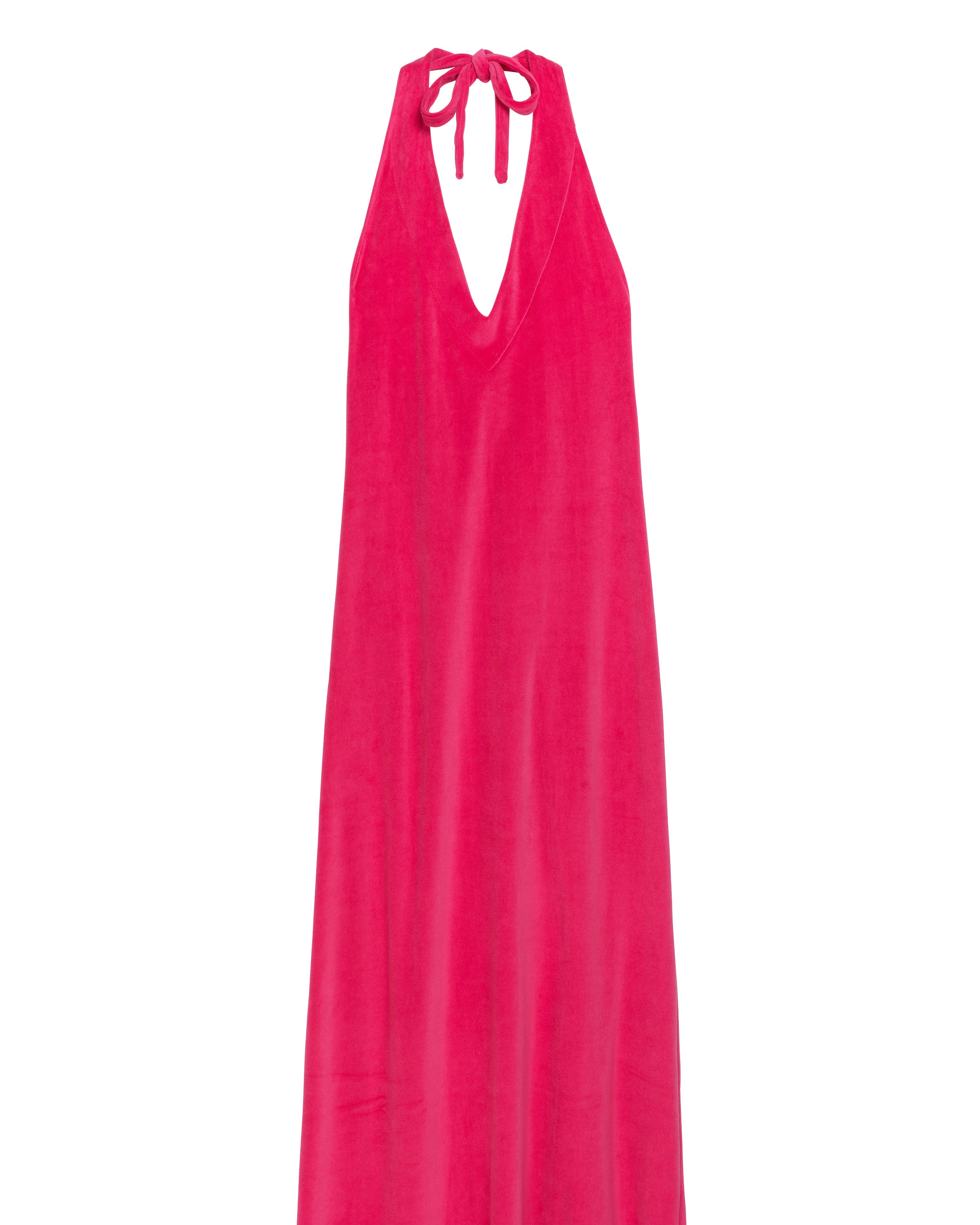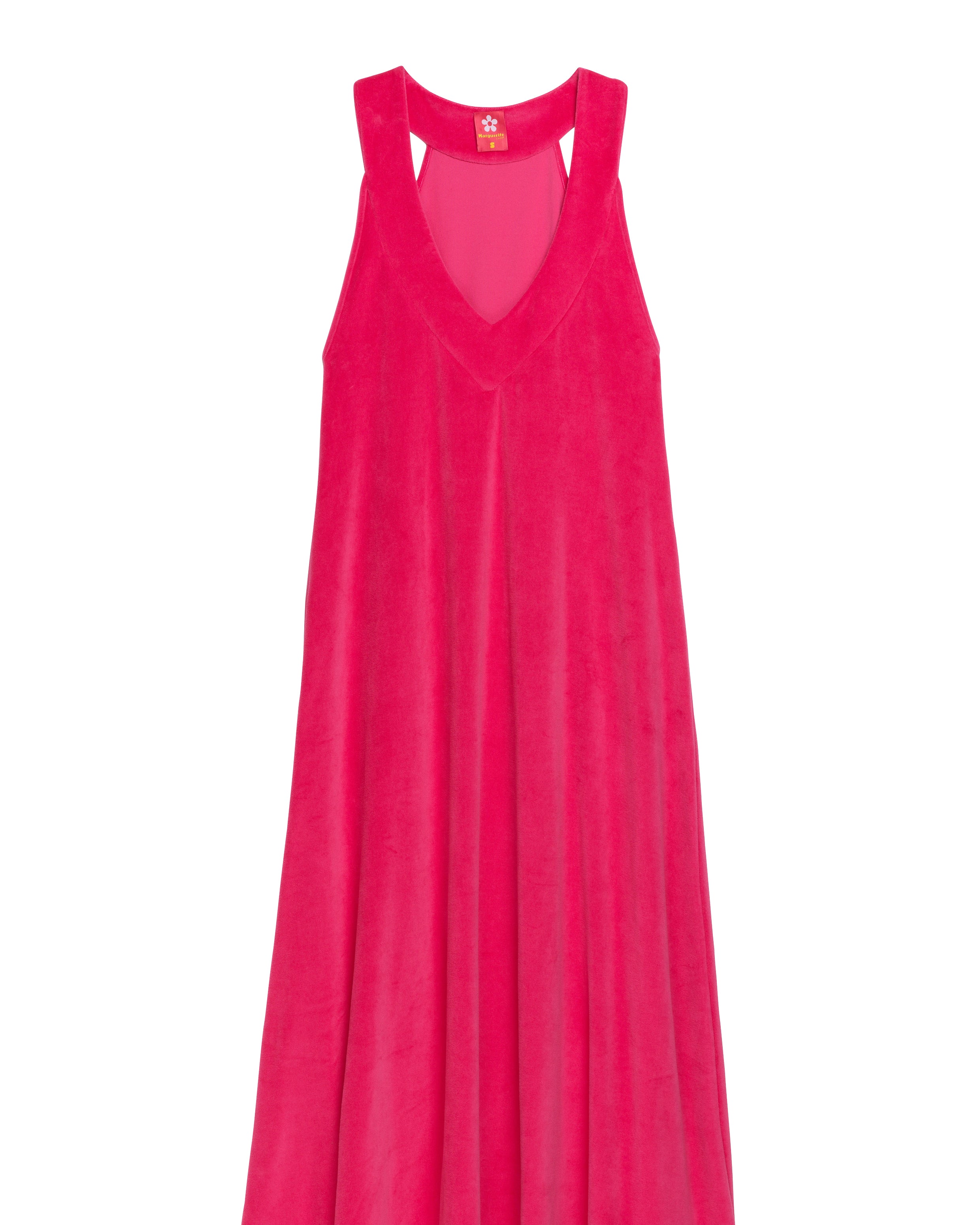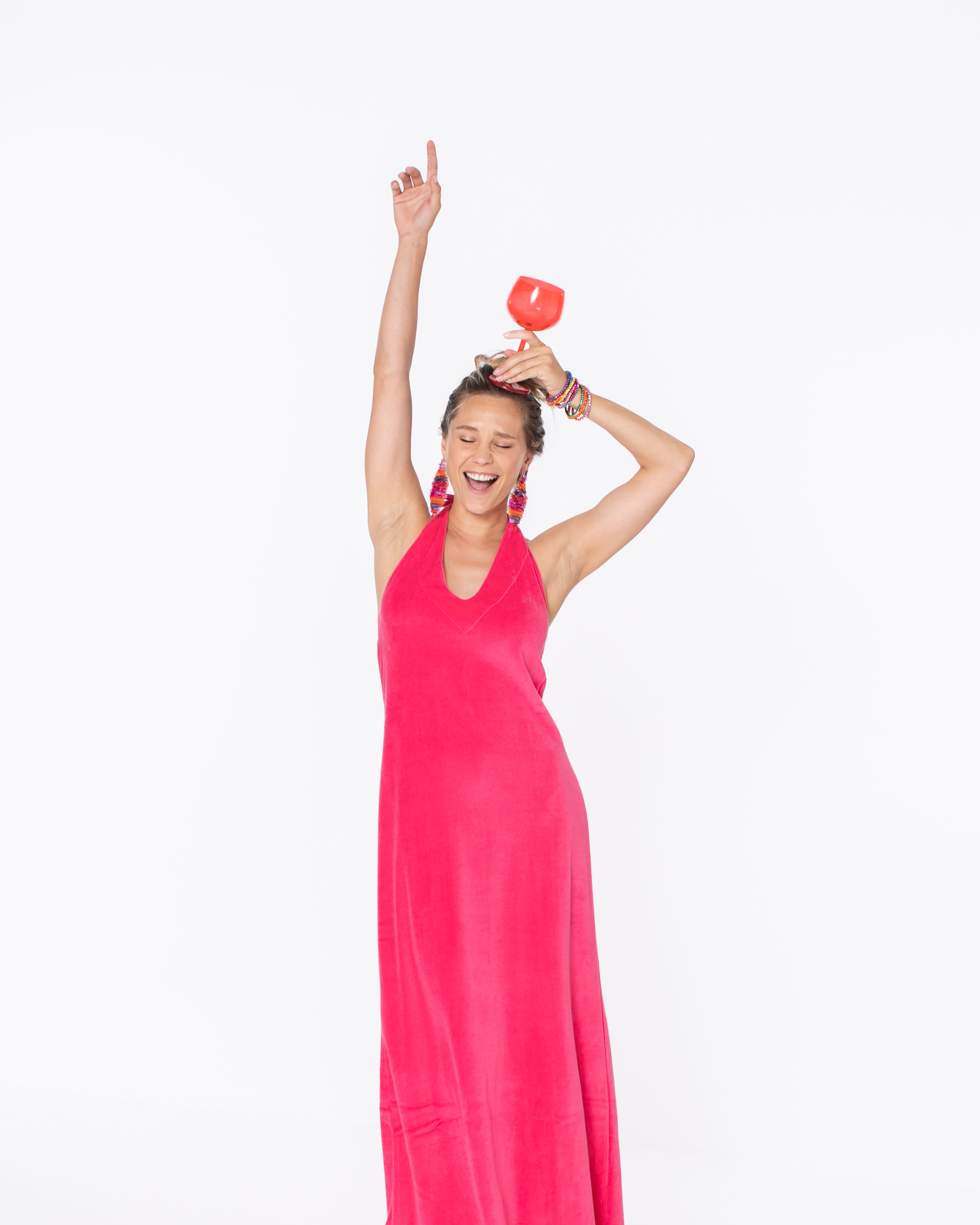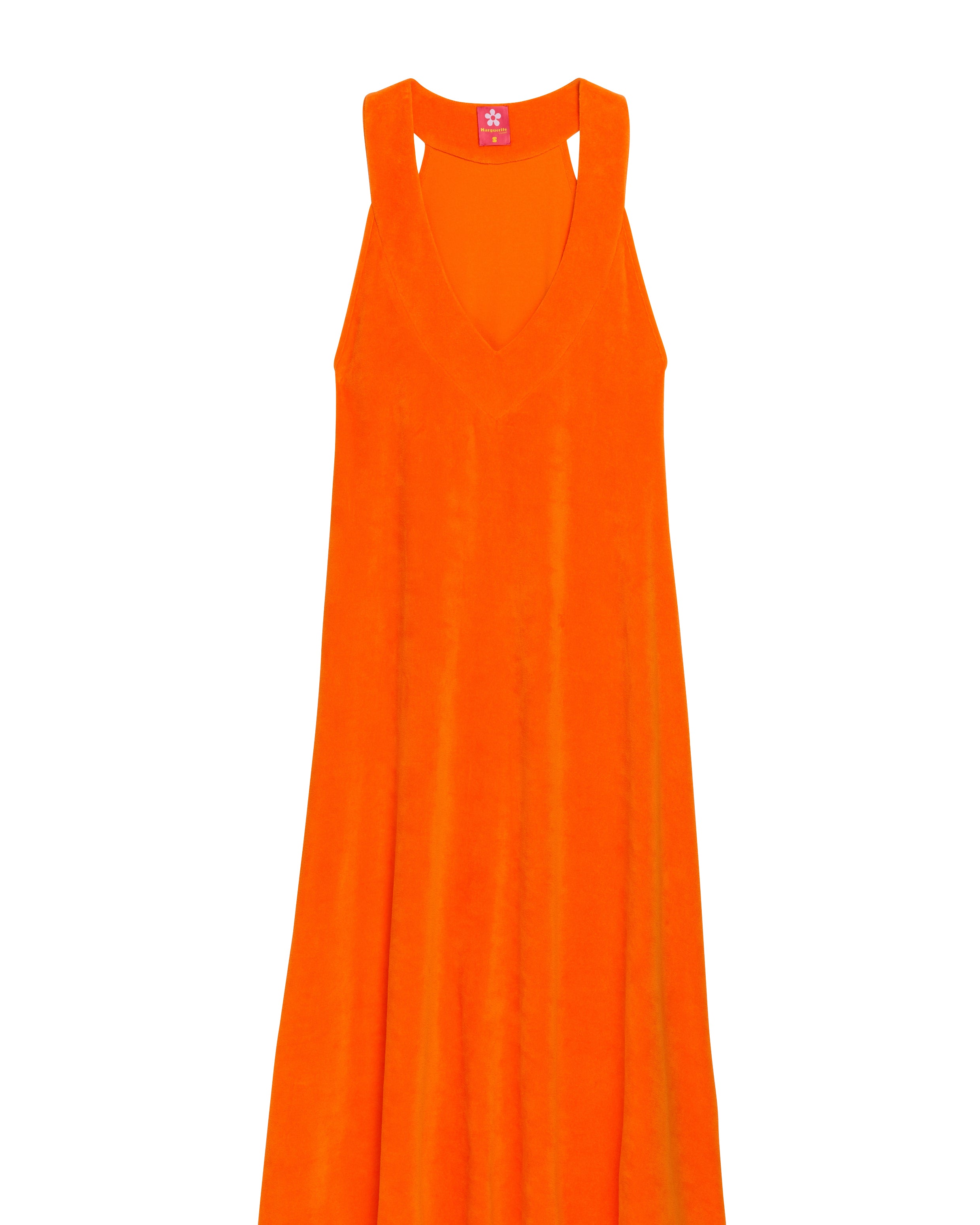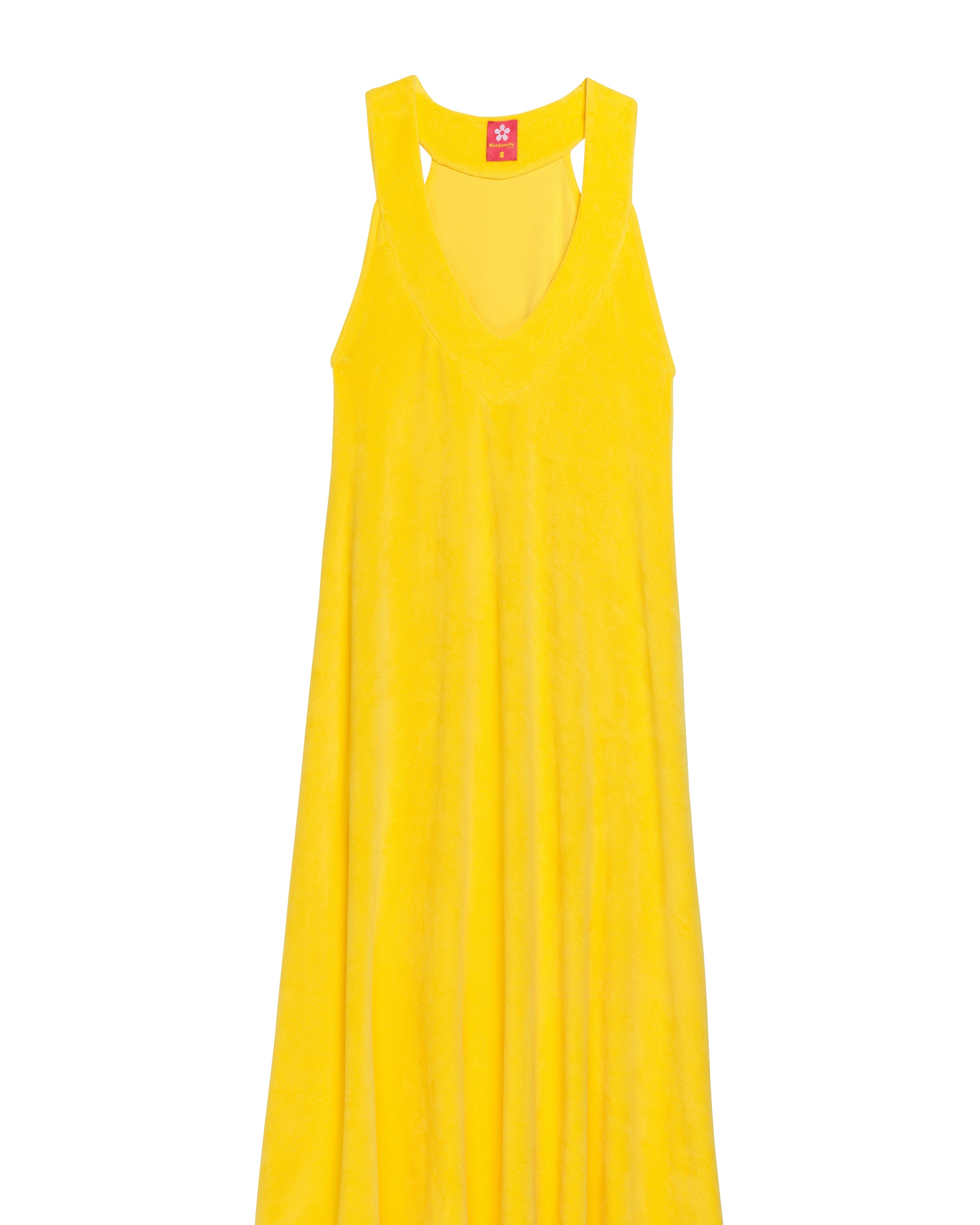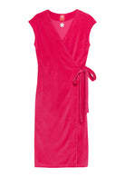 Robe Alassio, sizing regular, longue, portefeuille, décolleté en V, se noue à la taille, couleur unie, fleur marguerite brodée dans le dos.