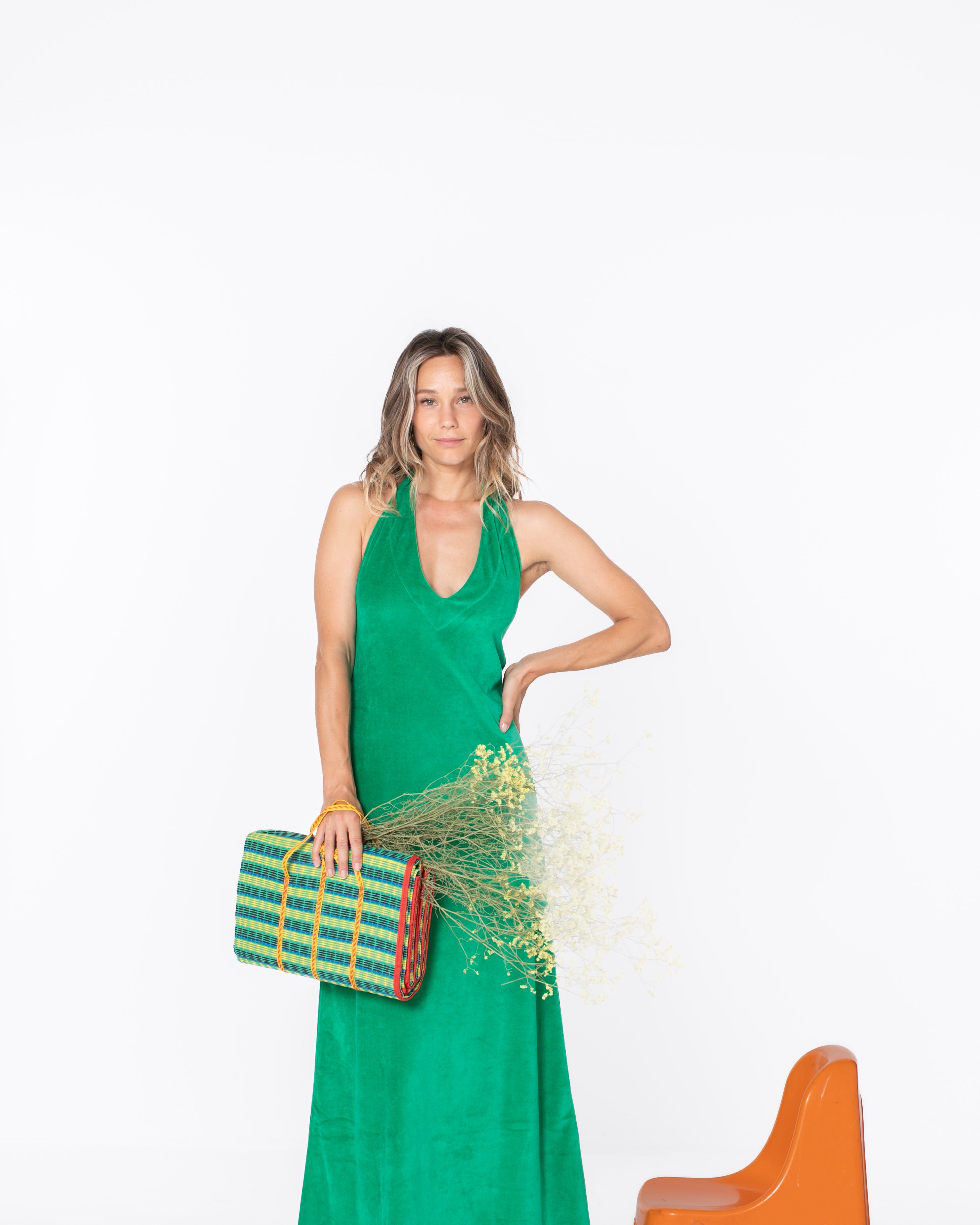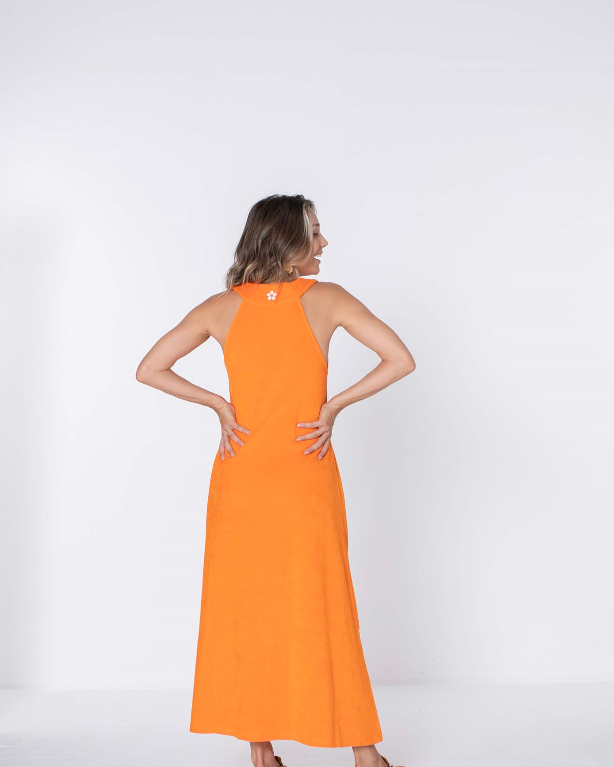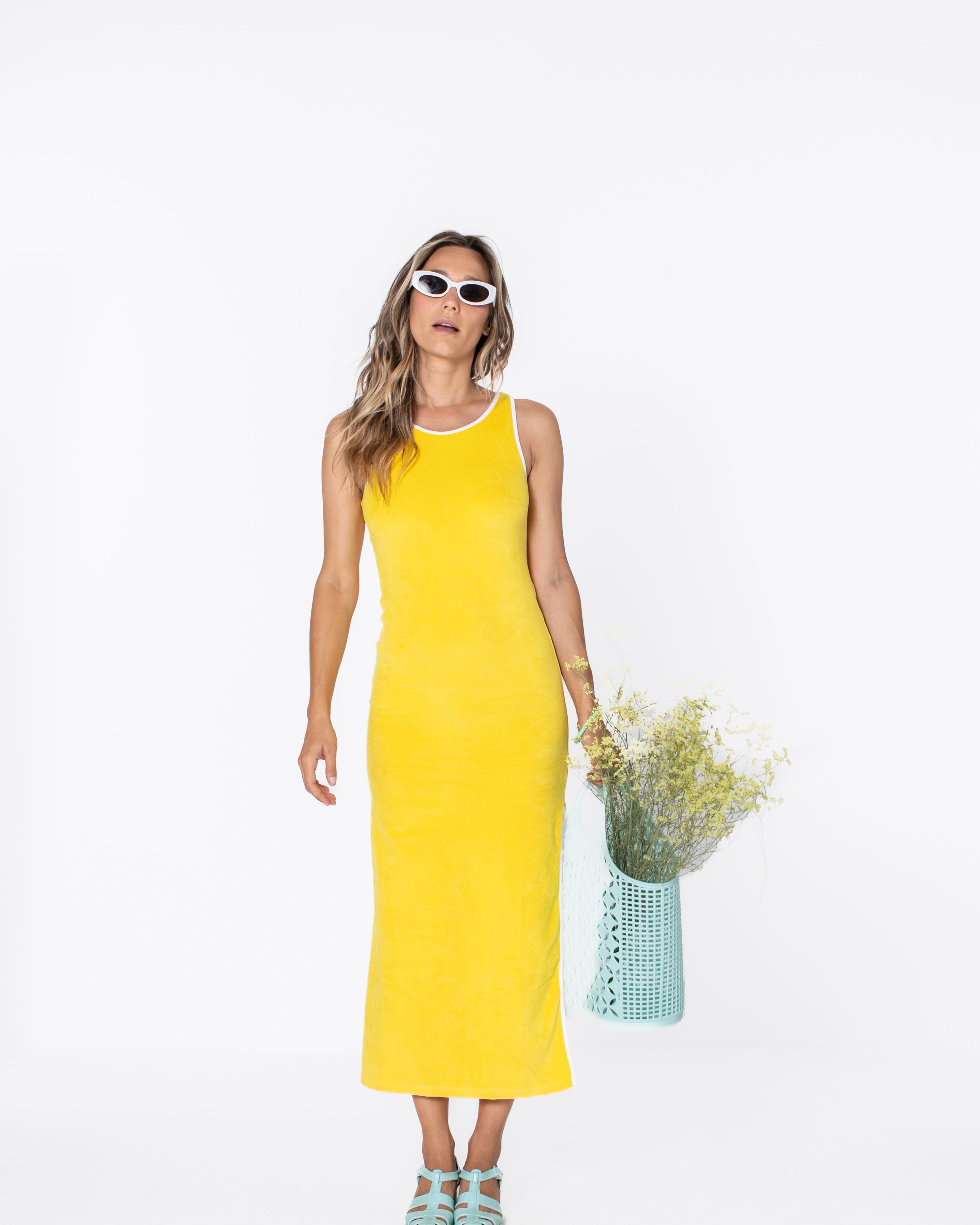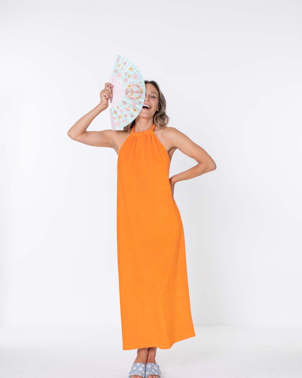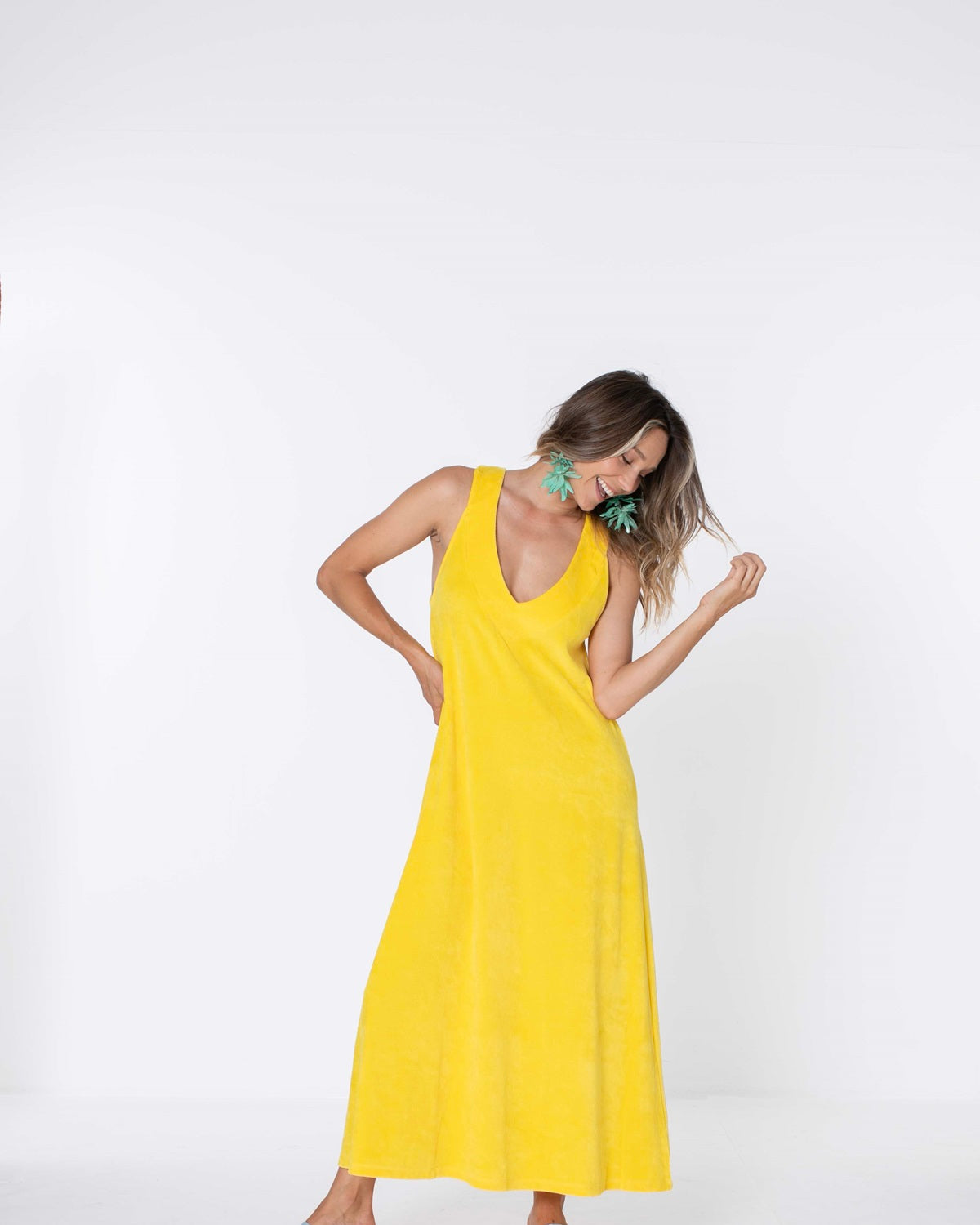 Robe Alassio, sizing regular, longue, portefeuille, décolleté en V, se noue à la taille, couleur unie, fleur marguerite brodée dans le dos.