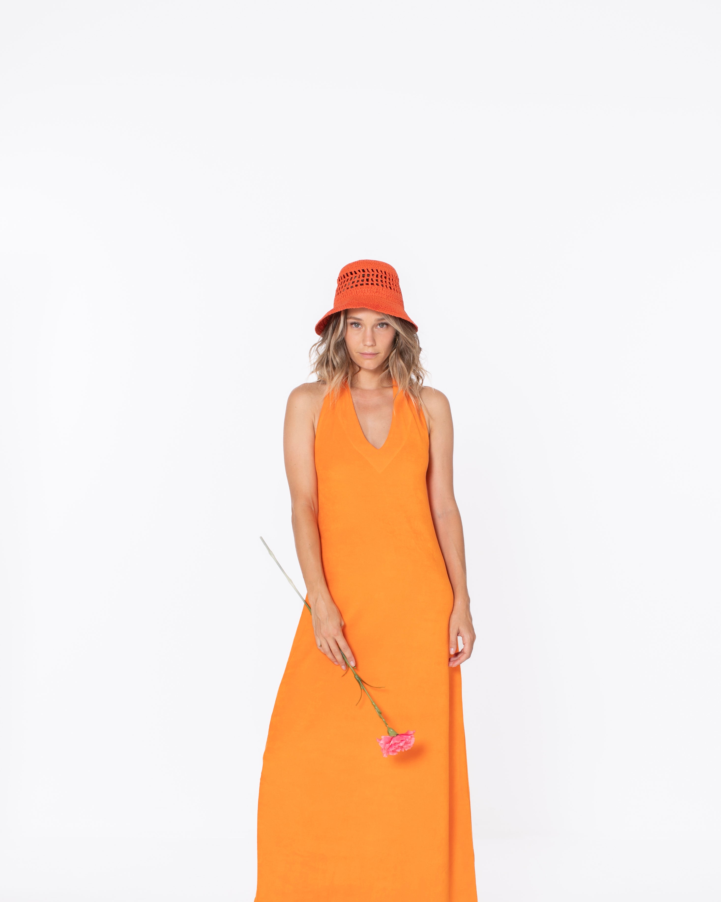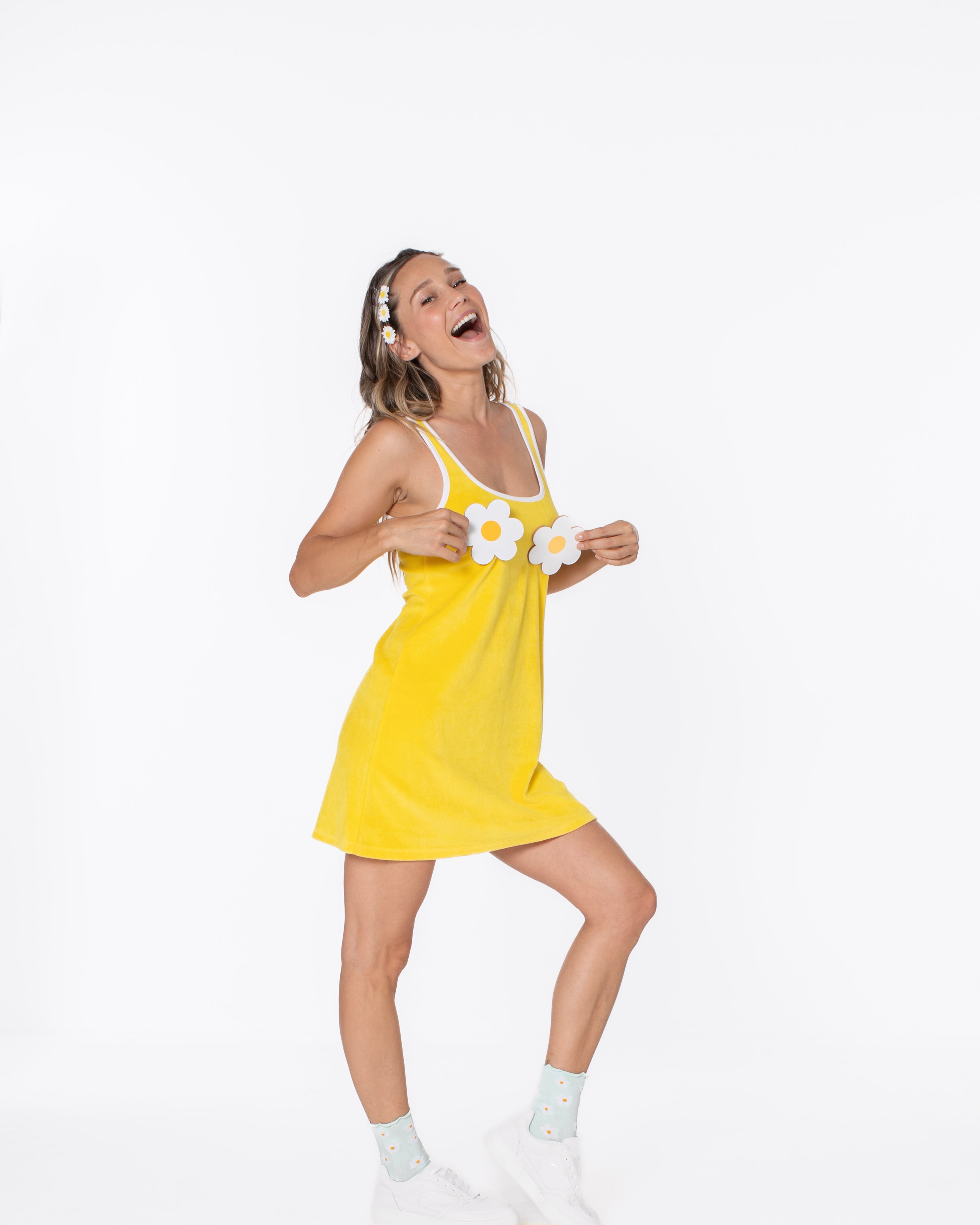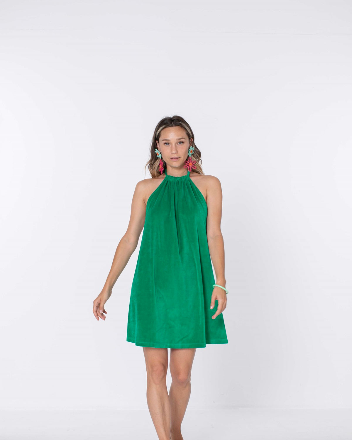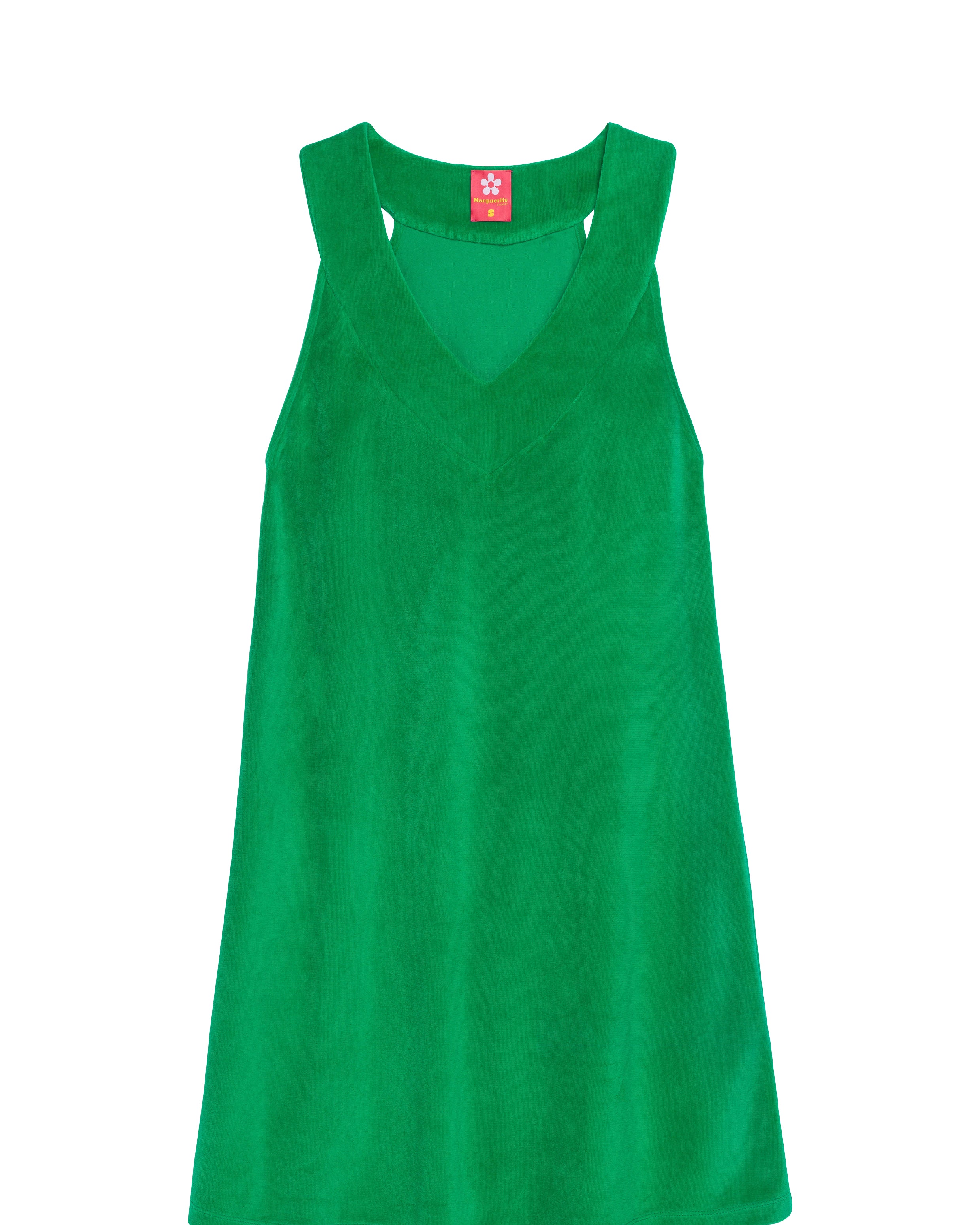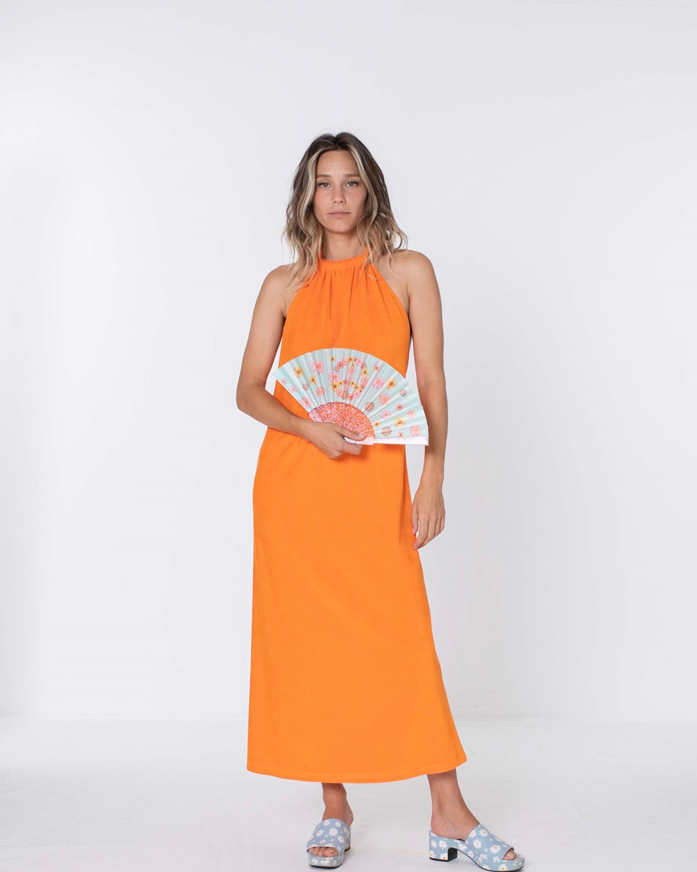 Robe Alassio, sizing regular, longue, portefeuille, décolleté en V, se noue à la taille, couleur unie, fleur marguerite brodée dans le dos.