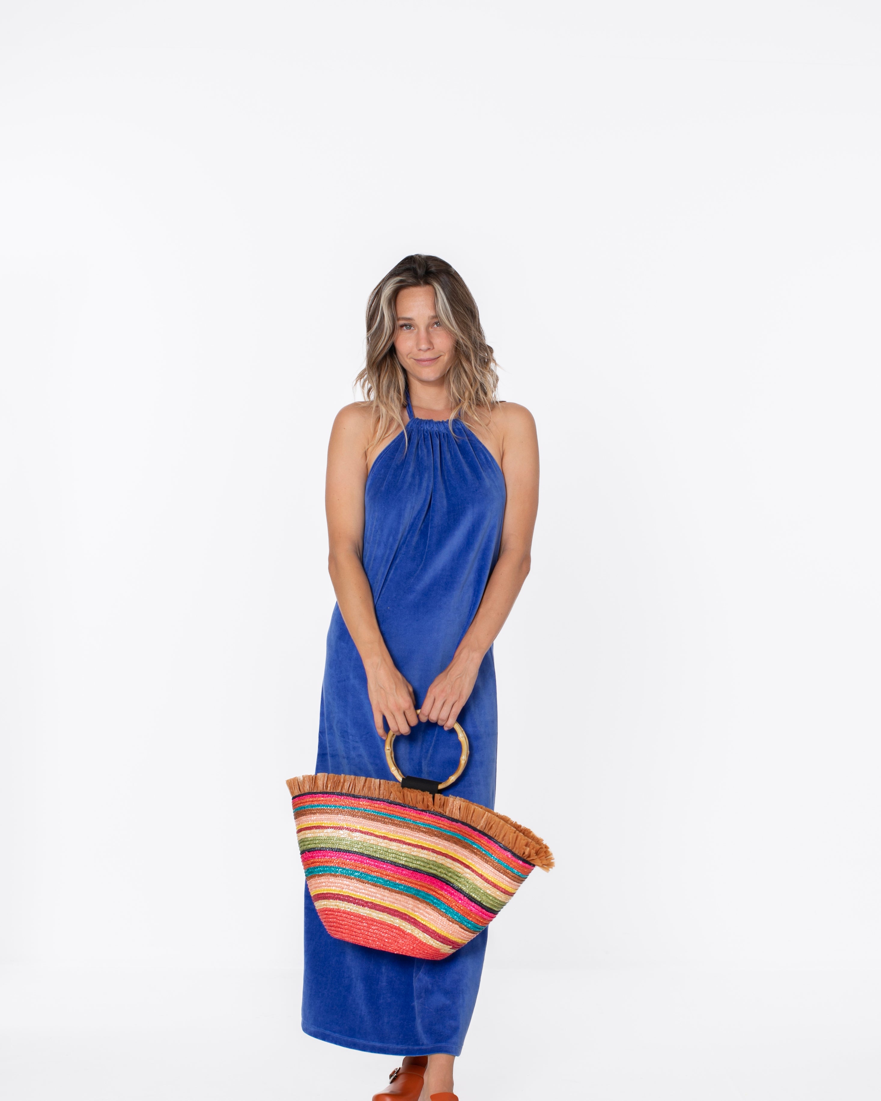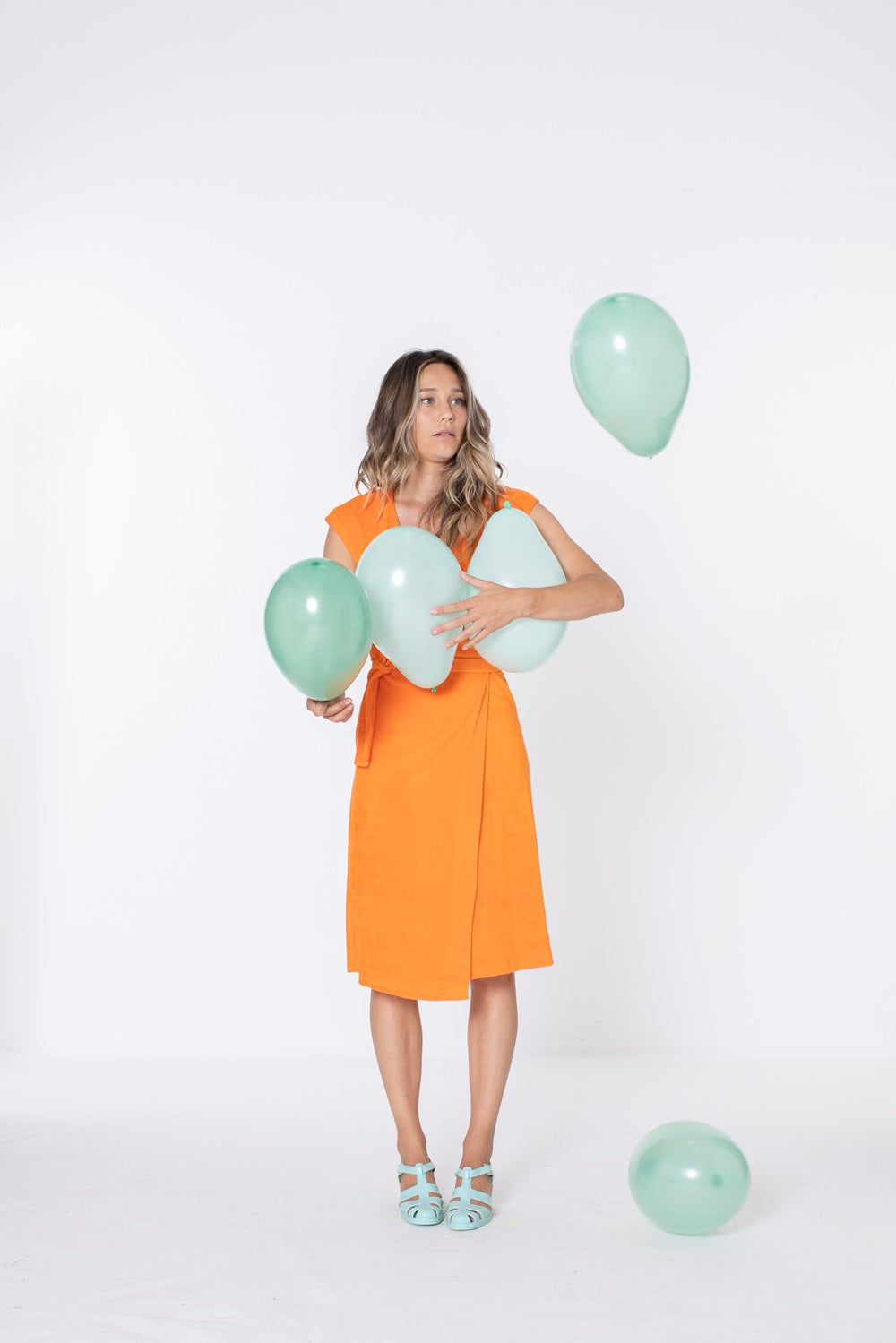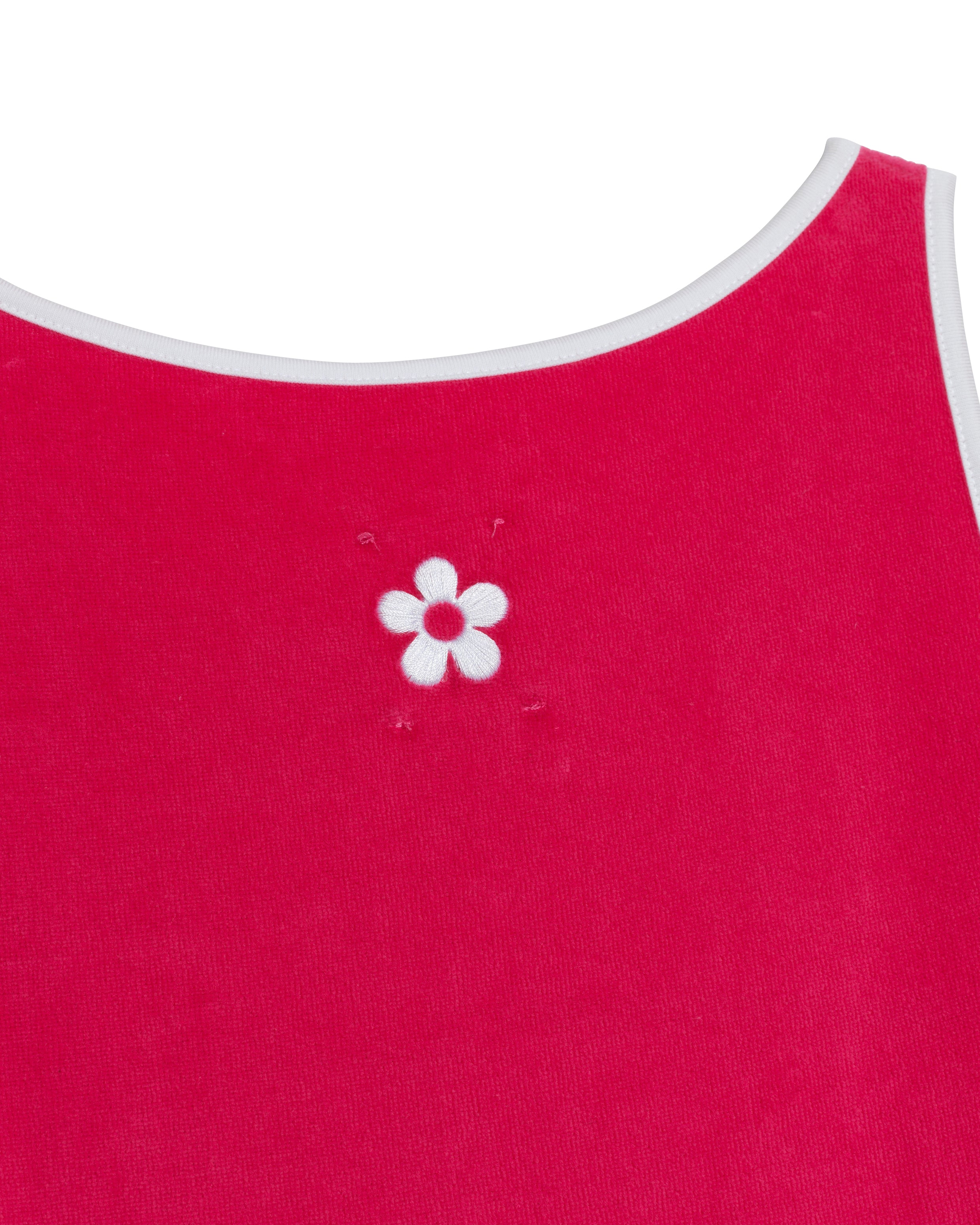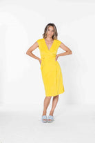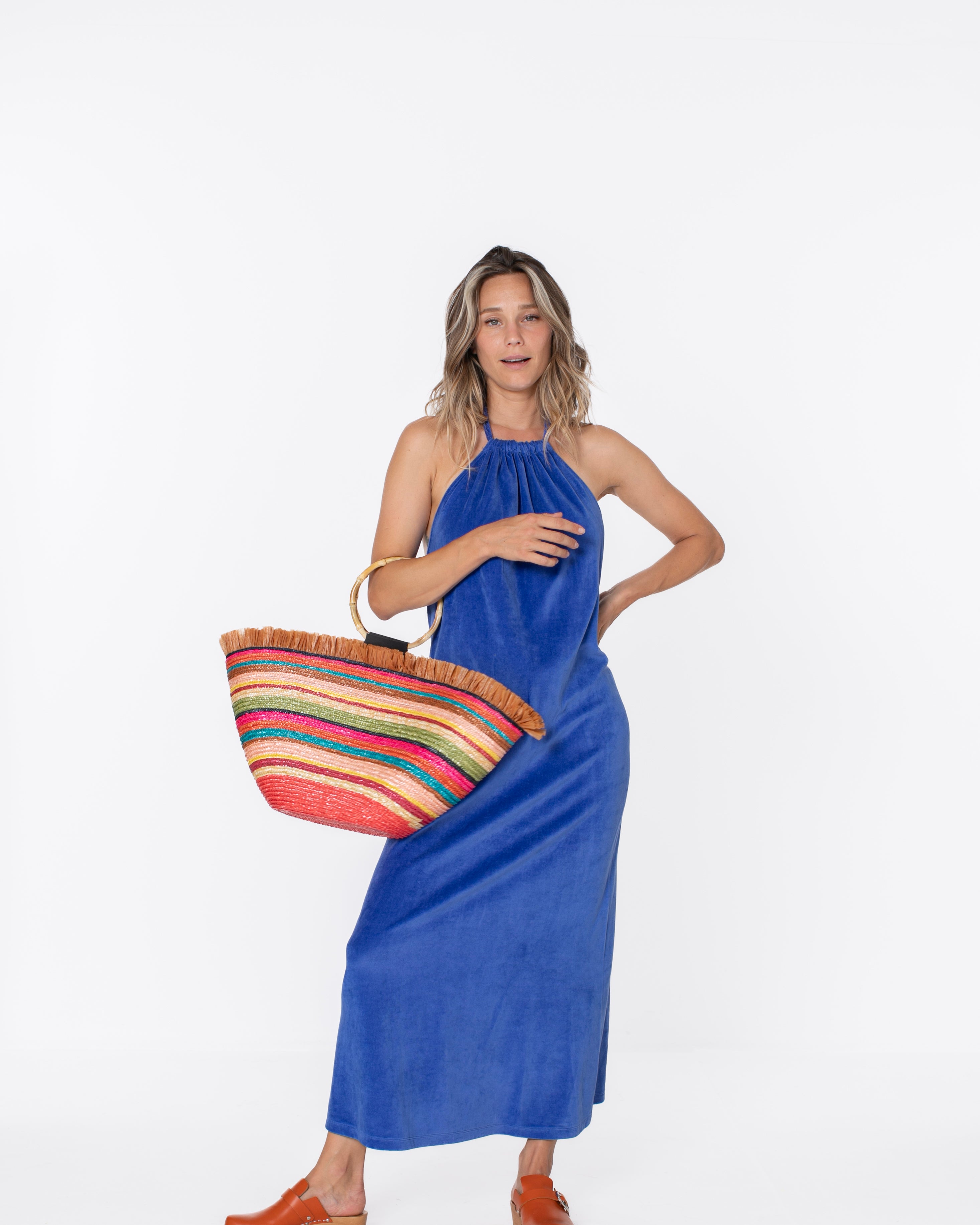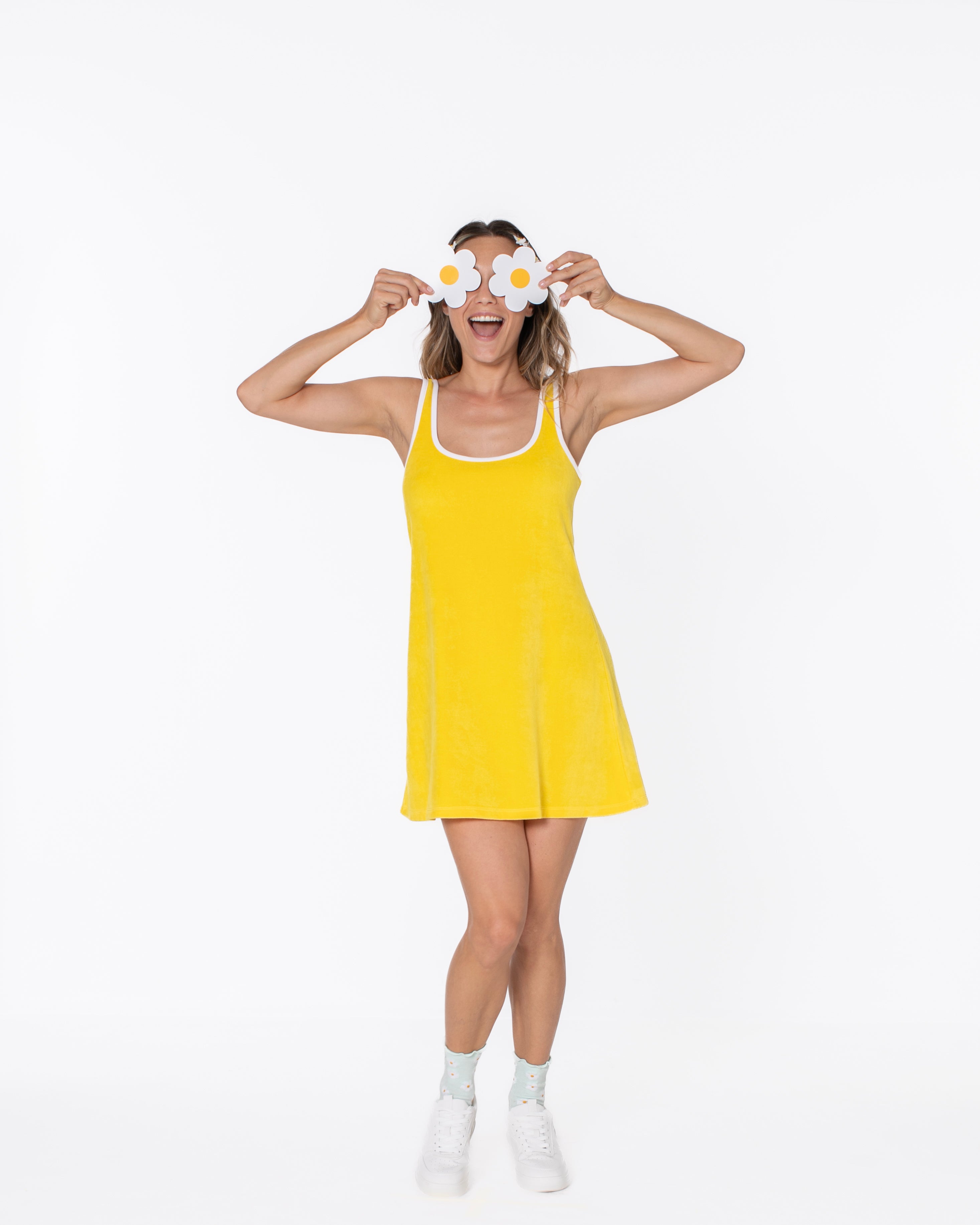 Robe Alassio, sizing regular, longue, portefeuille, décolleté en V, se noue à la taille, couleur unie, fleur marguerite brodée dans le dos.