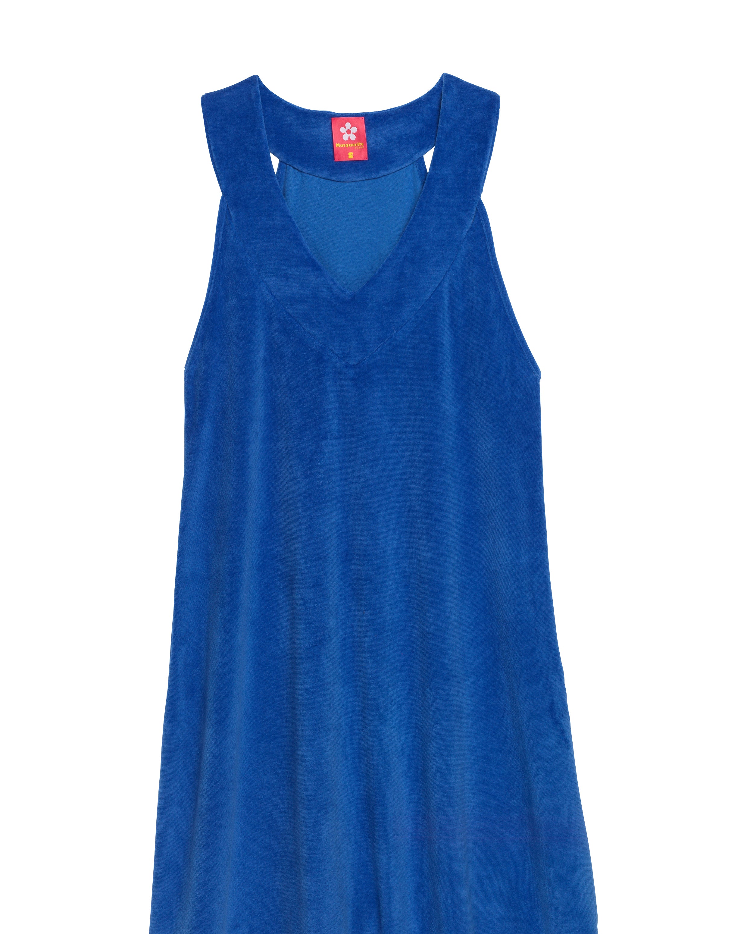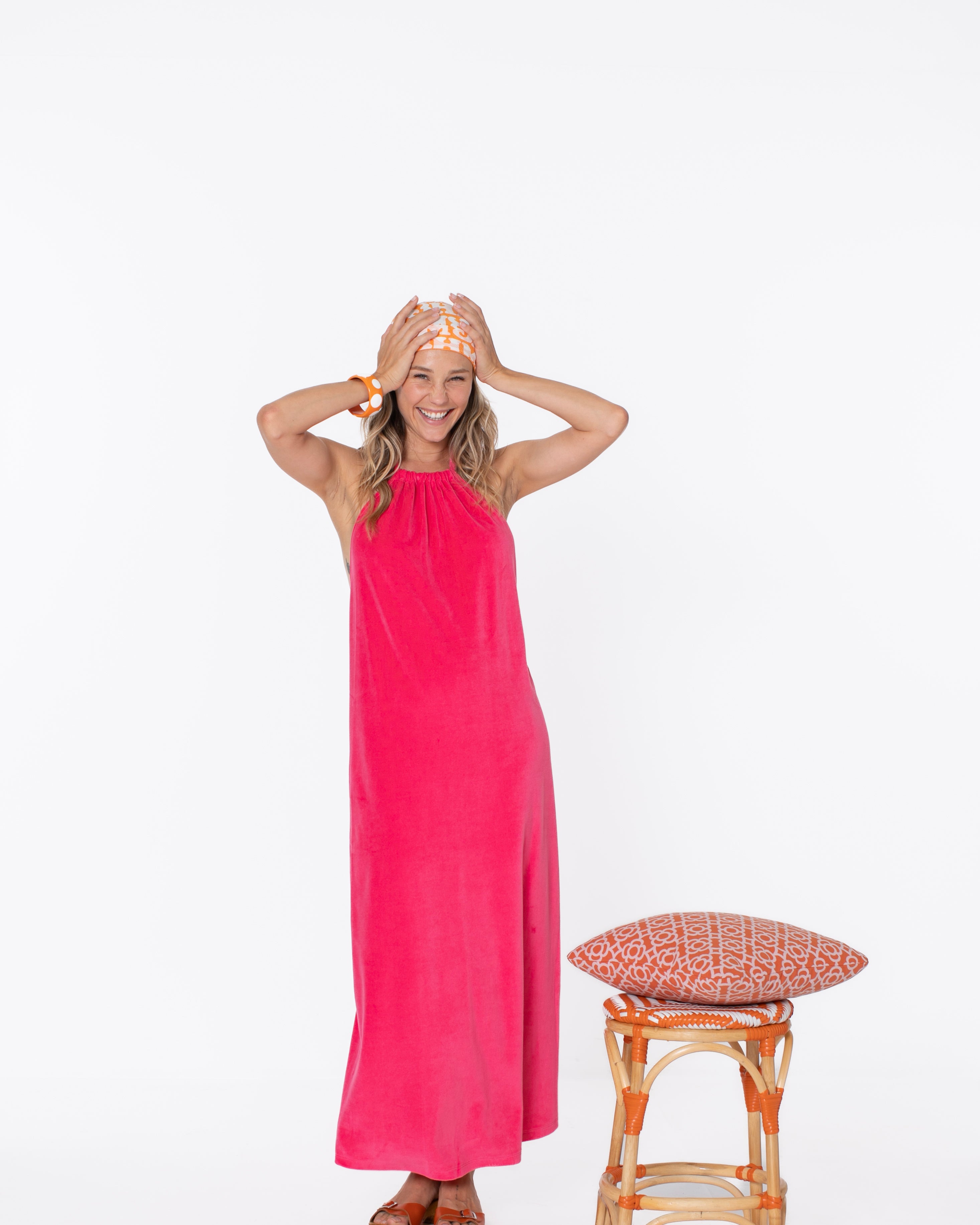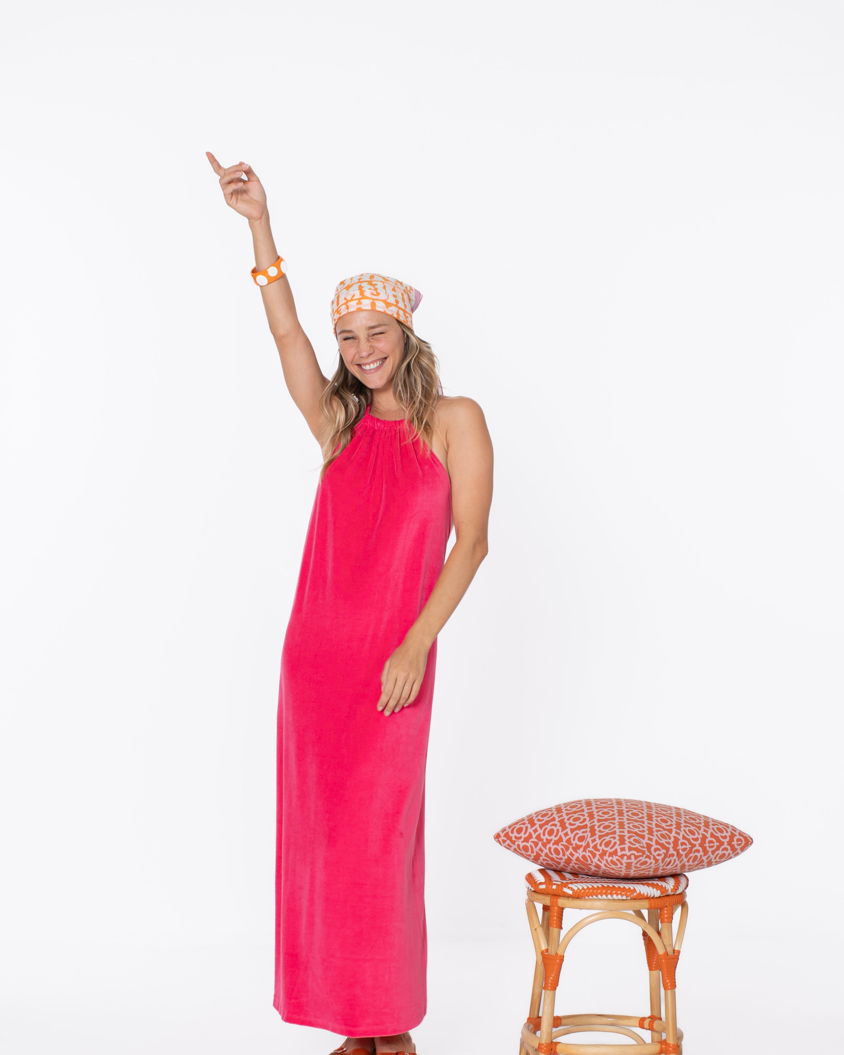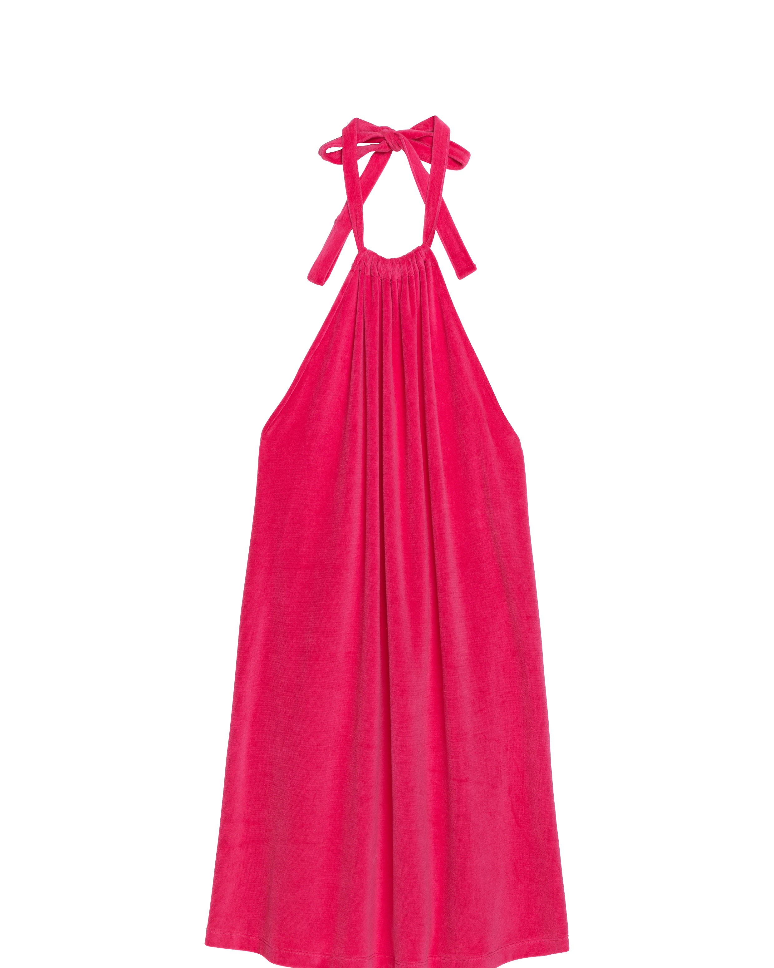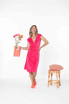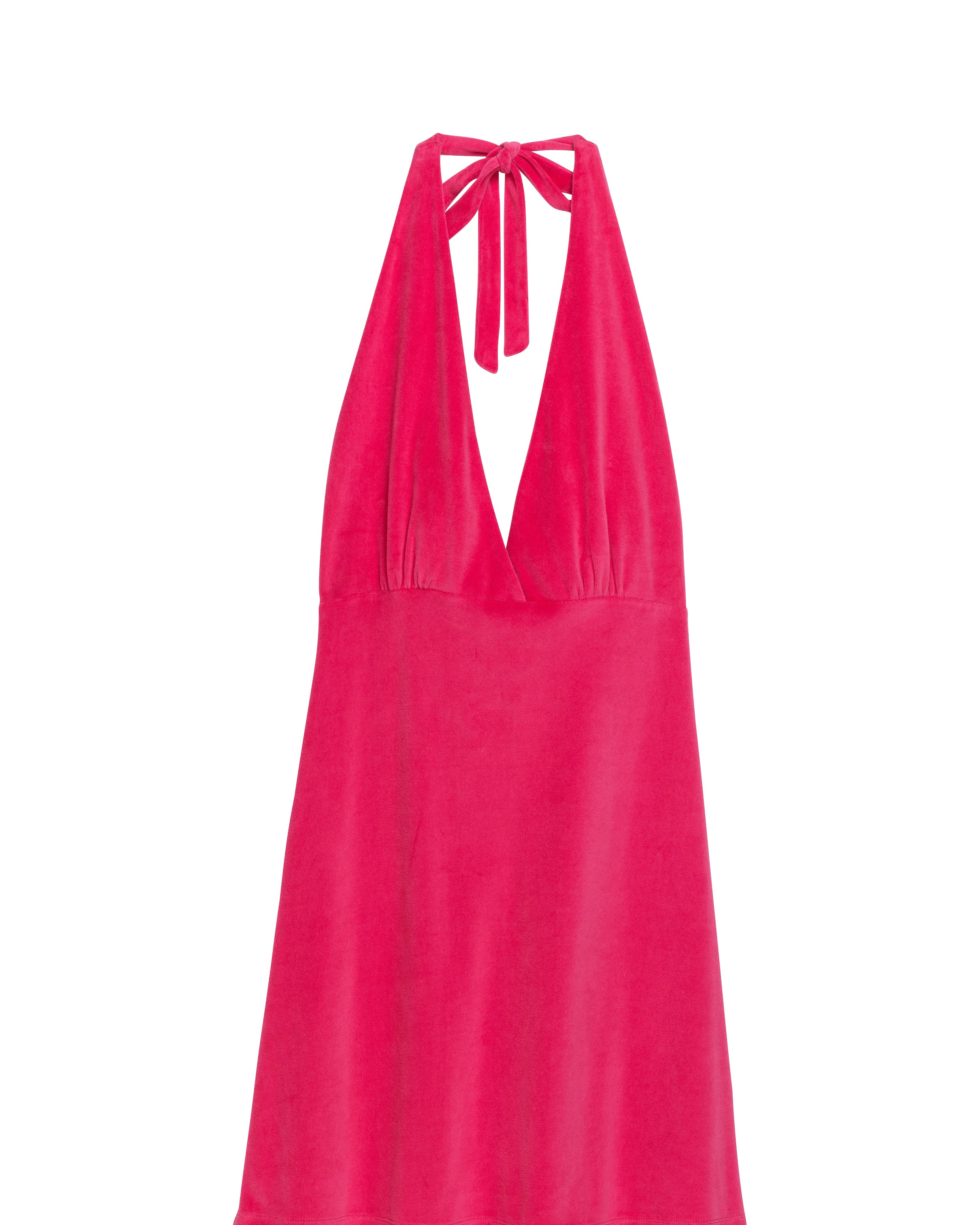 Robe Alassio, sizing regular, longue, portefeuille, décolleté en V, se noue à la taille, couleur unie, fleur marguerite brodée dans le dos.